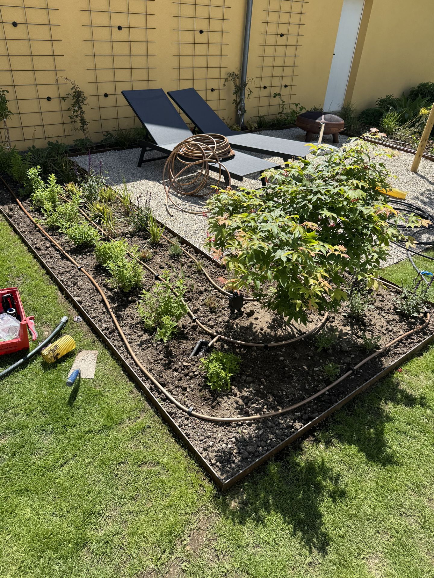 Damit die Pflanzen trotz der zunehmenden Trockenheit gut mit Feuchtigkeit versorgt sind, haben sich unsere Auftraggeber für die Installation eines über das Smartphone steuerbaren Bewässerungssystems entschieden. Die Staudenbeete, Bäume und Hecken werden von einer Tropfbewässerung versorgt, im Rasen wurden Versenkregner installiert. Ein schönes Projekt, das uns viel Freude gemacht hat!