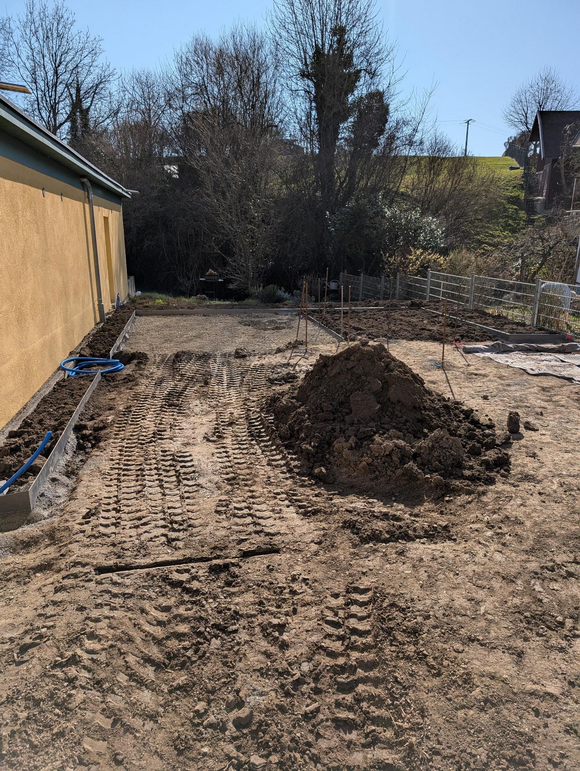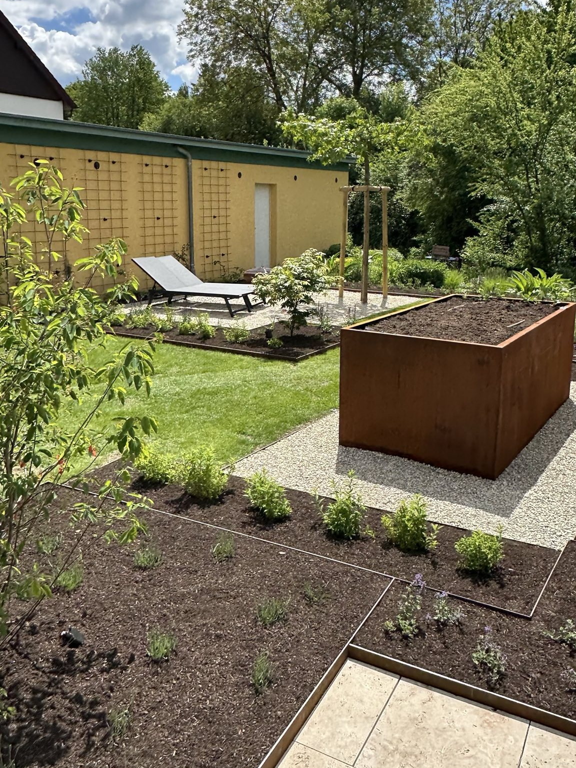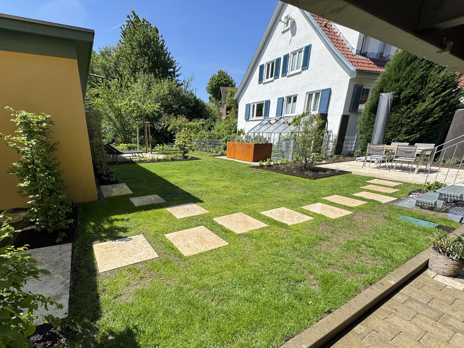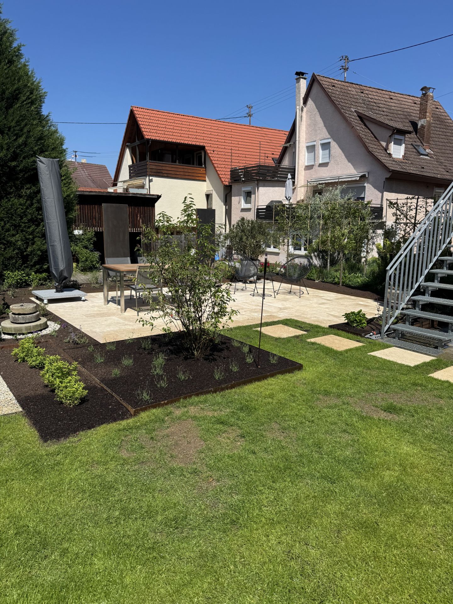 Ein kleines Schmuckstück wurde von uns im Juni 2025 in Metzingen-Neuhausen fertiggestellt. Der Hausgarten mit nur ca. 200 Quadratmetern bestand zuvor fast nur aus einer Rasenfläche. Im ersten Halbjahr 2025 haben unsere Mitarbeitenden dort eine große Terrasse aus Travertin-Natursteinpflaster geschaffen, außerdem einen mit Feinkies gestaltete und von einem Amberbaum beschatteten Ruhebereich mit zwei Liegestühlen sowie ein Hochbeet für Kräuter und Gemüse. Eine großzügige Bepflanzung mit Gehölzen und Stauden entlang den Grundstücksgrenzen sorgt für die nötige Privatsphäre nach außen und eine Abgrenzung der einzelnen Gartenbereiche untereinander. Auch die Garagenwände neben dem Ruhebereich erhielten eine Begrünung.