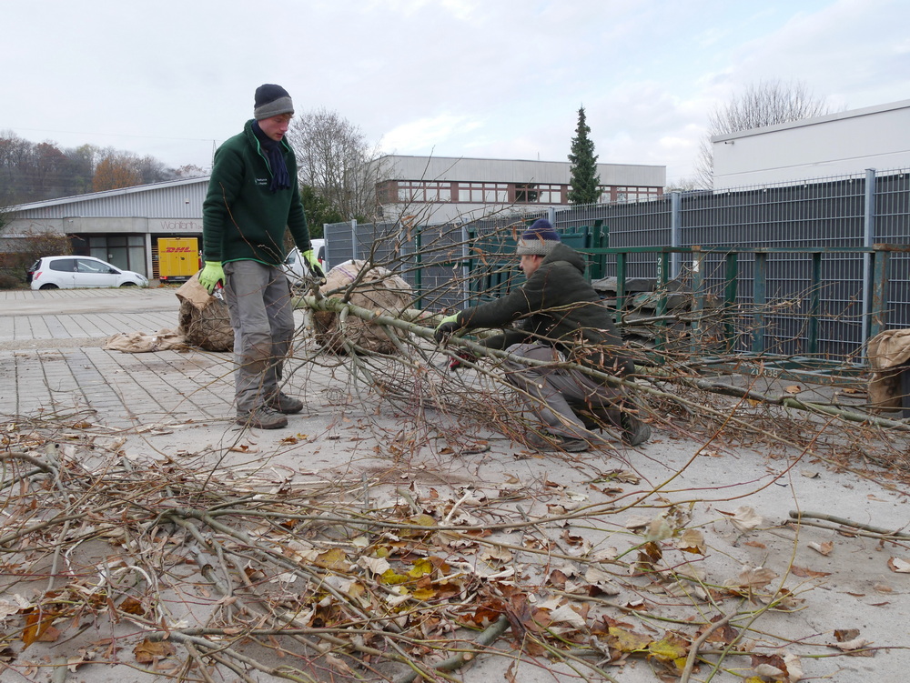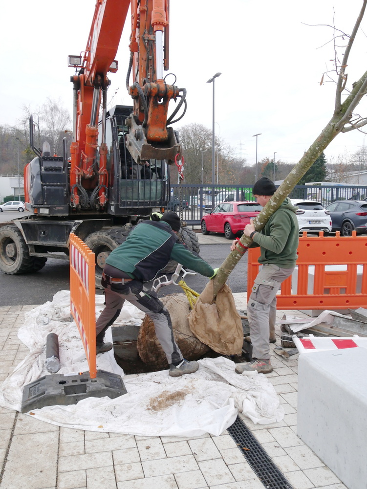 Zunächst mussten die Pflanzlöcher ausgehoben werden. Nach dem Pflanzschnitt wurden die fünf bis sieben Meter hohen Bäume von unseren Mitarbeitenden mit Unterstützung eines großen Baggers gesetzt. Beim Ausrichten der samt Erdballen rund 800 kg schweren Gehölze war voller Körpereinsatz gefragt.