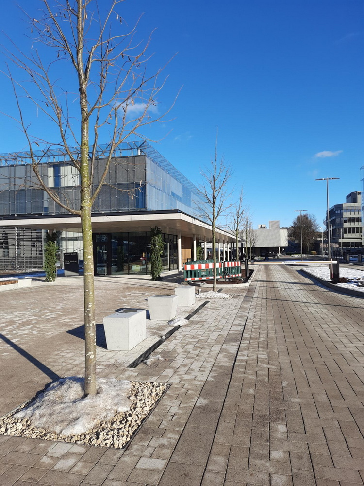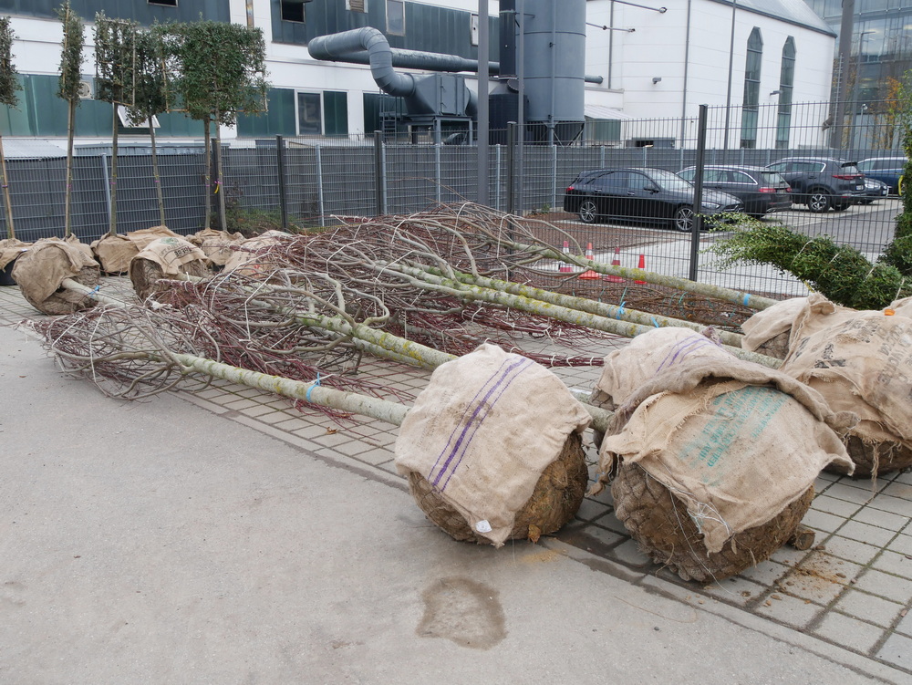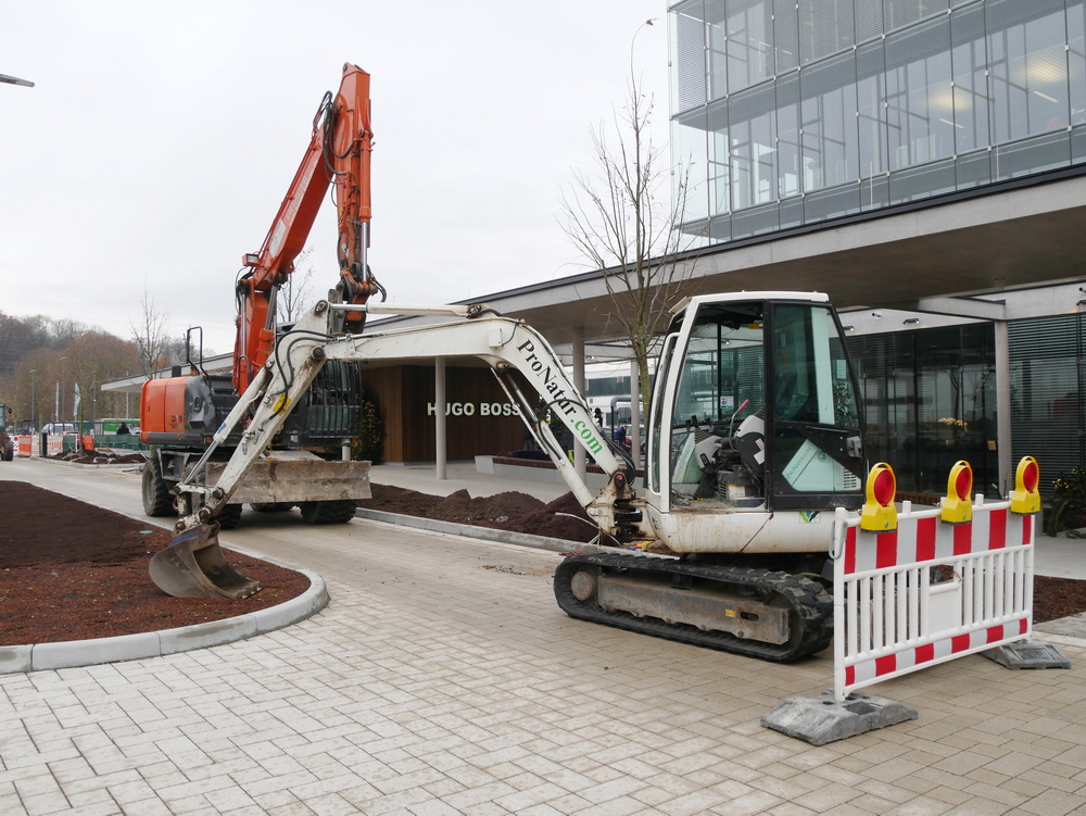 Vergangene Woche haben wir mit den Baumpflanzarbeiten im Eingangsbereich des Hugo-Boss-Campus in Metzingen begonnen. Rund 30 große Gehölze wurden Anfang der Woche dafür angeliefert. Die Zufahrtsstraße mit dem Namen „Holy Allee“ soll künftig von Linden gesäumt werden, Hecken und Staudenrabatten runden das grüne und blühende Bild ab.