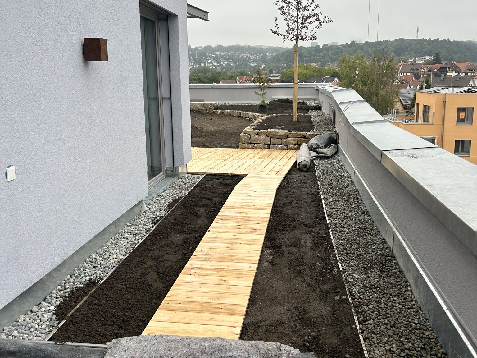 Der kleine Dachgarten im dritten Obergeschoss eines neu gebauten Mehrfamilienhauses in Tübingen, den wir euch Anfang September bereits vorgestellt hatten, nimmt Gestalt an. Mittlerweile sind der Holzsteg und die Terrasse ebenso wie die meisten Trockenmauern fertiggestellt. Auch die Gehölze haben wir schon gepflanzt. Die Treppe aus 200 Jahre alten Bebenhäuser Dachplatten ist ein ganz besonderes Schmuckstück geworden. Momentan widmen wir uns noch dem Sitzplatz mit Polygonalplattenbelag und der Außendusche. Es wird nicht mehr lange dauern, bis dieses kleine Schmuckstück hoch über den Dächern des neuen Quartiers Aeulehöfe fertiggestellt ist.