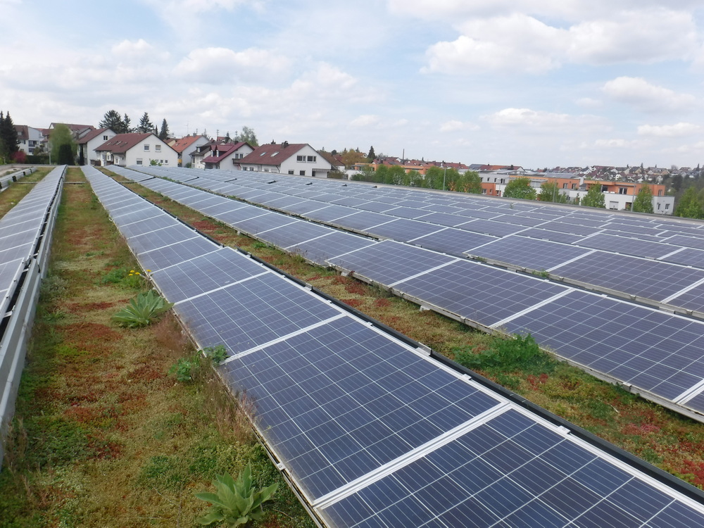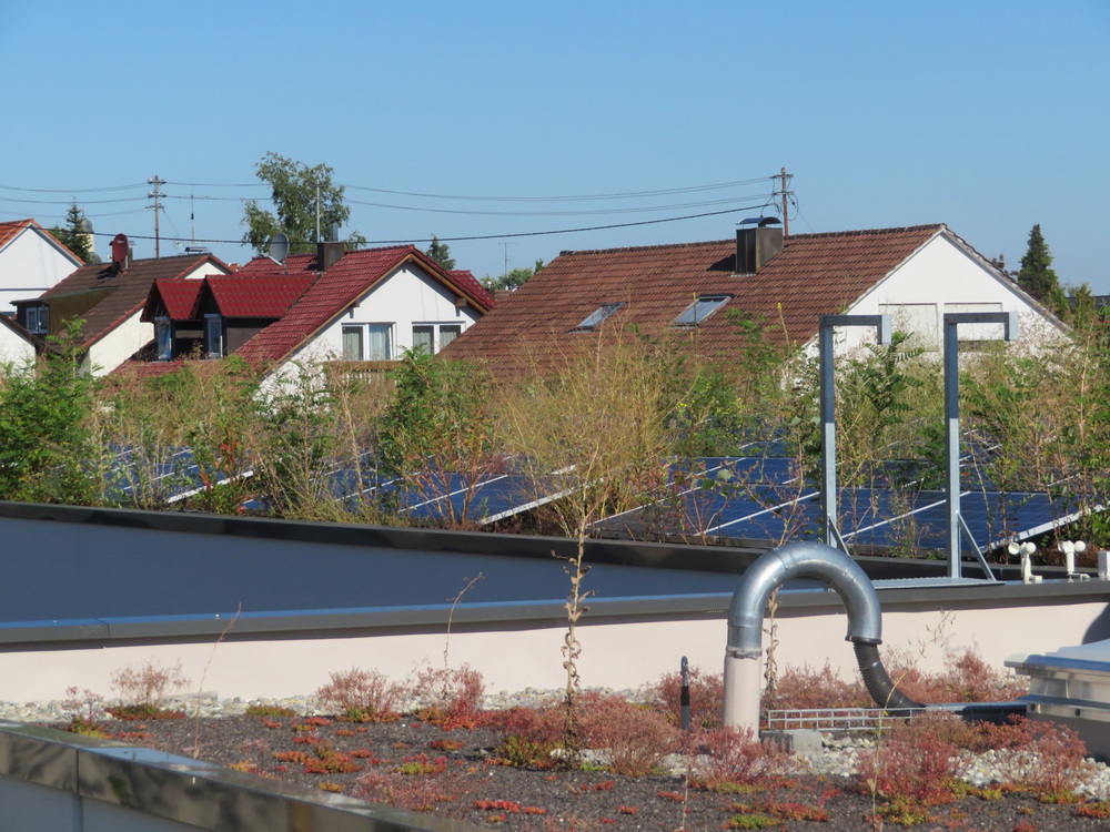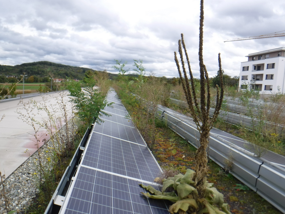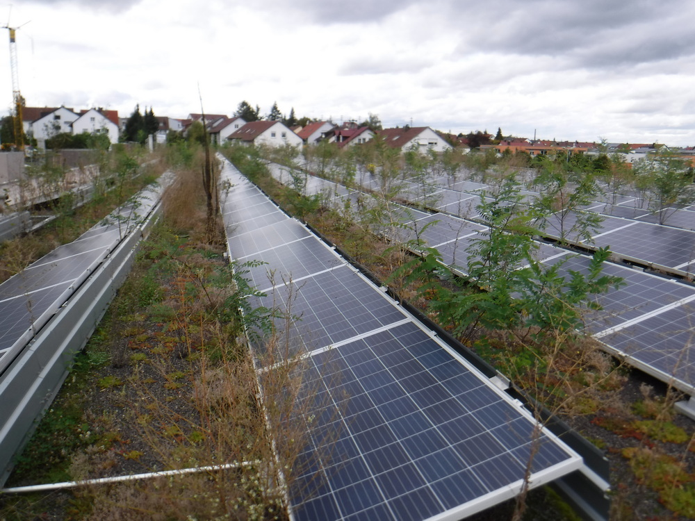 Eine Photovoltaik-Anlage profitiert von einem Gründach, weil der Bewuchs die Umgebungstemperatur senkt, wodurch die Leistungsfähigkeit der Anlage erhöht wird. Eine regelmäßige Wartung des Daches ist jedoch unerlässlich, da der Wind sowie Vögel die Samen unerwünschter Pflanzen aufs Dach tragen können. Solche höheren Pflanzen dürfen die Photovoltaikpaneele nicht verschatten und die Dachhaut mit ihren Wurzeln nicht schädigen. Die regelmäßige Wartung stellt außerdem sicher, dass eventuelle Schäden an den technischen Einrichtungen frühzeitig erkannt und behoben werden. Wird über längere Zeit keine Dachwartung durchgeführt, kann das Dach so aussehen: