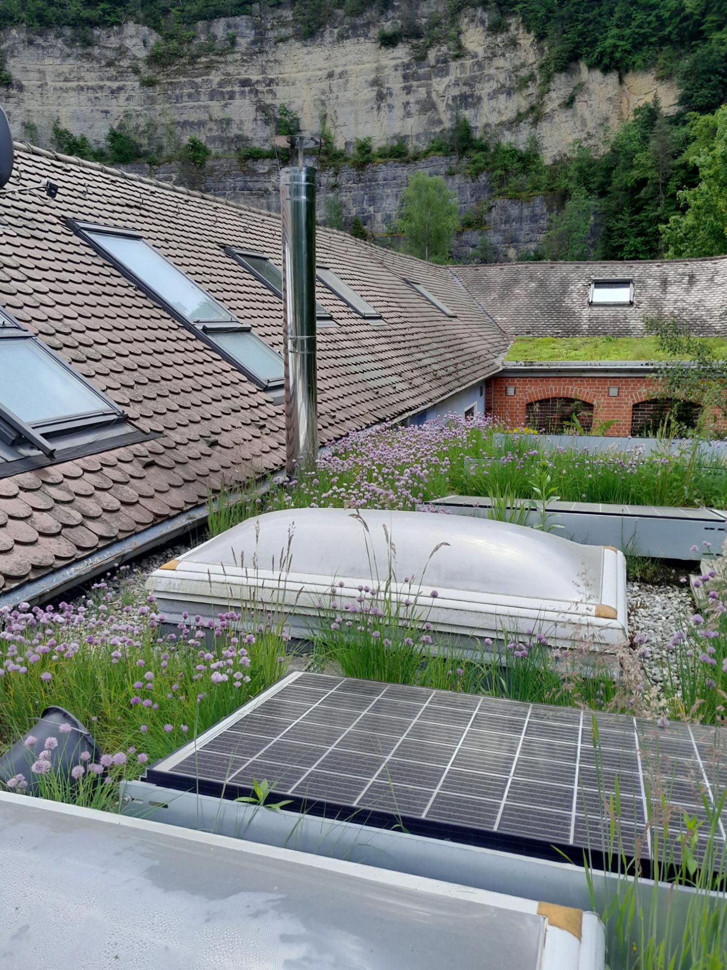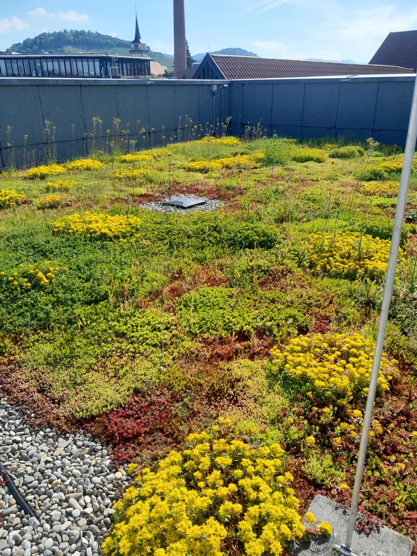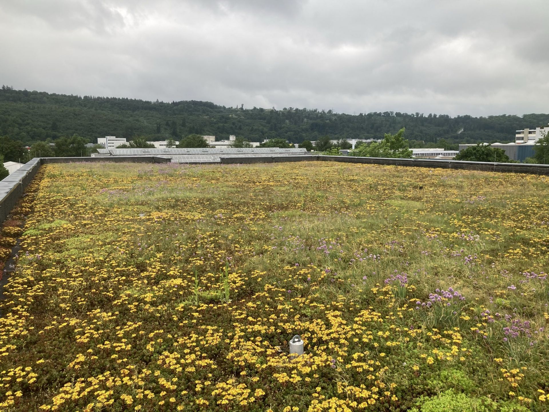 Mai und Juni sind die schönsten, aber auch arbeitsreichsten Monate in der Gründachwartung. Auf den begrünten Dächern grünt und blüht es. Ein Traum in gelb und lila, der den Insekten Nahrung in Hülle und Fülle bietet.