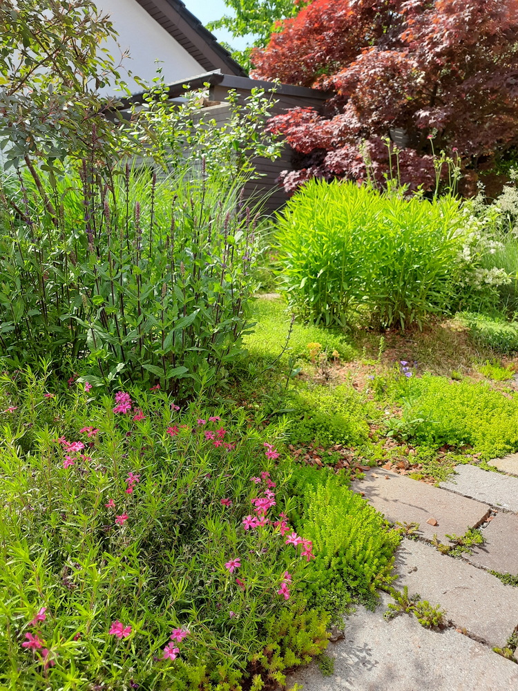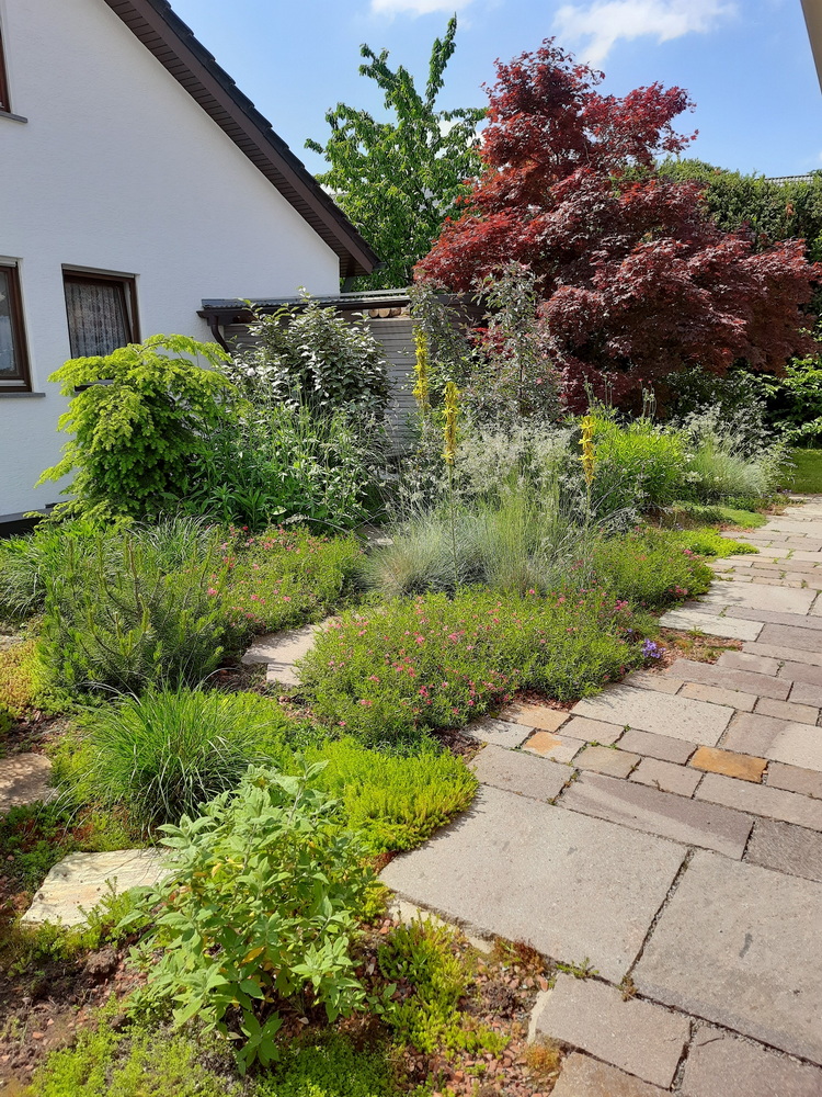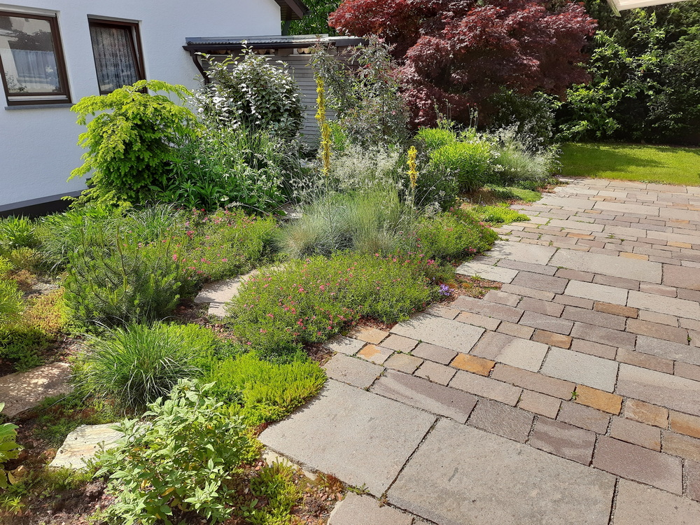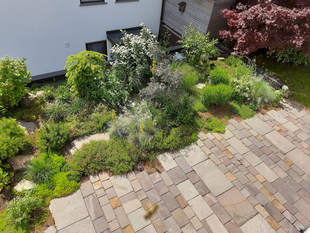 Das Haus liegt in Hanglage und die Begrünung der tiefergelegenen Doppelgarage hat Raum für einen bezaubernden kleinen Garten direkt vor dem Wohnzimmer des Einfamilienhauses geschaffen. Bei diesem Projekt wurde die Garage intensiv begrünt. Das bedeutet, dass wir die Substratschicht auf dem Garagendach so gestaltet haben, dass dort auch größere Stauden und Gehölze wachsen können. Vor dem Wohnzimmer wurde eine große Terrasse aus Porphyrplatten gebaut und direkt daran angrenzend ein üppig bepflanztes Staudenbeet angelegt. Wir finden, dass dieser Garten eine unglaubliche Wirkung entfaltet und man kaum vermuten würde, dass sich darunter eine Garage befindet. Oder andersherum: wenn man vor der Garage steht, ahnt man nicht, dass oben ein kleines Gartenparadies zum Entspannen einlädt.