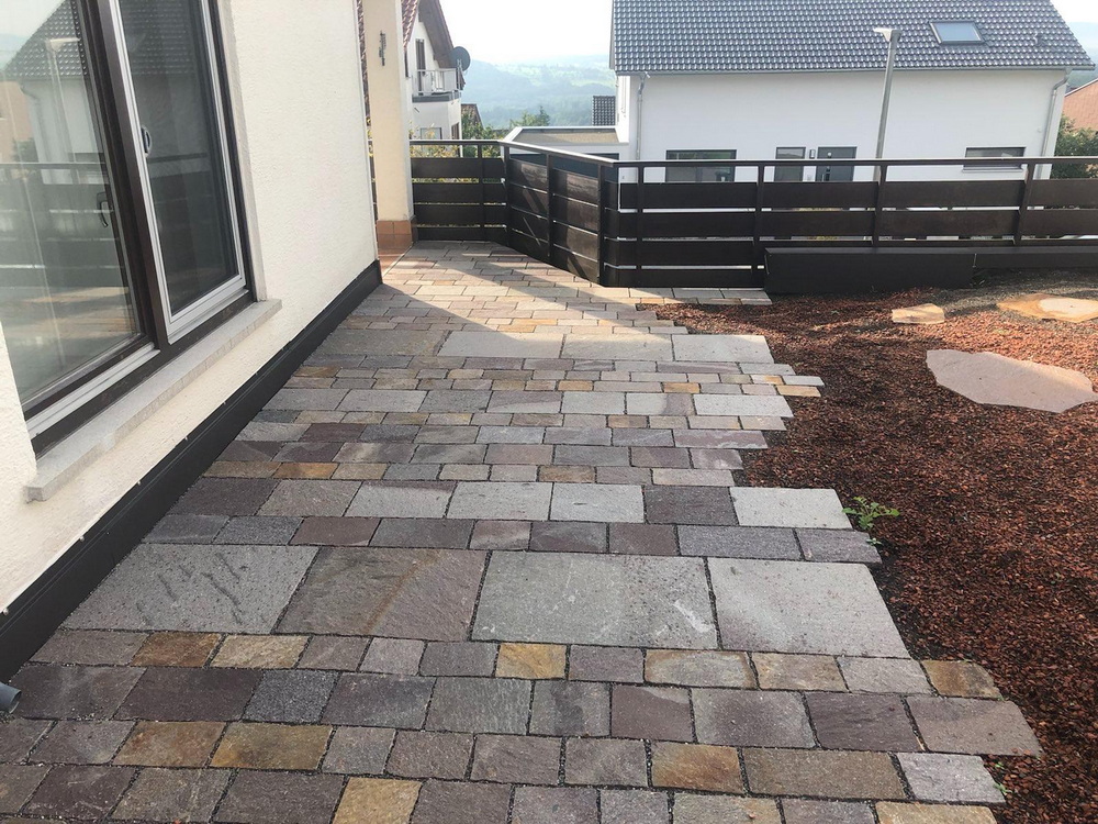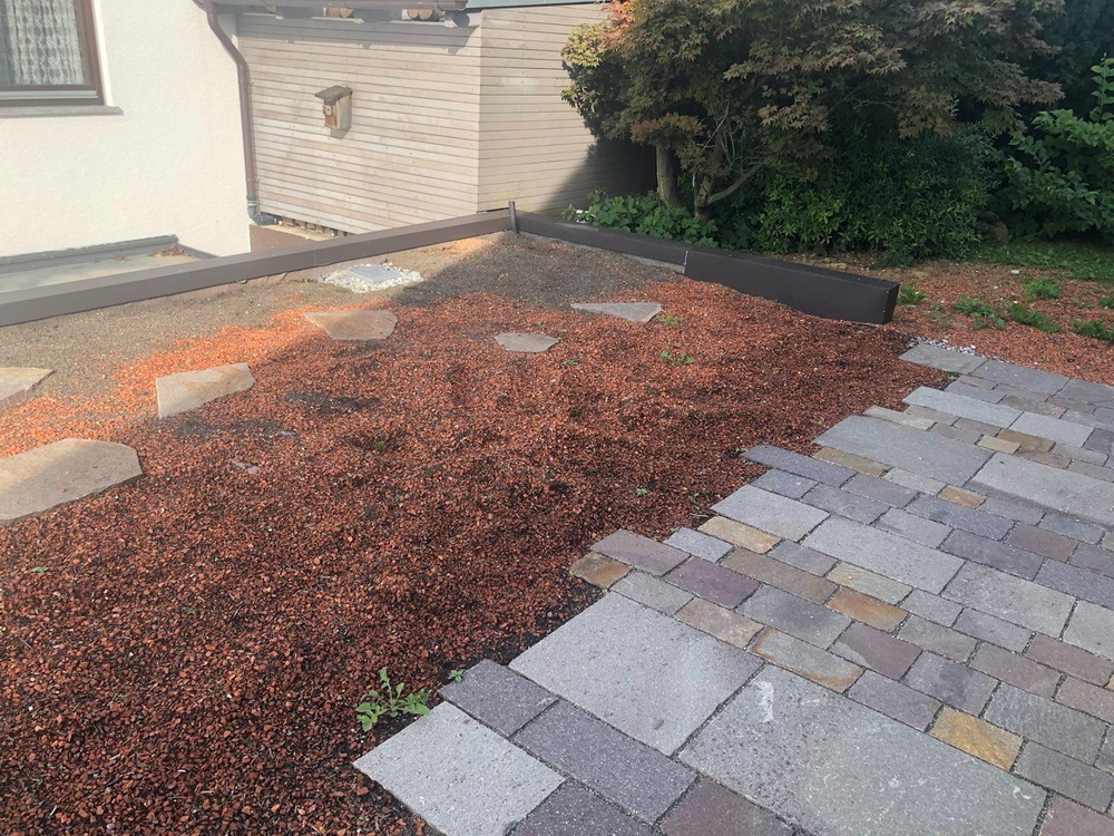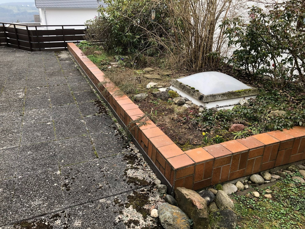 Im Jahr 2020 wurden wir gebeten, ein undicht gewordenes Garagendach neu zu begrünen und in den bestehenden Garten zu integrieren. Der ursprüngliche Dachgarten mit Waschbetonplatten und Klinkersteinen sollte modernisiert und attraktiv gestaltet werden. Bei diesem Projekt hat unsere Bauherrin lange nach einem passenden Terrassenbelag gesucht – als wir ihr die Porphyrplatten vorgestellt haben, war es Liebe auf den ersten Blick.