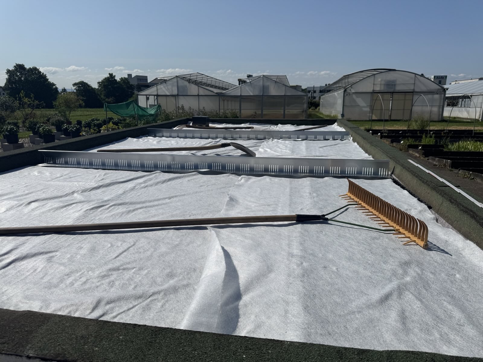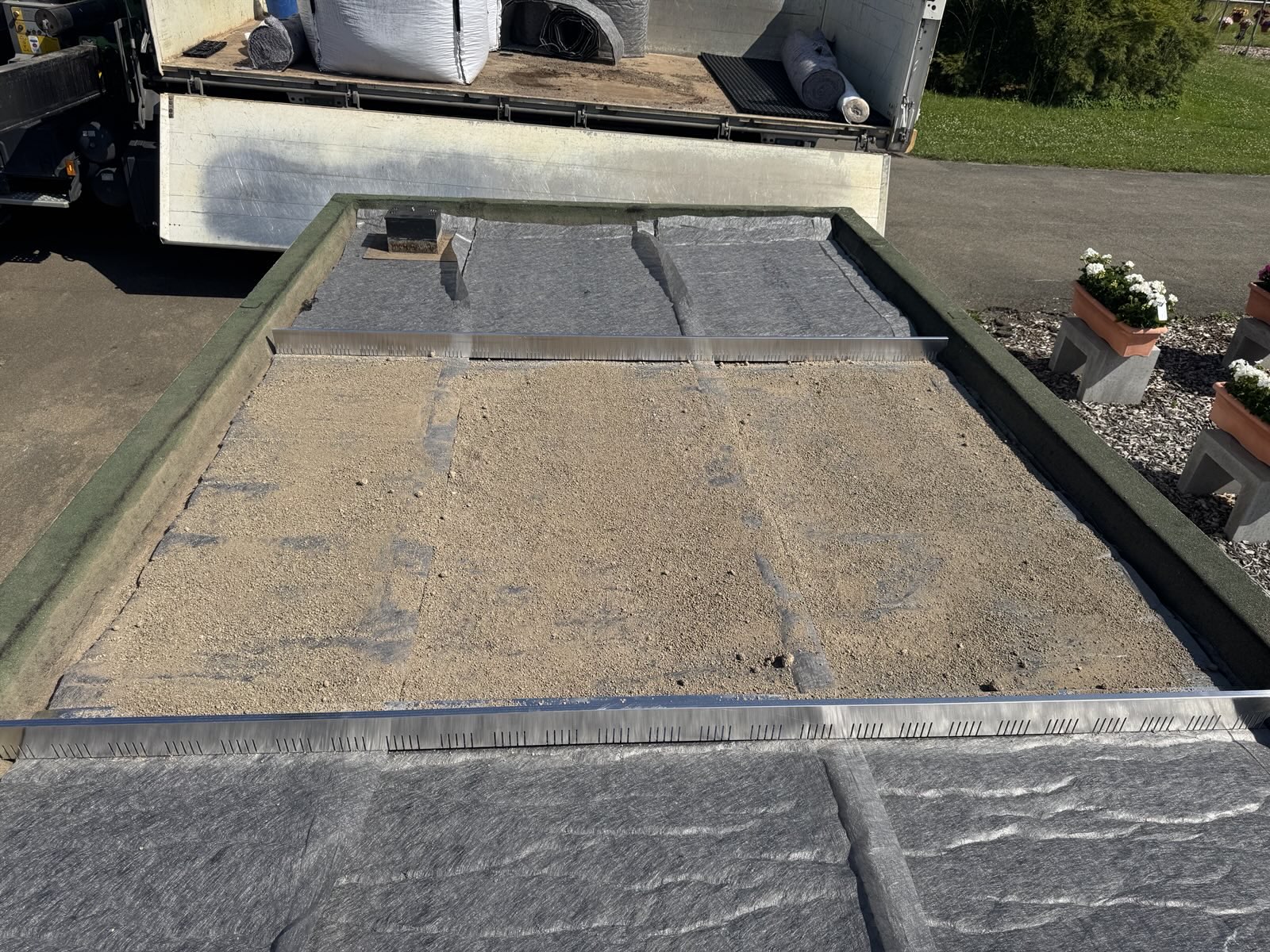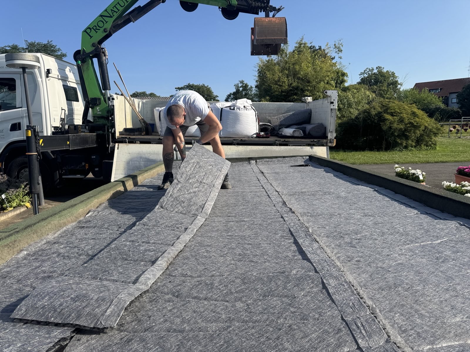 Für den Versuch haben wir von zwei Garagendächern den Kies abgeräumt und sie für die Begrünung vorbereitet. Jedes der Dächer wurde in drei Teilflächen aufgeteilt. Eine davon wurde konventionell begrünt. Bei der zweiten wurde Greenground unter dem Substrat ausgestreut. Auf der dritten Teilfläche wurde das neue Produkt mit dem Substrat vermischt. Wir werden die Entwicklung des angesäten Sedums in den nächsten Monaten aufmerksam verfolgen, um die Leistungsfähigkeit dieses neuen Materials beurteilen zu können.