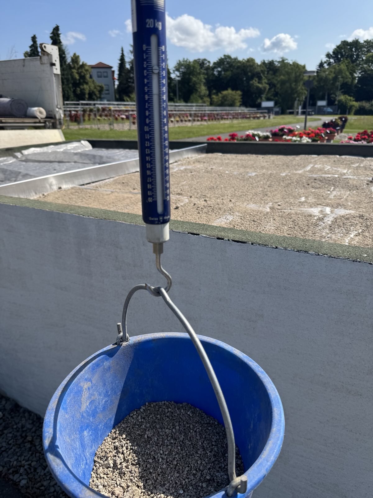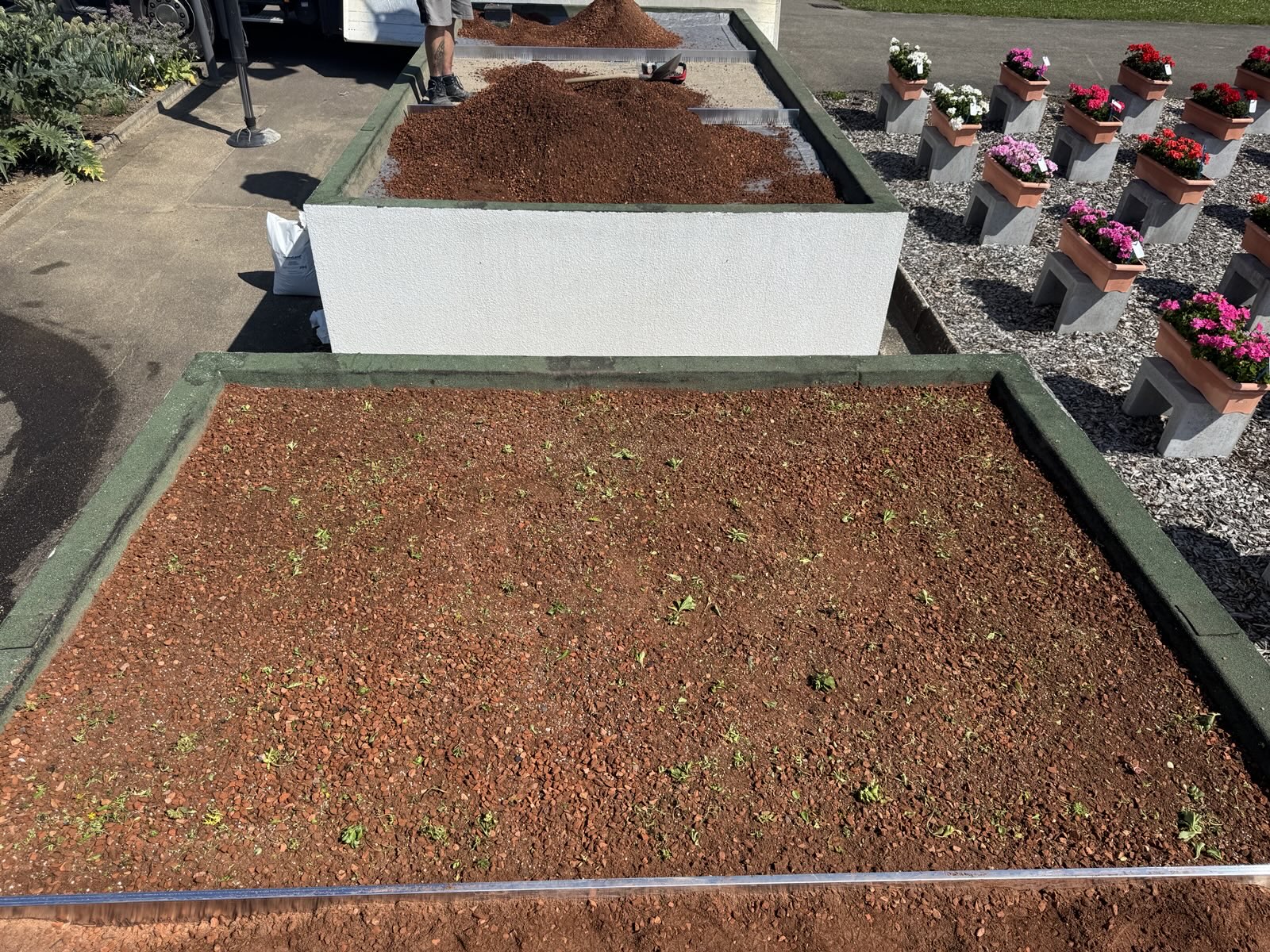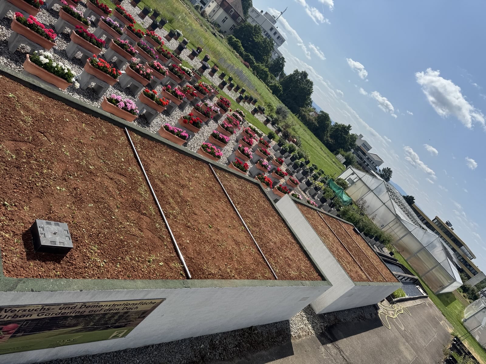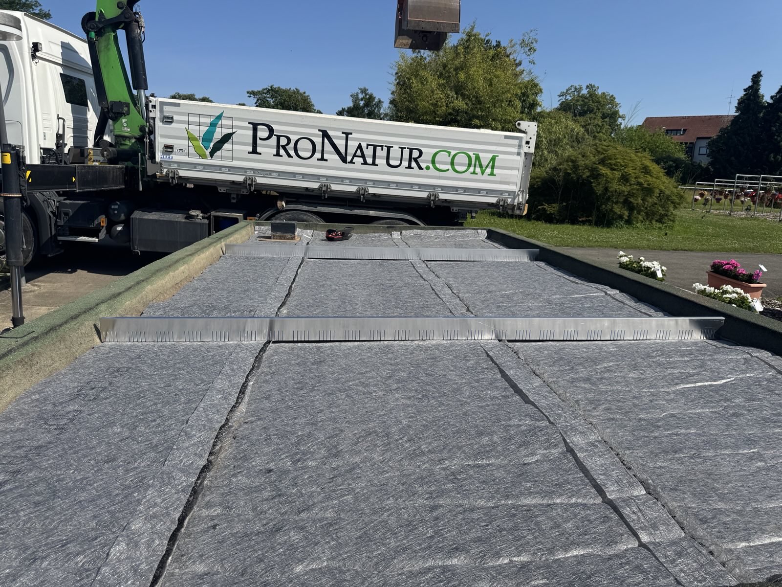 Für den Versuch haben wir von zwei Garagendächern den Kies abgeräumt und sie für die Begrünung vorbereitet. Jedes der Dächer wurde in drei Teilflächen aufgeteilt. Eine davon wurde konventionell begrünt. Bei der zweiten wurde Greenground unter dem Substrat ausgestreut. Auf der dritten Teilfläche wurde das neue Produkt mit dem Substrat vermischt. Wir werden die Entwicklung des angesäten Sedums in den nächsten Monaten aufmerksam verfolgen, um die Leistungsfähigkeit dieses neuen Materials beurteilen zu können.