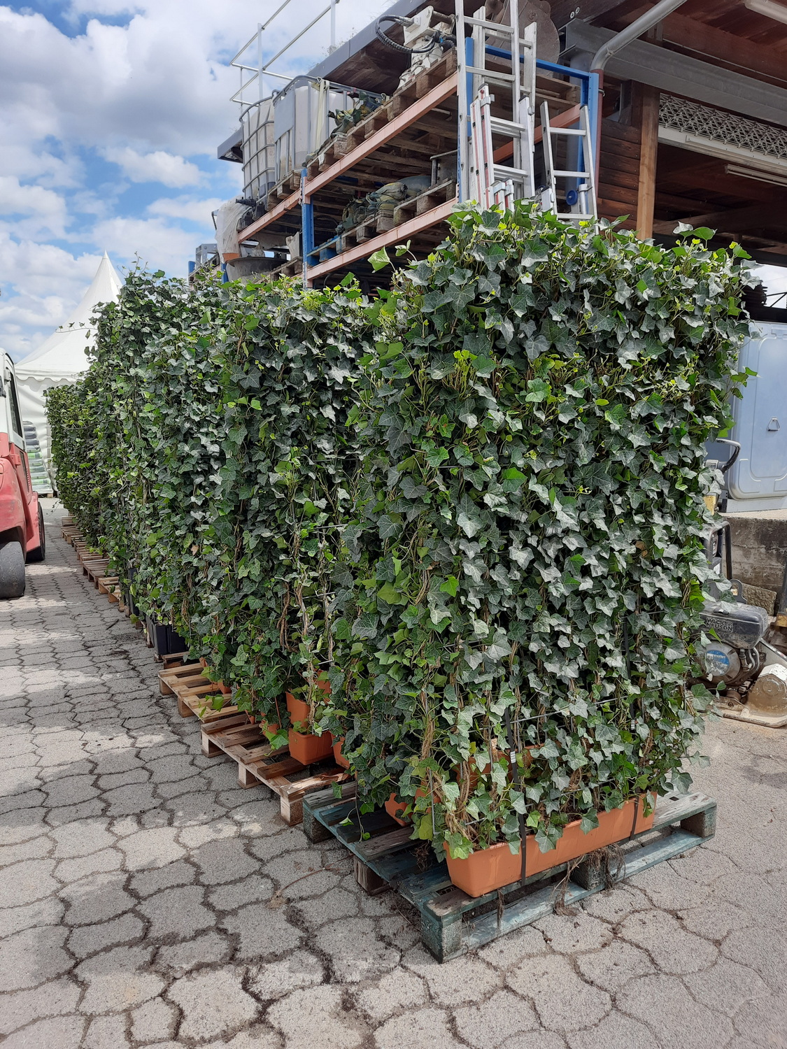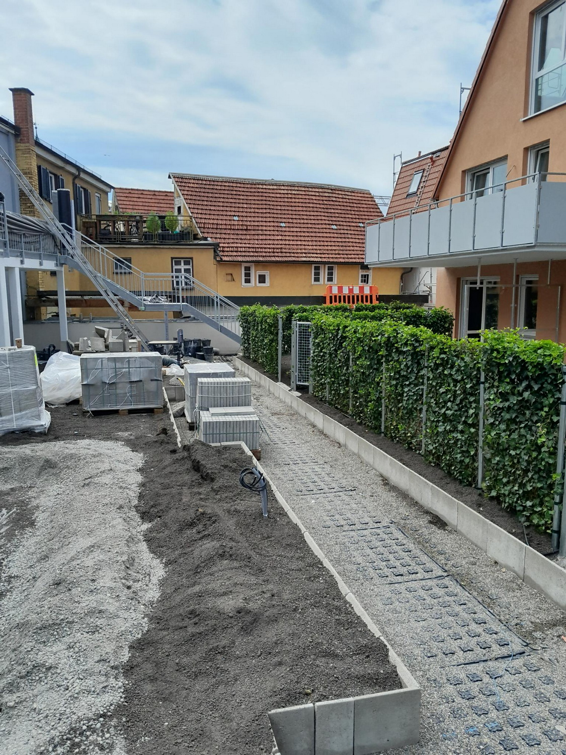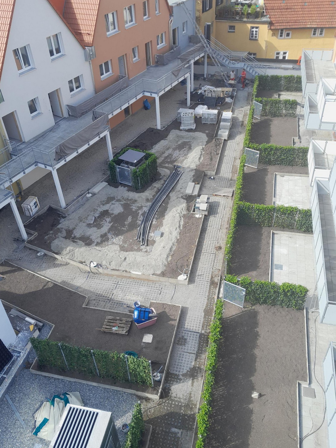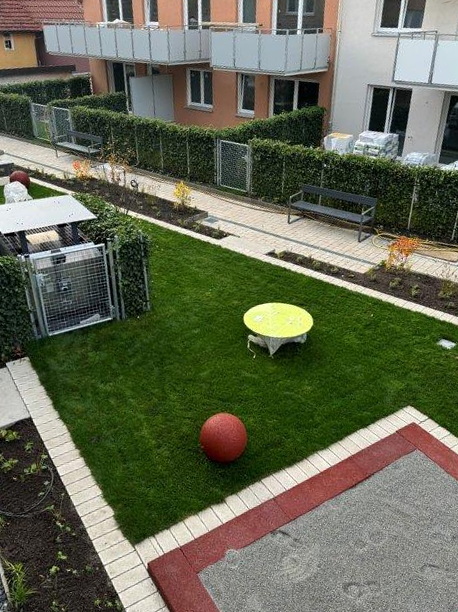 Im Reutlinger Katharinenhof haben wir auf dem Dach des neuen Supermarktes mit Eingang in der Katharinenstraße einen Innenhof für die umliegenden Wohngebäude gestaltet. Angrenzend an die Gärten der Bewohner ist ein gemeinsamer Bereich mit Sitzgelegenheiten und einem kleinen Spielplatz entstanden. Als Abgrenzung für die Privatgärten und verschiedene technische Einrichtungen hatte die gestaltende Landschaftsarchitektin Marisa Schäfer Efeuhecken geplant, die zunächst als Palettenware auf dem ProNatur-Betriebshof eintrafen und im August 2024 im Katharinenhof eingebaut wurden. Mitte Oktober wurden von unserem Reutlinger Partnerunternehmen Lutz + Riepert die Pflasterbeläge verlegt, die Spielgeräte aufgebaut und die Grünflächen mit Gehölzen und Stauden bepflanzt. Die Auswahl der Pflanzen orientierte sich an der geringen Substrathöhe, die charakteristisch für einen Dachgarten ist – die Pflanzen müssen mit vergleichsweise wenig Substrat auskommen und trockenheitstolerant sein. Mit den gewählten Arten können sich die Bewohner auf einen grünen Aufenthaltsbereich mit blühenden Stauden zu jeder Jahreszeit freuen.