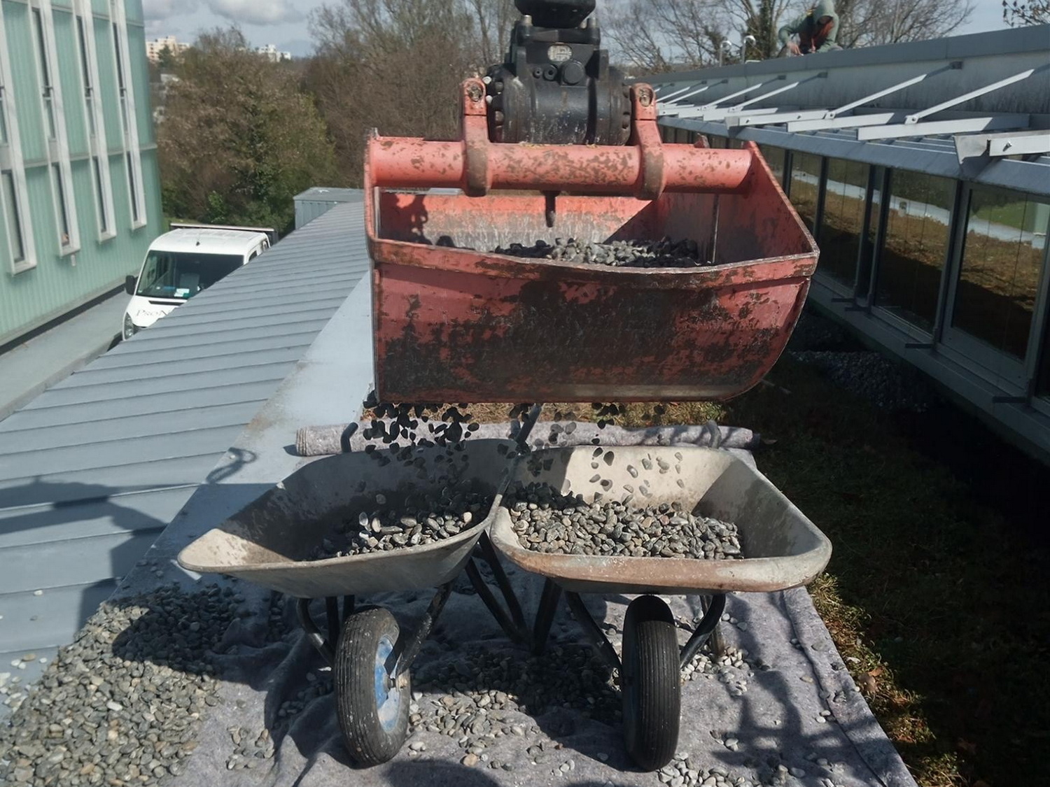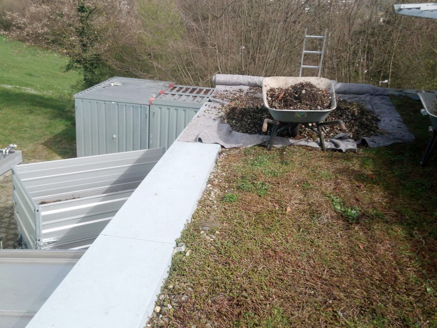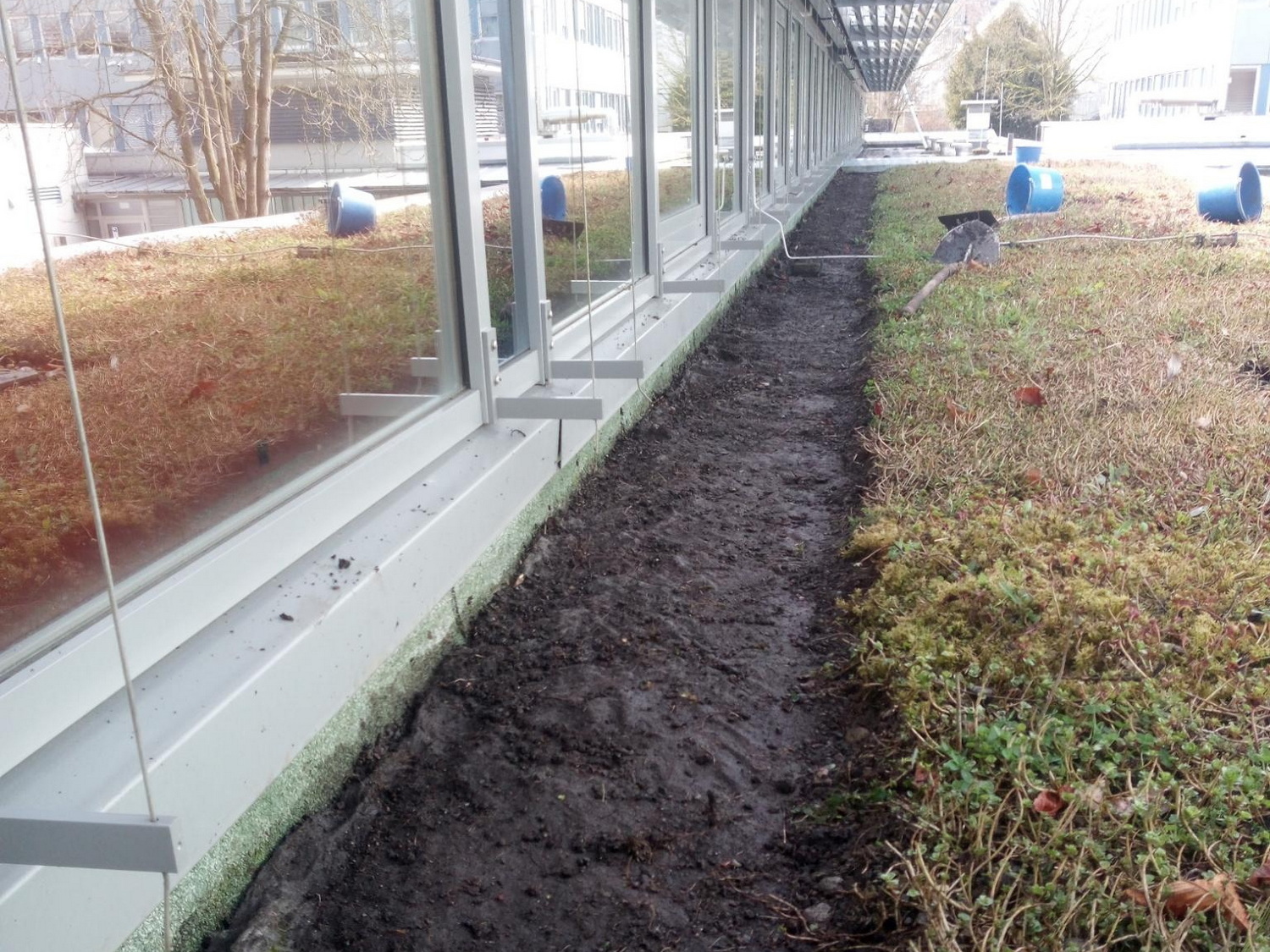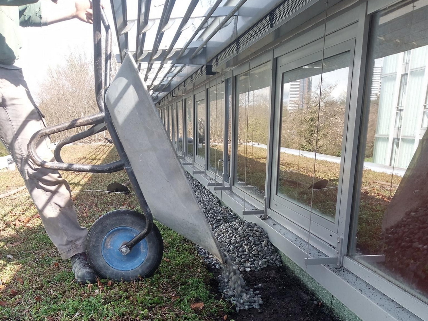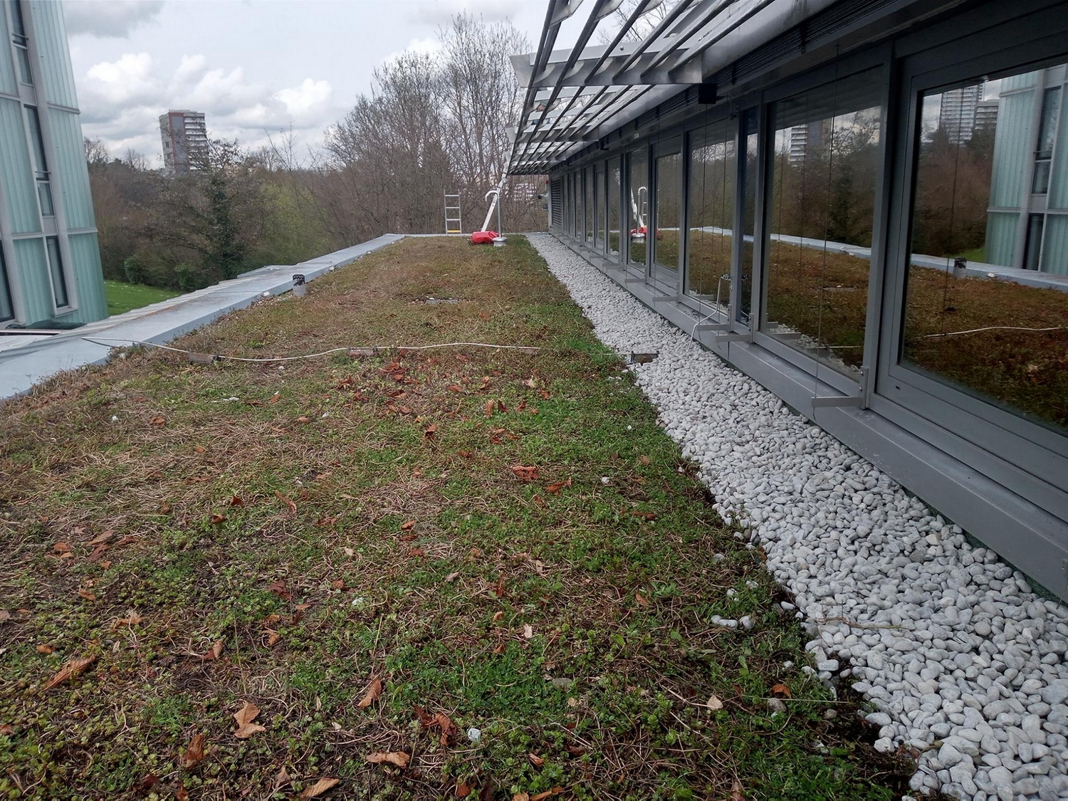 Seit 2024 ist ProNatur mit der Dachwartung des Max-Planck-Instituts in Tübingen beauftragt. Dort musste neben den laufenden Pflegearbeiten auch ein Brandschutzstreifen erneuert werden. Grundsätzlich werden bei begrünten Dachflächen in den Randbereichen, um Aufbauten und technische Anlagen herum sowie als Abgrenzung zu höheren Gebäudeteilen Kiesstreifen eingebaut, die bei der Wartung von unerwünschtem Bewuchs freigehalten werden. Sie dienen als Spritz- und Brandschutz und erleichtern die Überprüfung der Abflüsse im Randbereich.
