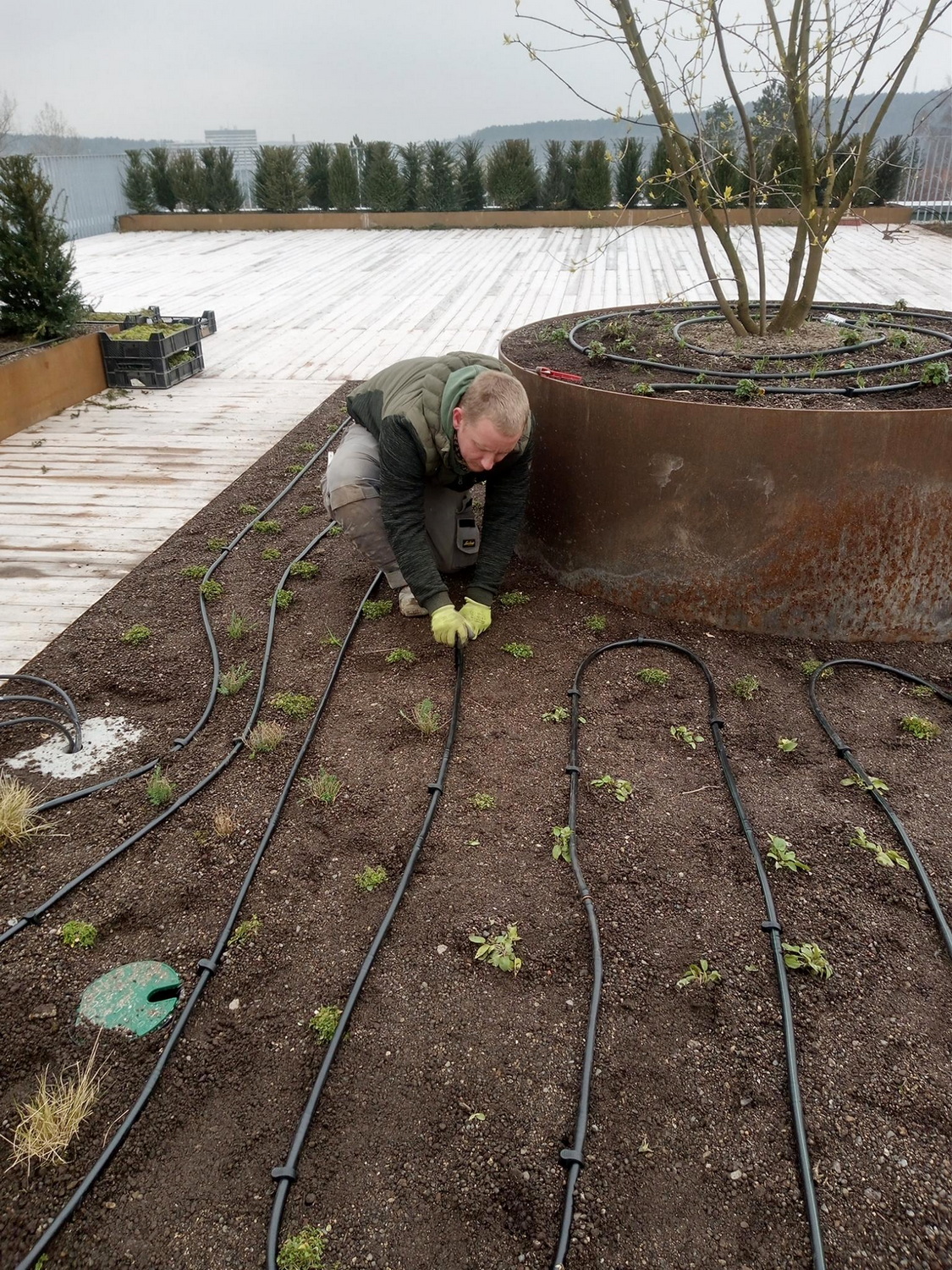 Installation der Bewässerung und Pflanzarbeiten