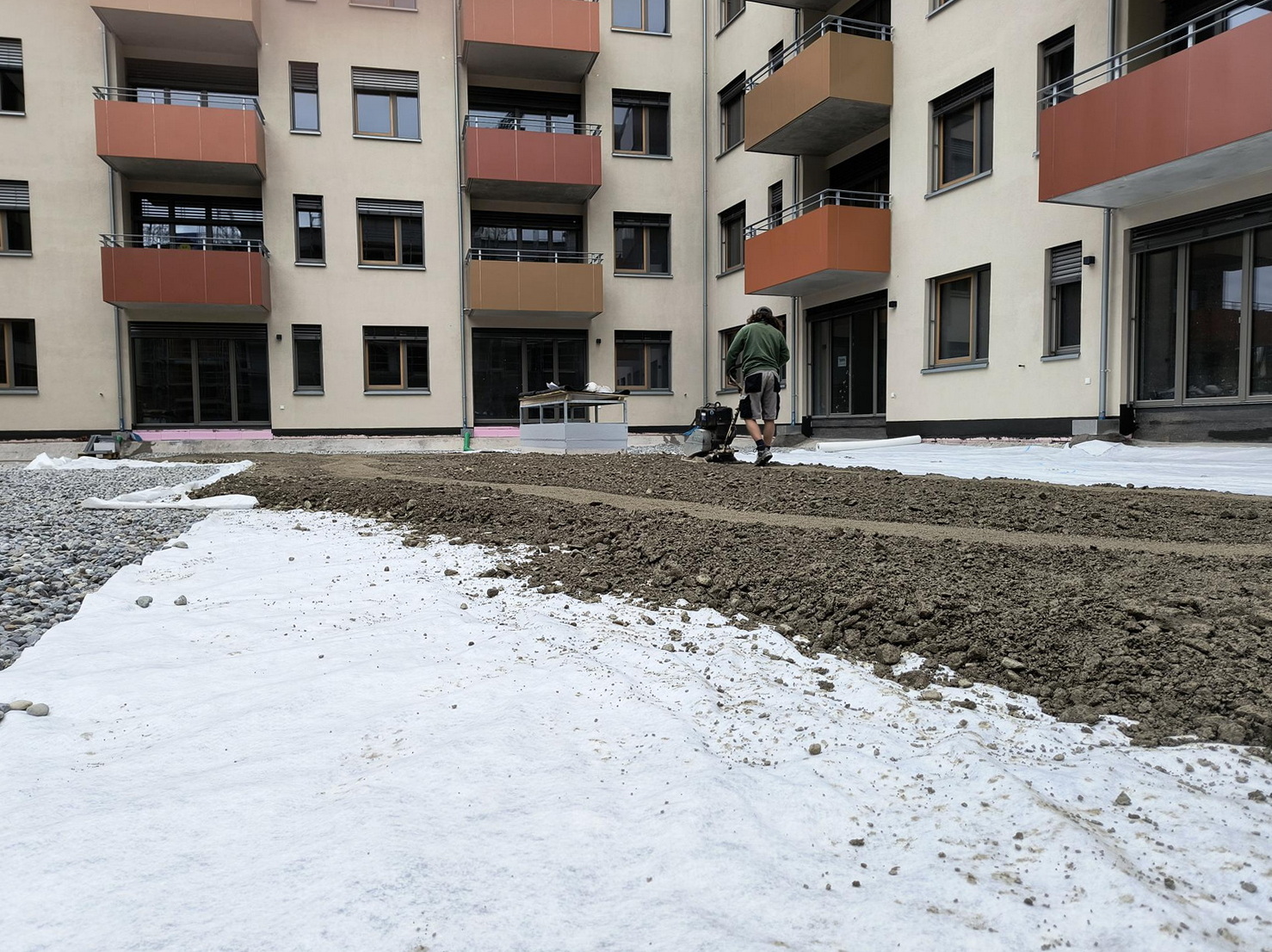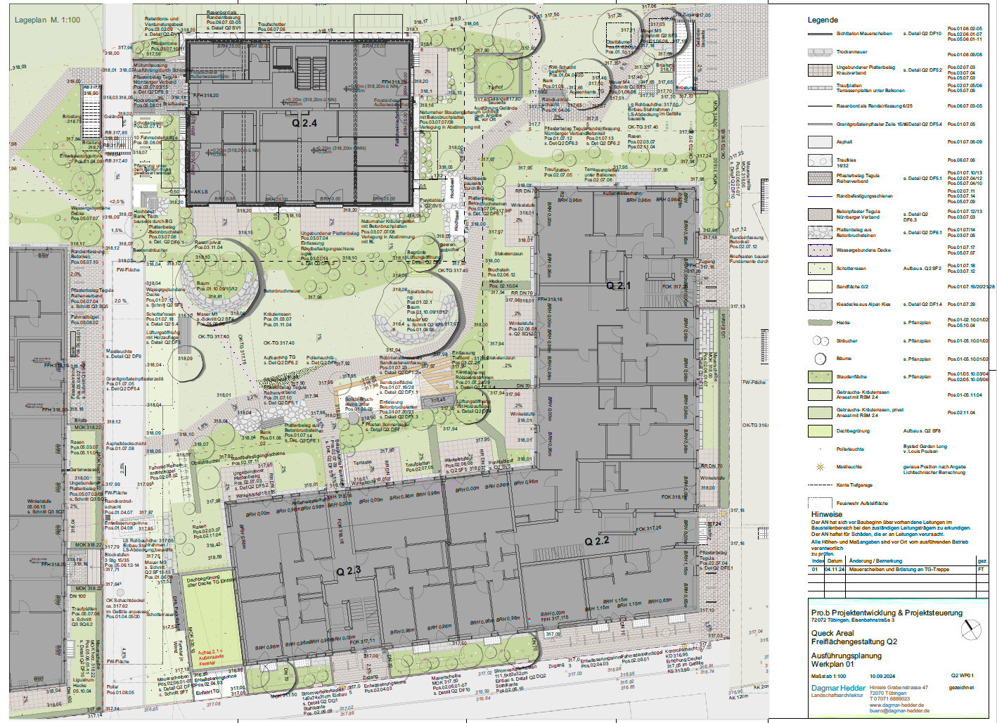 Im Tübinger Stadtteil Lustnau entsteht auf dem ehemaligen Queck-Areal ein gemischt genutztes Quartier mit Wohnraum für 450 Personen, das künftig Aeulehöfe heißen wird. Der rund 2,4 Hektar große Bereich sieht laut Stadt Tübingen einen „ganzheitlichen, nachhaltigen und landschaftsintegrierten Entwicklungsansatz mit qualitativ hochwertigen privaten und öffentlichen Freiflächen vor“. Die von Landschaftsarchitektin Dagmar Hedder gestalteten Außenanlagen beinhalten zum einen kleine Privatgärten, zum anderen gemeinsam genutzte Freiflächen, die auch Sandspielbereiche und Spielböschungen für Kinder umfassen. Die Umsetzung der Bauabschnitte 1 und 2 wurde bereits an uns vergeben, unsere Bewerbung für Bauabschnitt 3 läuft noch. Vielen Dank - wir freuen uns über die Beauftragung und das uns entgegengebrachte Vertrauen!