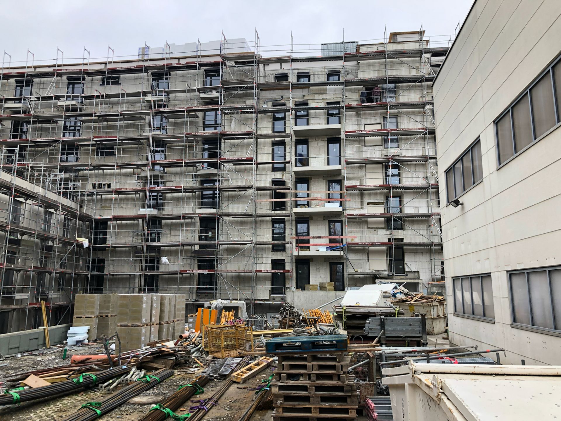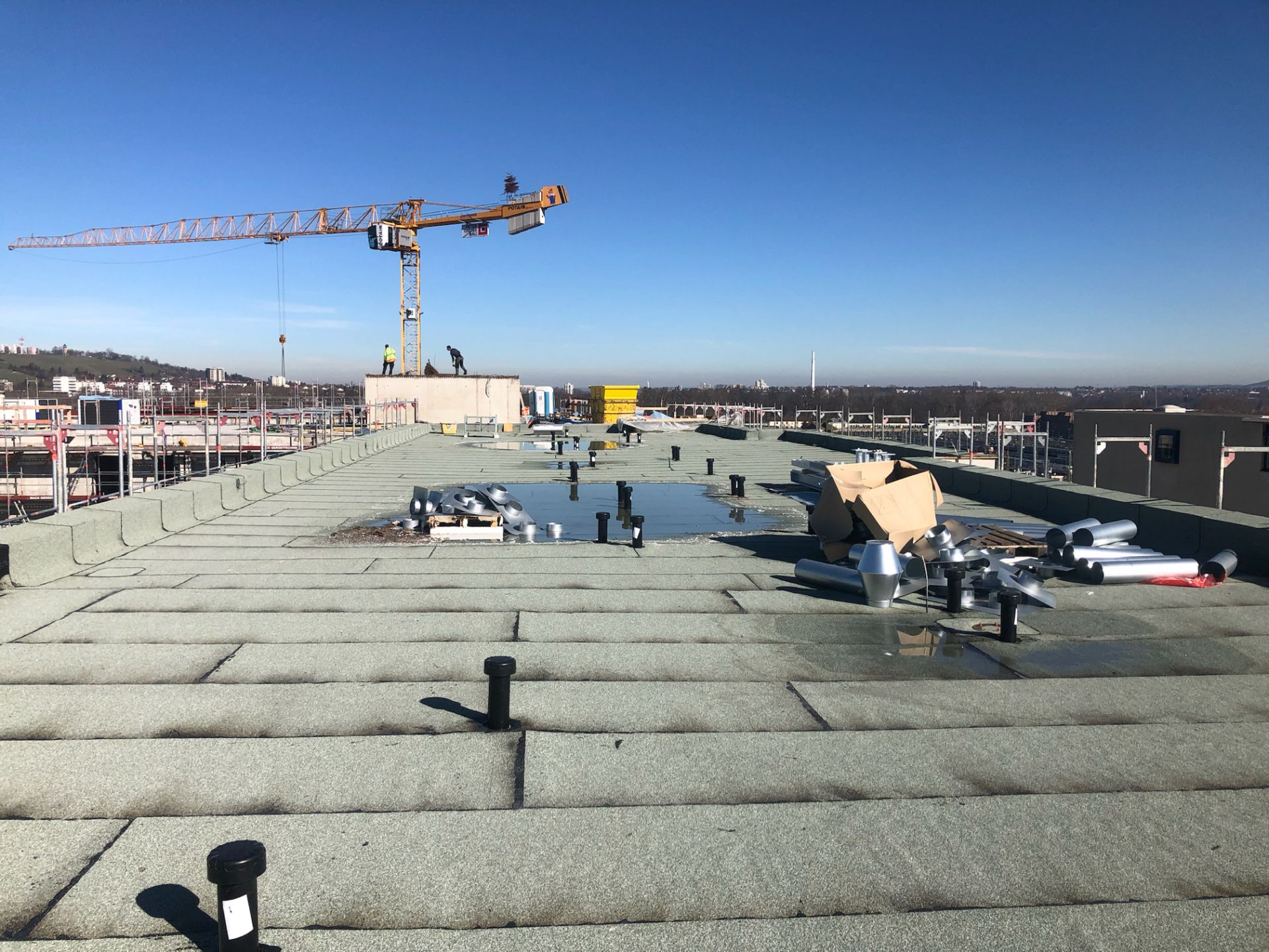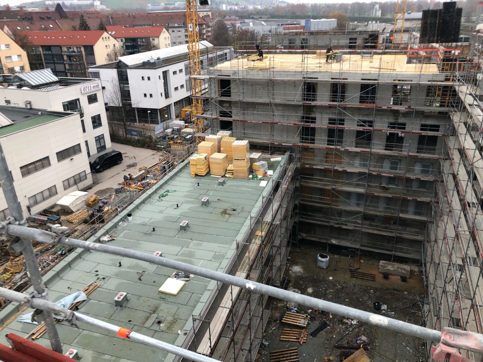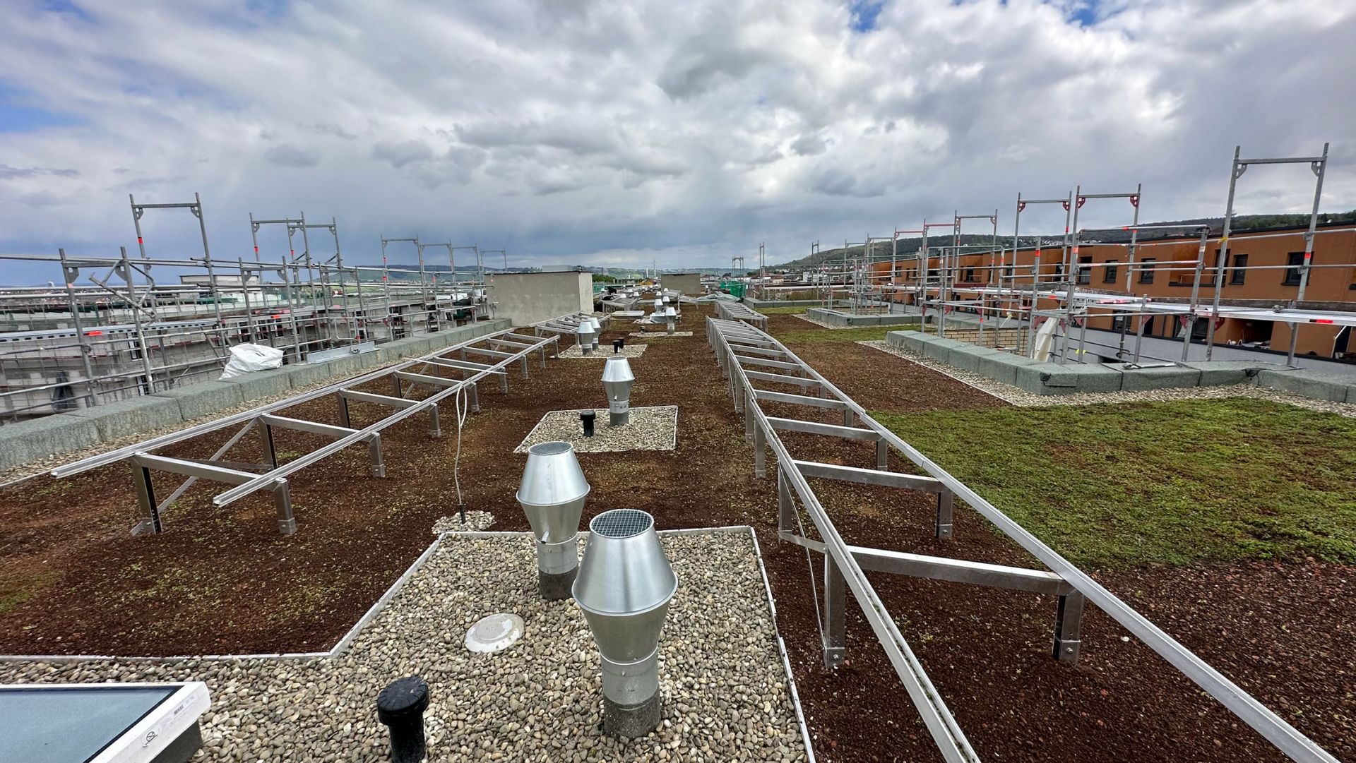 Mitte 2022 wurde ProNatur von der Peter Groß Bau Holding GmbH mit der Begrünung der Dachflächen und dem Bau der Unterkonstruktionen für die PV-Anlagen beauftragt. Die Arbeiten in luftiger Höhe haben wir im März 2023 begonnen, bis zum Herbst soll die Begrünung von 3500 Quadratmetern Dachfläche abgeschlossen sein.