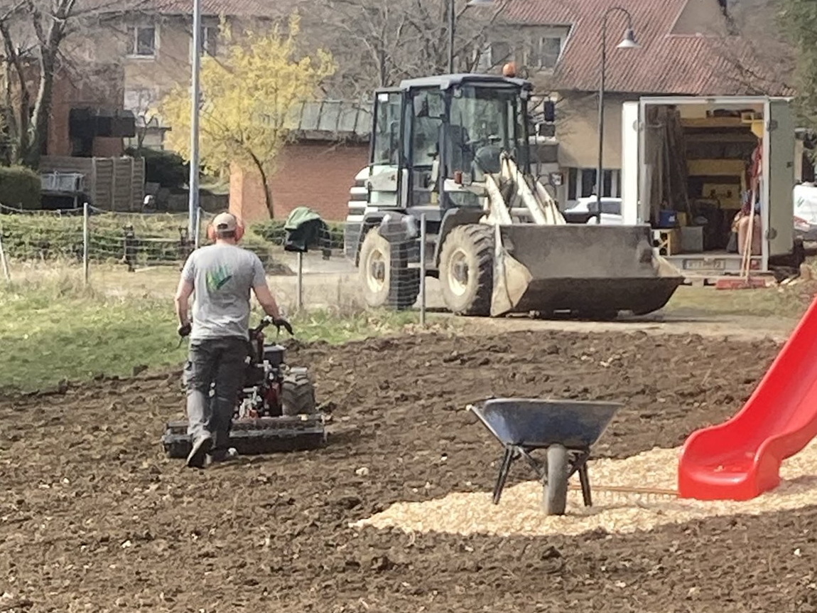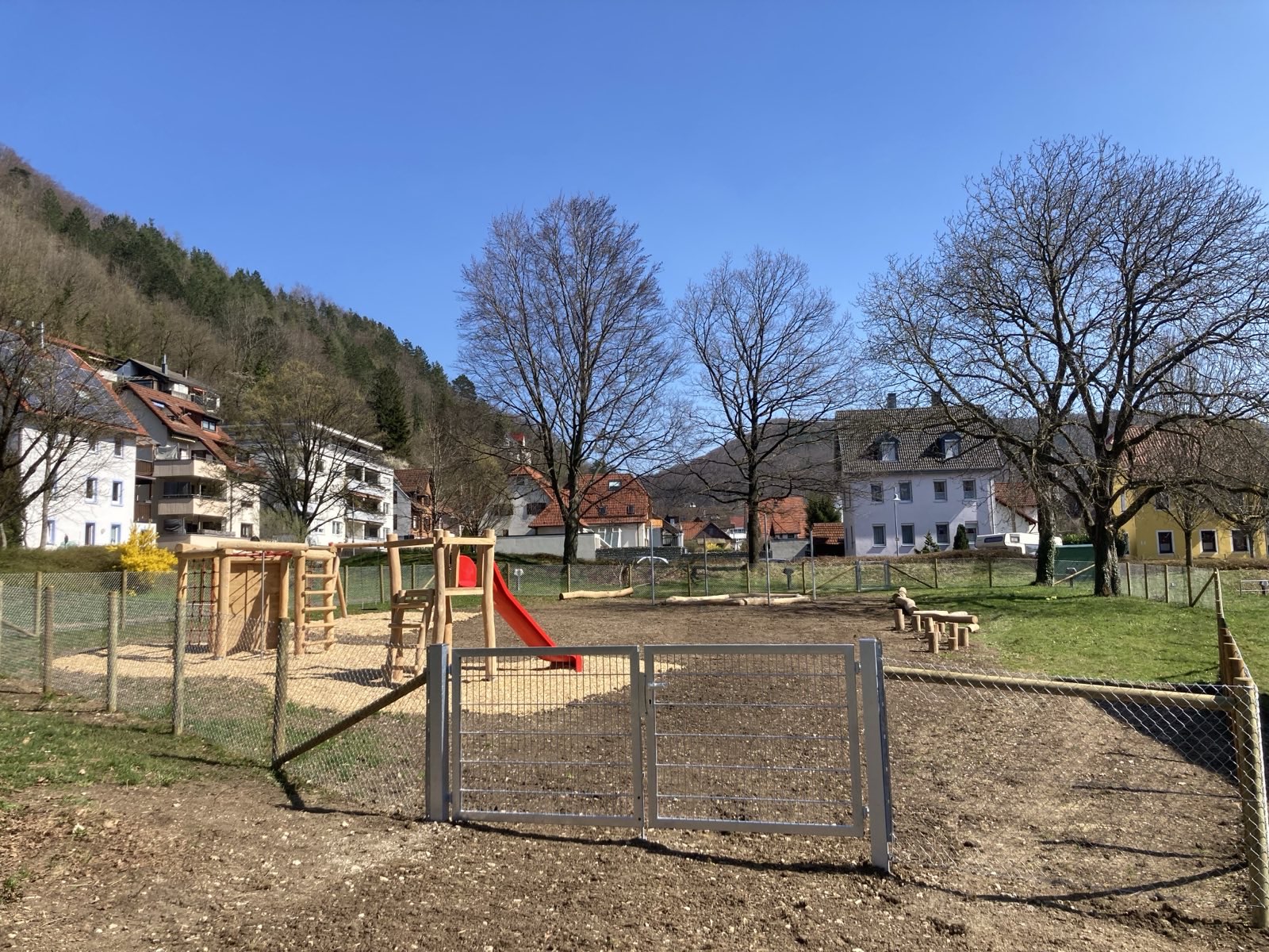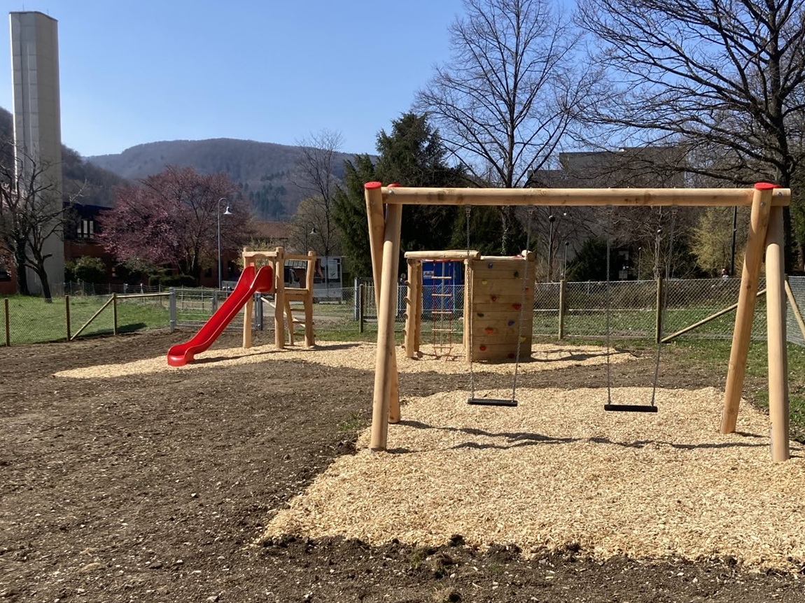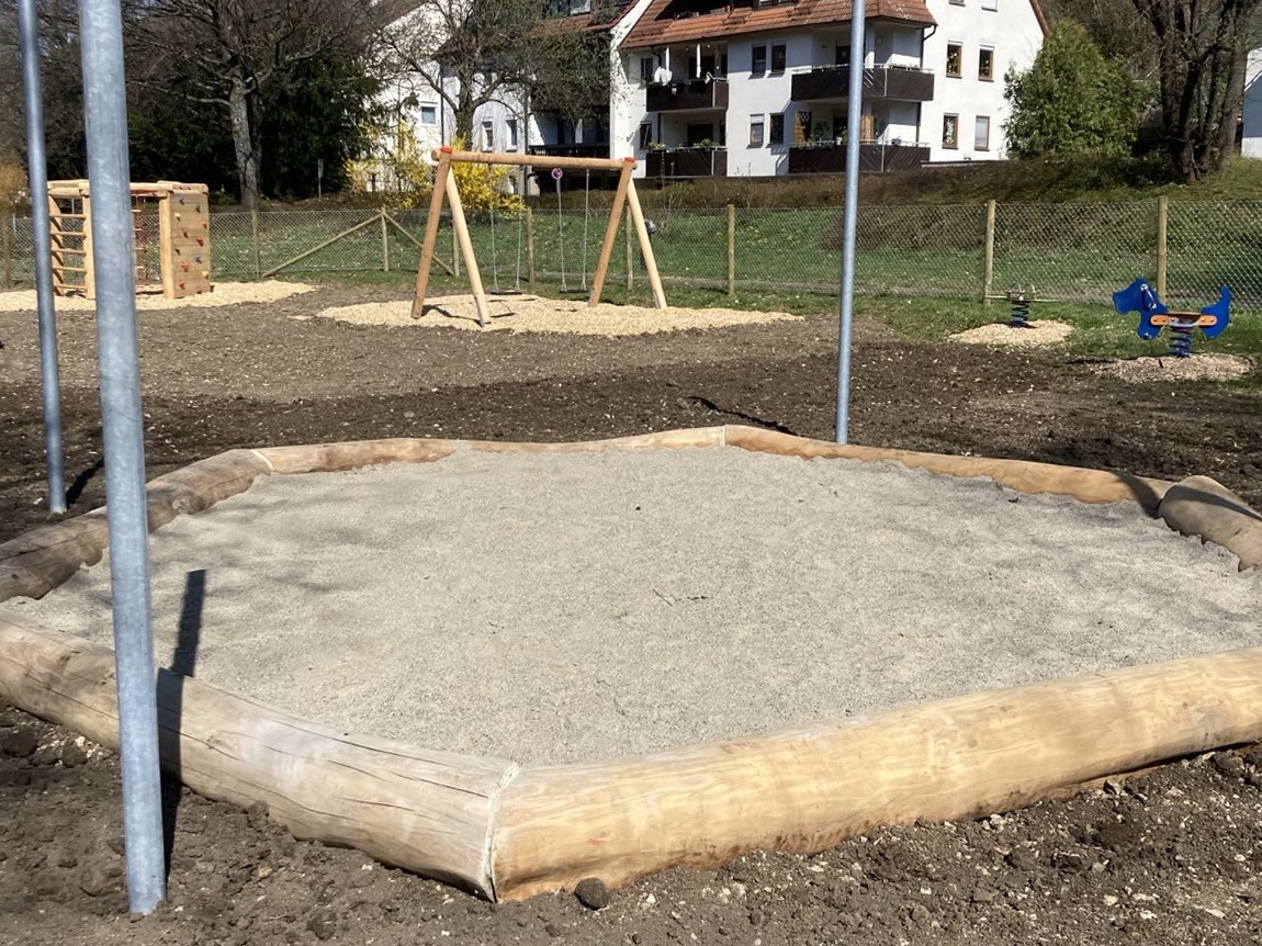 In Bad Urach haben wir im Frühjahr 2025 eine neue Außenanlage für den Kindergarten Schatzkiste gebaut. Auf dem 740 m² großen, umzäunten Gelände entstanden ein großer Sandkasten mit Sonnensegel, eine Balancierstrecke aus liegenden Baumstämmen und senkrecht stehenden Stammabschnitten unterschiedlicher Höhe, eine Rutsche, eine Doppelschaukel, zwei Federwippen sowie ein sechseckiger Kletterturm. Der Boden wurde gefräst und mit Spielrasen angesät. Der Kindergarten Schatzkiste ist im Gebäude des ehemaligen Krankenhauses untergebracht.