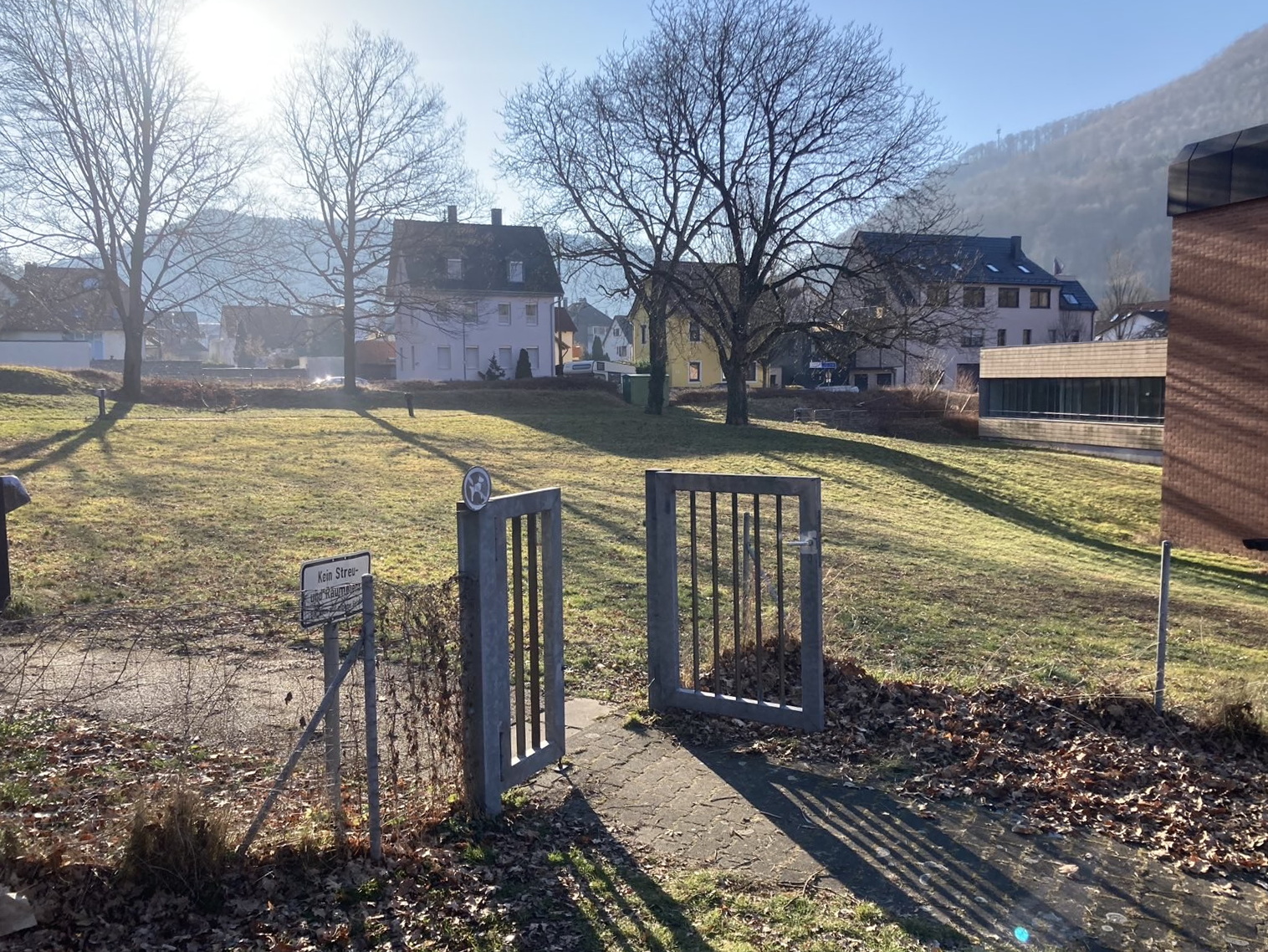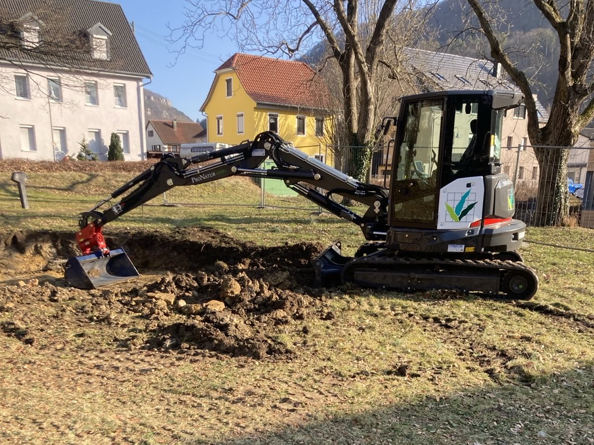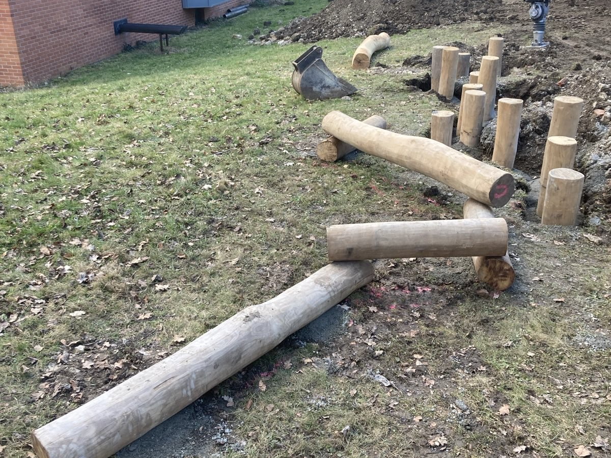 In Bad Urach haben wir im Frühjahr 2025 eine neue Außenanlage für den Kindergarten Schatzkiste gebaut. Auf dem 740 m² großen, umzäunten Gelände entstanden ein großer Sandkasten mit Sonnensegel, eine Balancierstrecke aus liegenden Baumstämmen und senkrecht stehenden Stammabschnitten unterschiedlicher Höhe, eine Rutsche, eine Doppelschaukel, zwei Federwippen sowie ein sechseckiger Kletterturm. Der Boden wurde gefräst und mit Spielrasen angesät. Der Kindergarten Schatzkiste ist im Gebäude des ehemaligen Krankenhauses untergebracht.