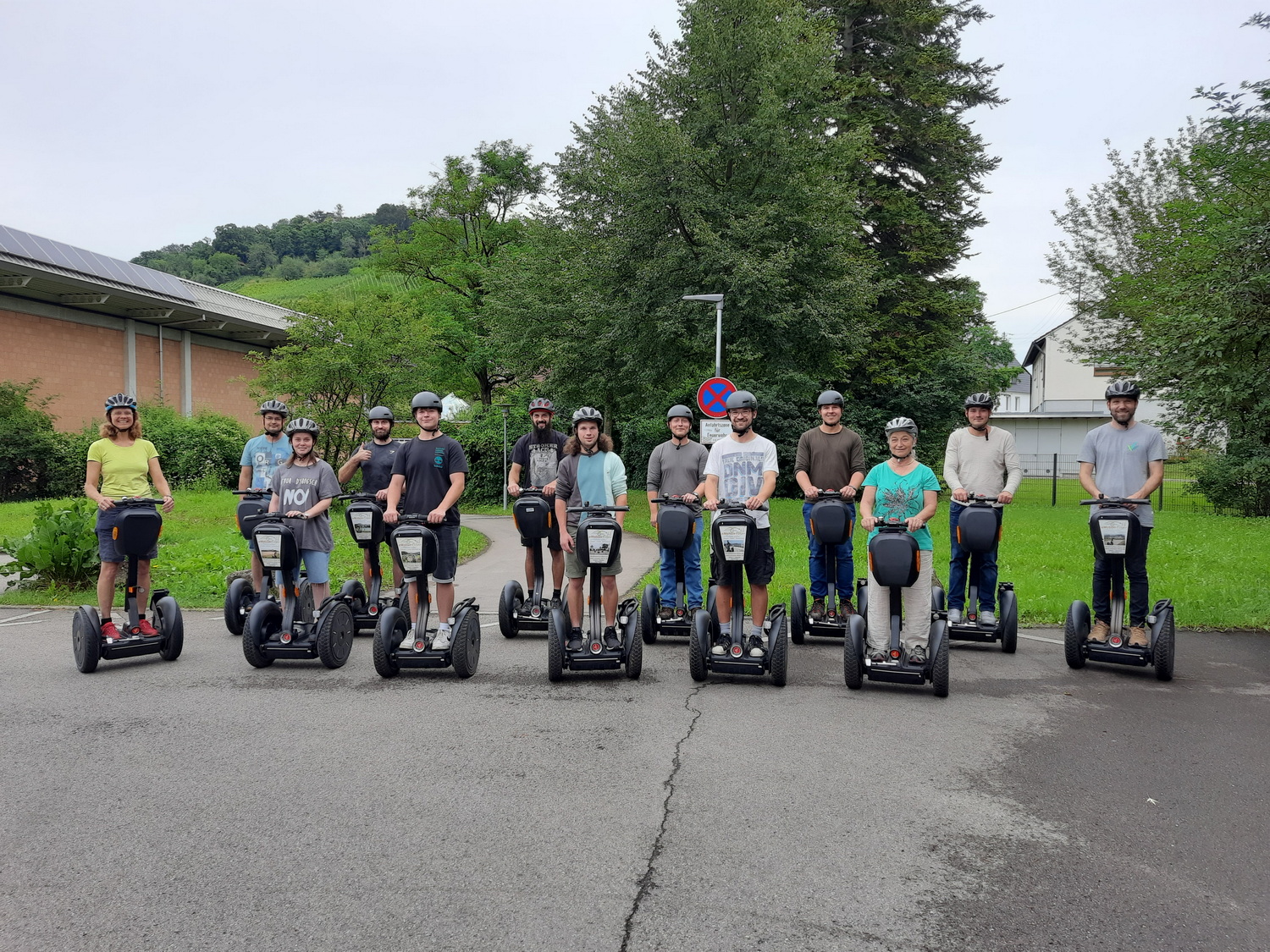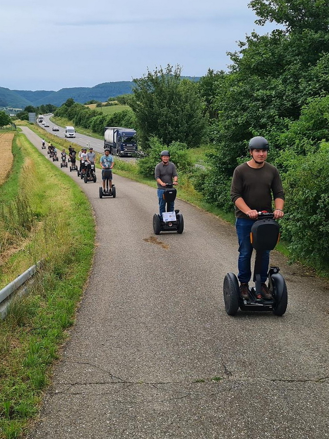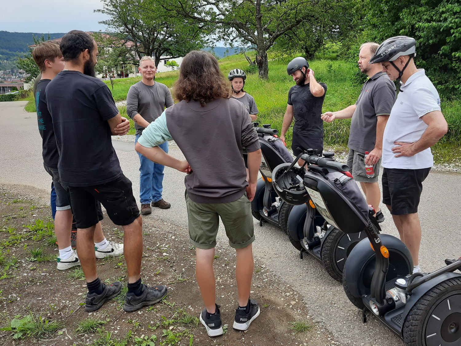 So stiegen die ProNatur-Mitarbeitenden nach ausführlicher Einweisung und einigen Übungs-Slaloms auf dem Parkplatz auf ihre Segways und machten sich gemeinsam mit den zwei Guides auf den Weg. Die anfängliche Unsicherheit auf den ungewohnten Fahrzeugen war schnell überwunden, so dass die Ausfahrt von Metzingen durchs Ermstal nach Dettingen und zurück für alle zu einem einzigartigen Erlebnis wurde.