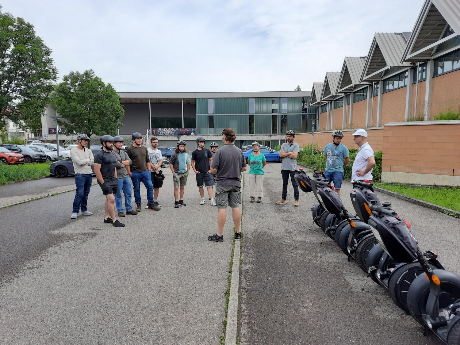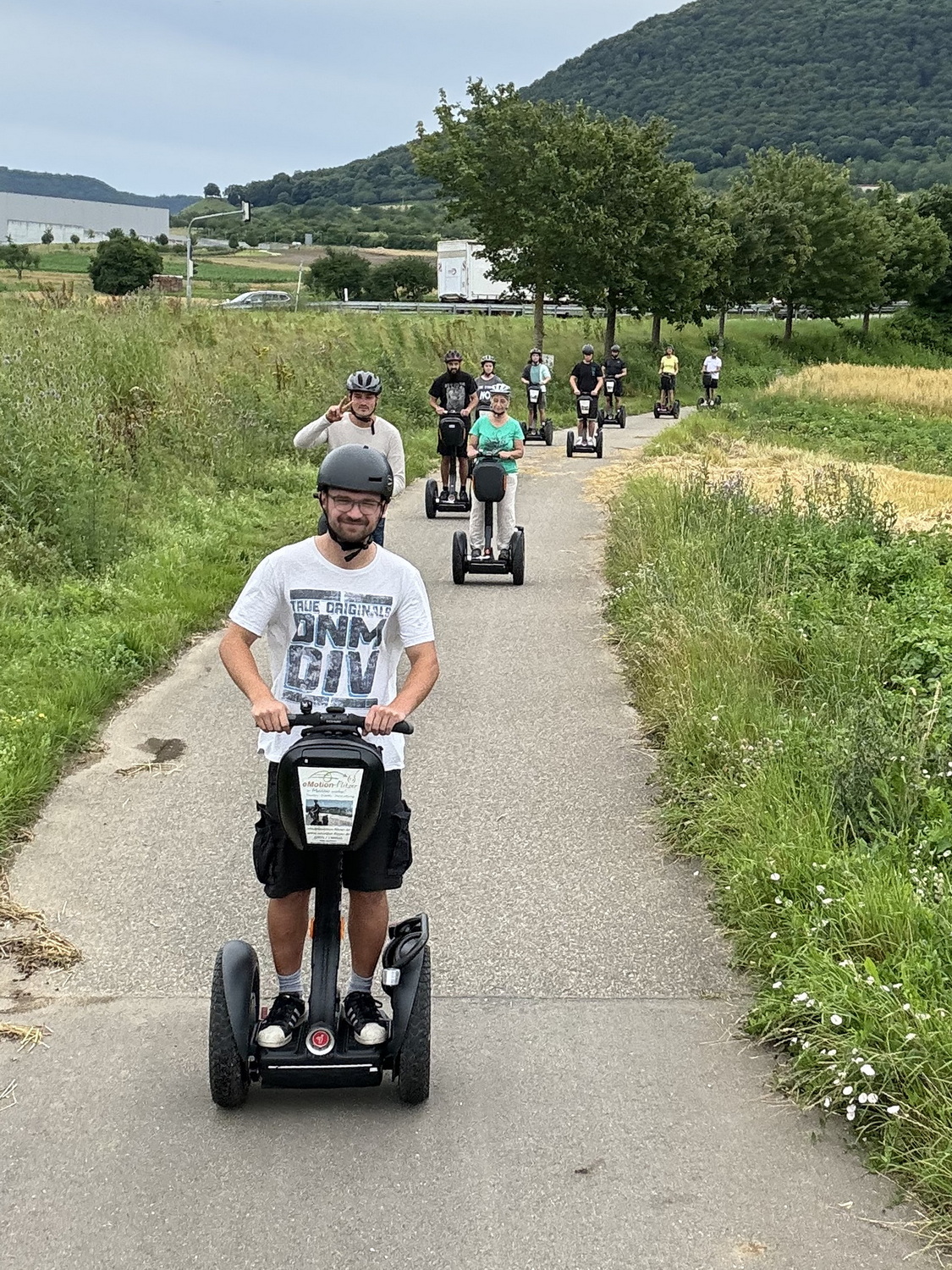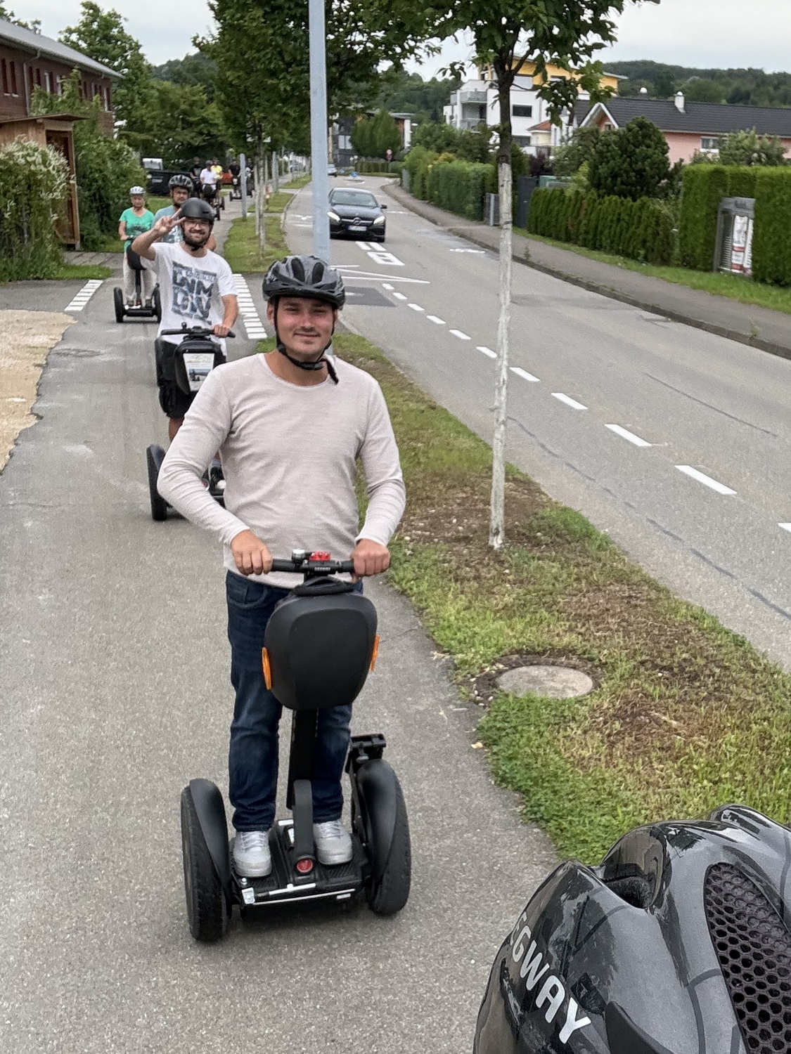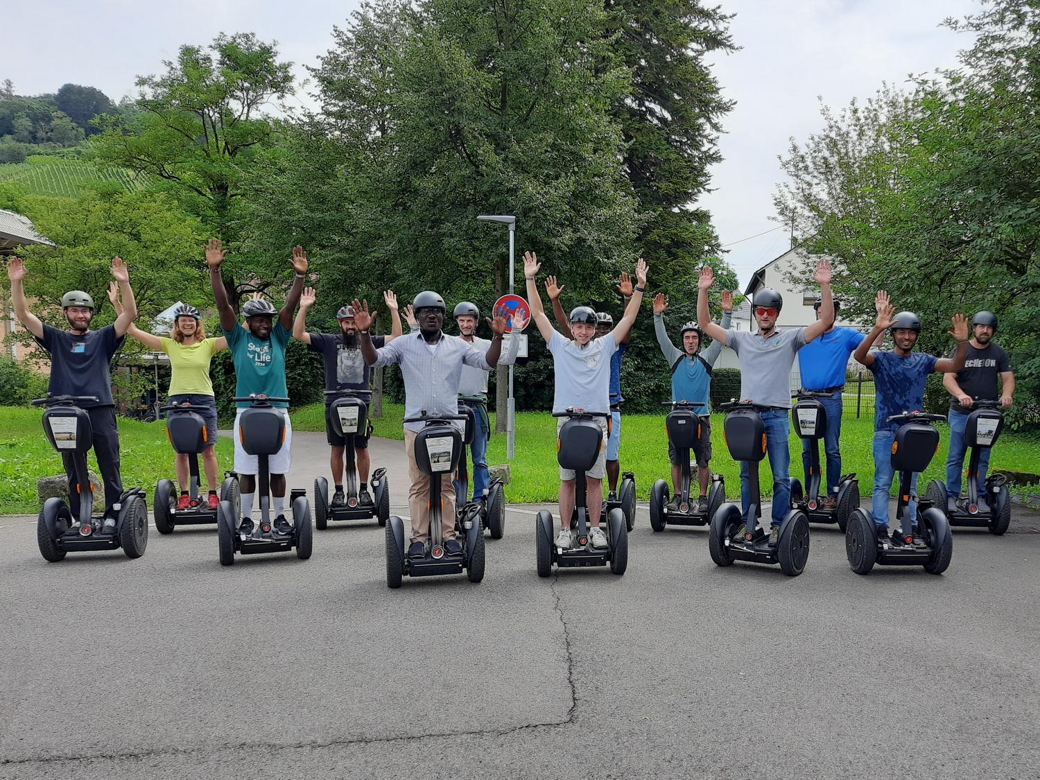 So stiegen die ProNatur-Mitarbeitenden nach ausführlicher Einweisung und einigen Übungs-Slaloms auf dem Parkplatz auf ihre Segways und machten sich gemeinsam mit den zwei Guides auf den Weg. Die anfängliche Unsicherheit auf den ungewohnten Fahrzeugen war schnell überwunden, so dass die Ausfahrt von Metzingen durchs Ermstal nach Dettingen und zurück für alle zu einem einzigartigen Erlebnis wurde.