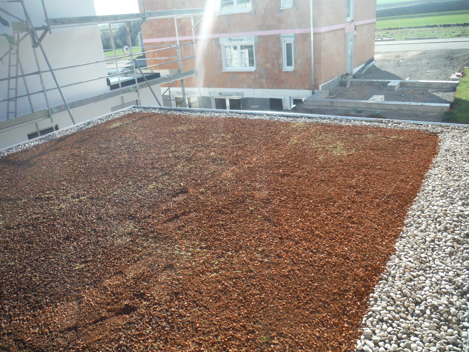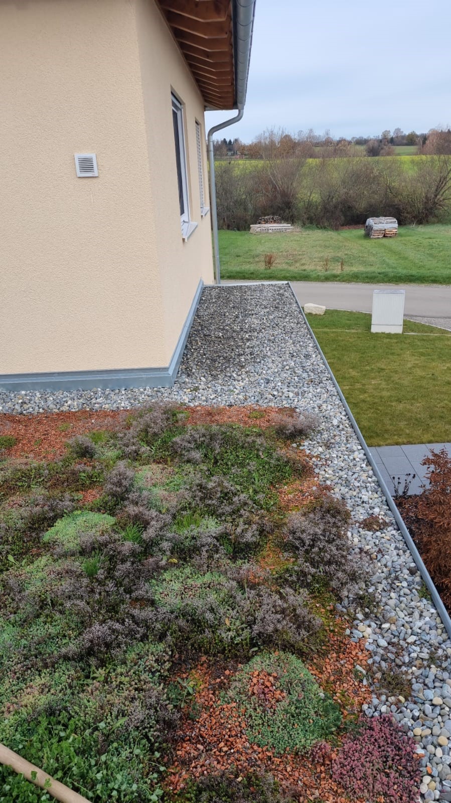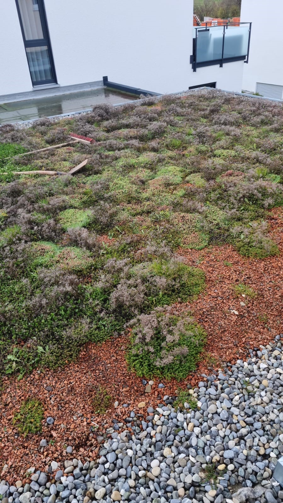 Anfang Februar 2023 haben wir eine direkt ans Haus angebaute Garage in Dusslingen im Landkreis Tübingen extensiv begrünt. Dabei wurden sogenannte Sedumsprossen ausgesät. Das sind kleine Pflanzenteile, die Wurzeln bilden und sich im Laufe der Zeit zu flächendeckenden Sedumpolstern entwickeln. Obwohl die Bauarbeiten am Haus noch nicht abgeschlossen waren und die Fläche nach der Ansaat noch Trittbelastung ausgesetzt war, haben wir bei einem Besuch im November 2024 festgestellt, dass sich die Begrünung gut entwickelt hat und im Laufe der Zeit sicherlich noch vollständig schließen wird. Das zeigt uns wieder einmal, dass eine Ansaat von Sedumsprossen im Winter durchaus möglich ist – nicht nur auf Garagen, sondern auch bei unseren großen bis sehr großen Dachbegrünungsprojekten.
