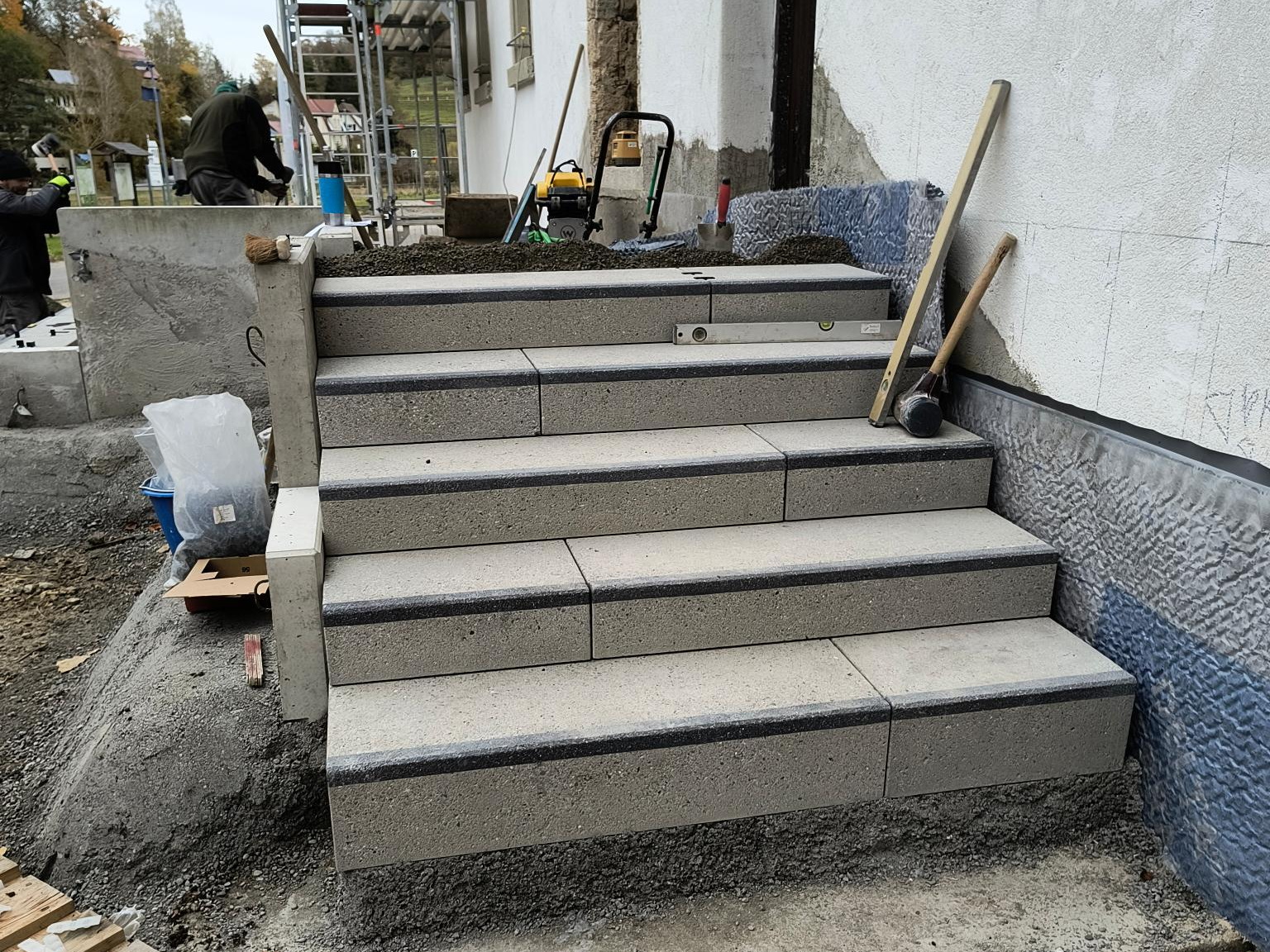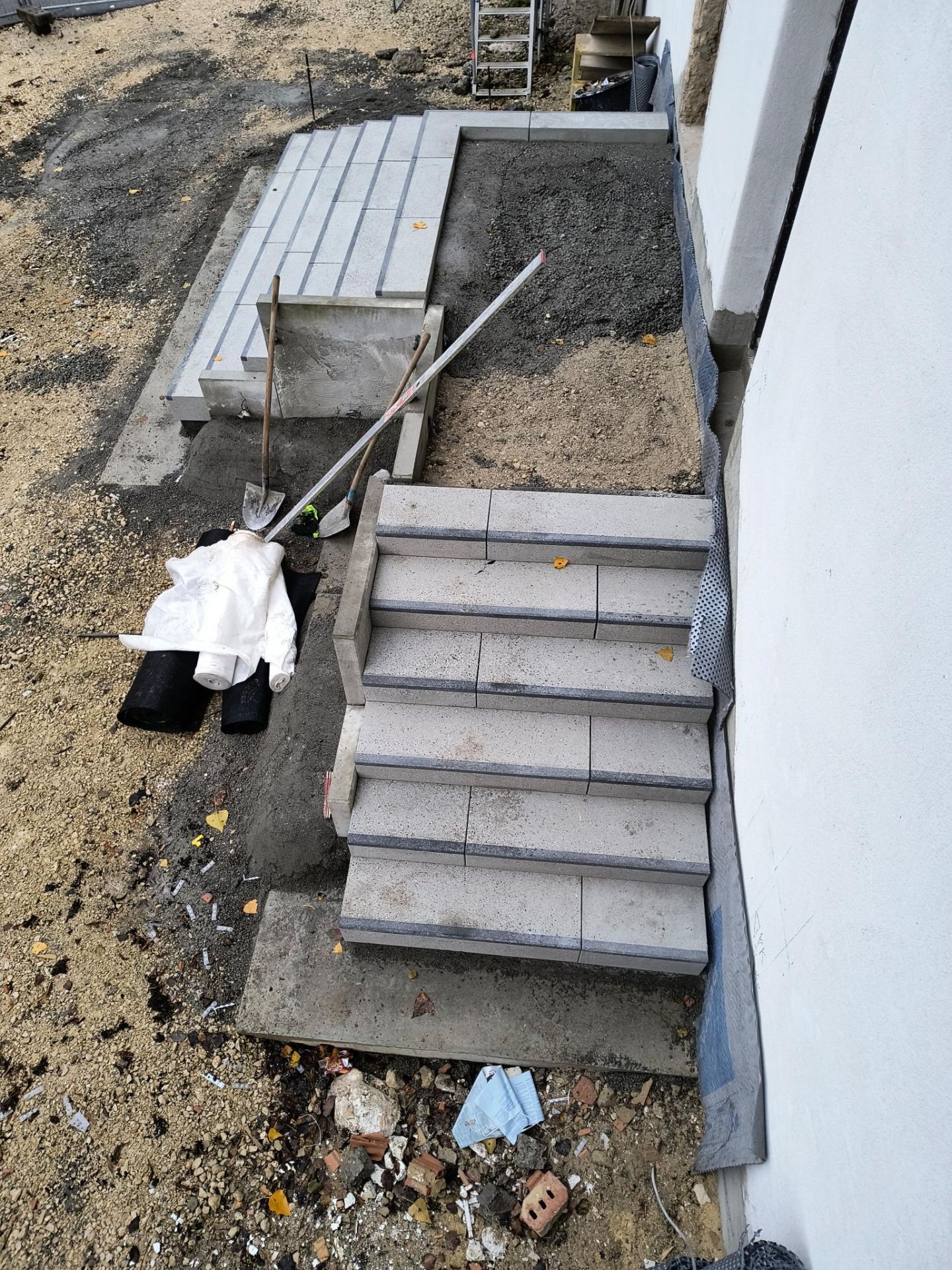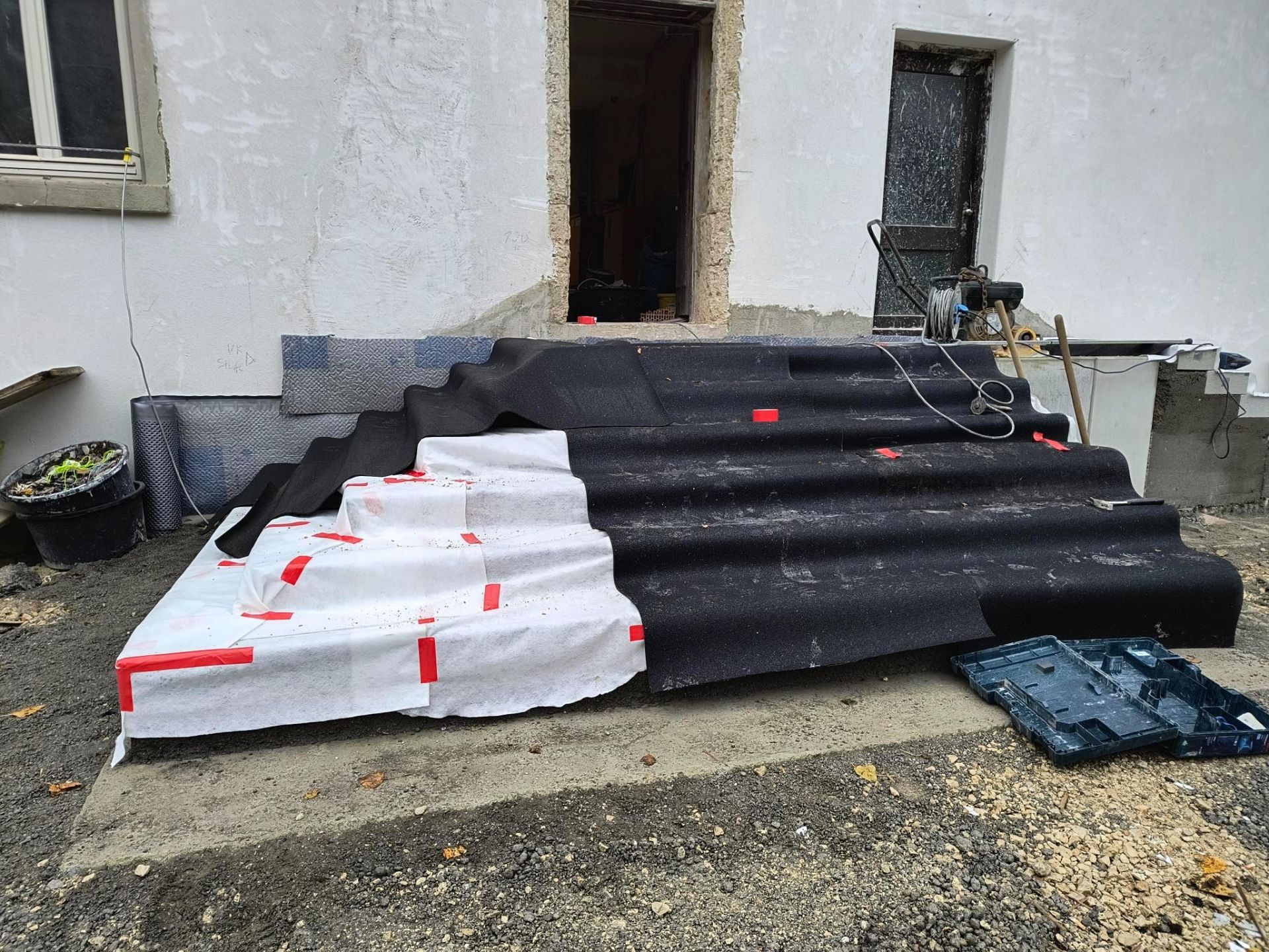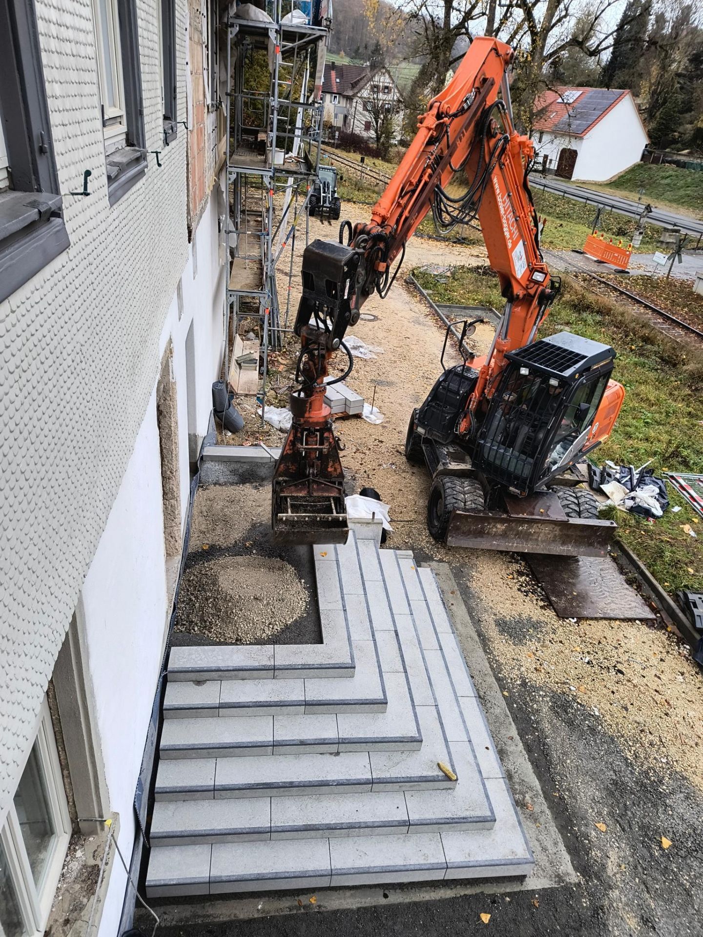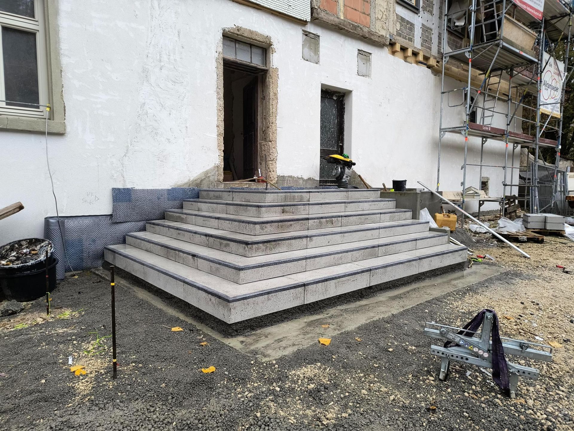 Die bereits Mitte 2022 beauftragten Arbeiten an den Außenanlagen des Gestütshofs in Offenhausen haben sich aufgrund von Auflagen des Denkmalschutzes stark verzögert. Nun konnten wir endlich wieder aktiv werden: um einen Zugang für die denkmalgerechte Gebäudesanierung zu schaffen, haben wir kürzlich die Freitreppe zum Gasthof gebaut. Diese wurde zum Schutz vor Beschädigungen und Verschmutzung nach Fertigstellung abgedeckt. Nun folgen Renovierungsarbeiten im Gebäudeinneren und an der Fassade, bevor wir dann hoffentlich im Jahr 2024 die weitere Gestaltung der Außenanlagen in Angriff nehmen können.