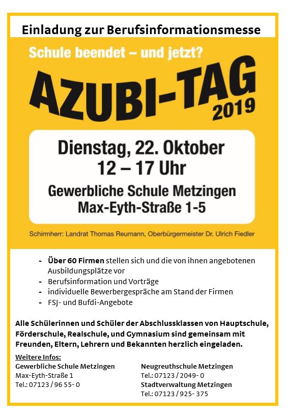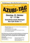 Am 23.10.2018 von 12 Uhr bis 17 Uhr findet in der Gewerblichen Schule in Metzingen der AZUBI Tag für interessierte Schüler/innen und Eltern statt.