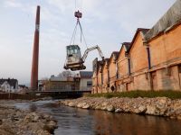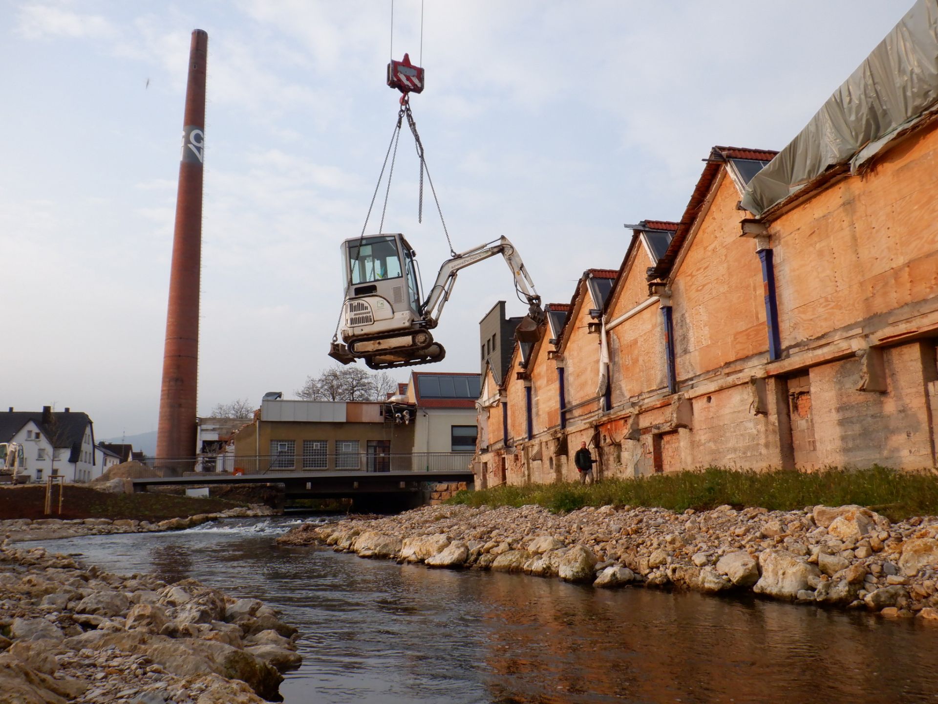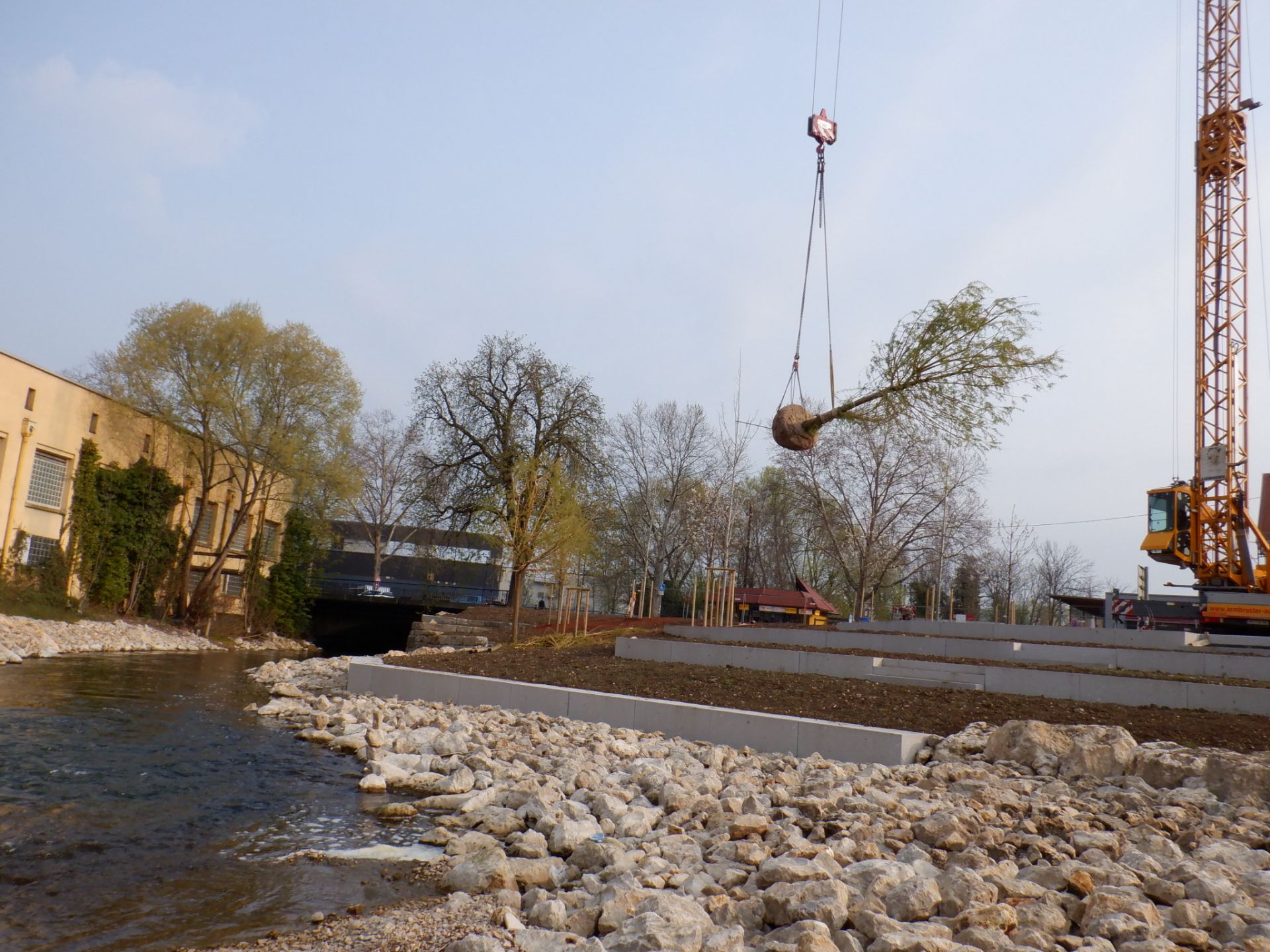 Die spektakuläre Anlieferung von mehreren Großbäumen über das Ermsufer hinweg schließt die