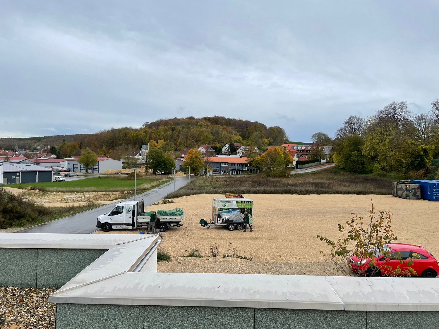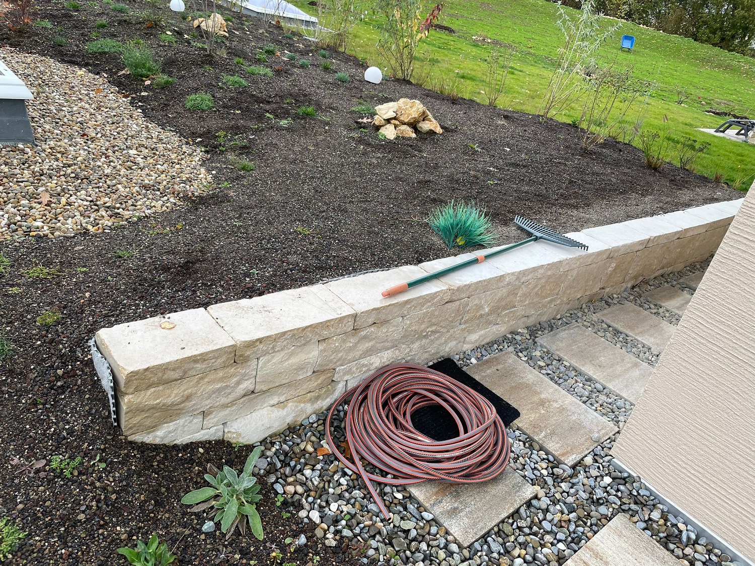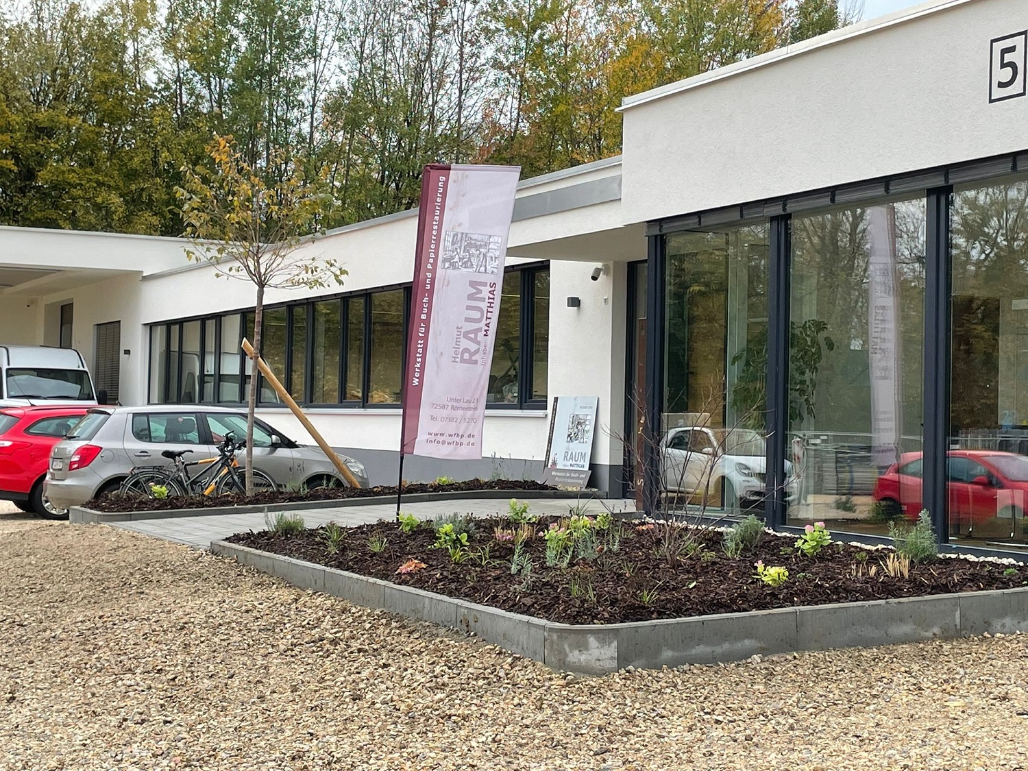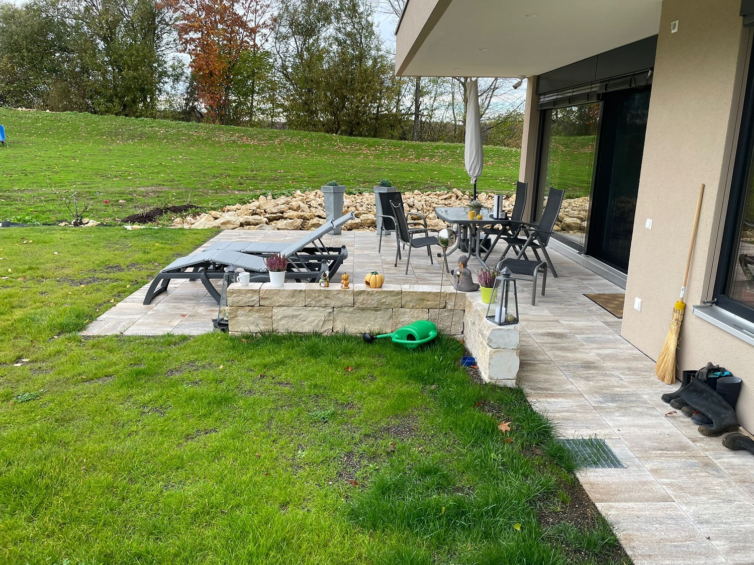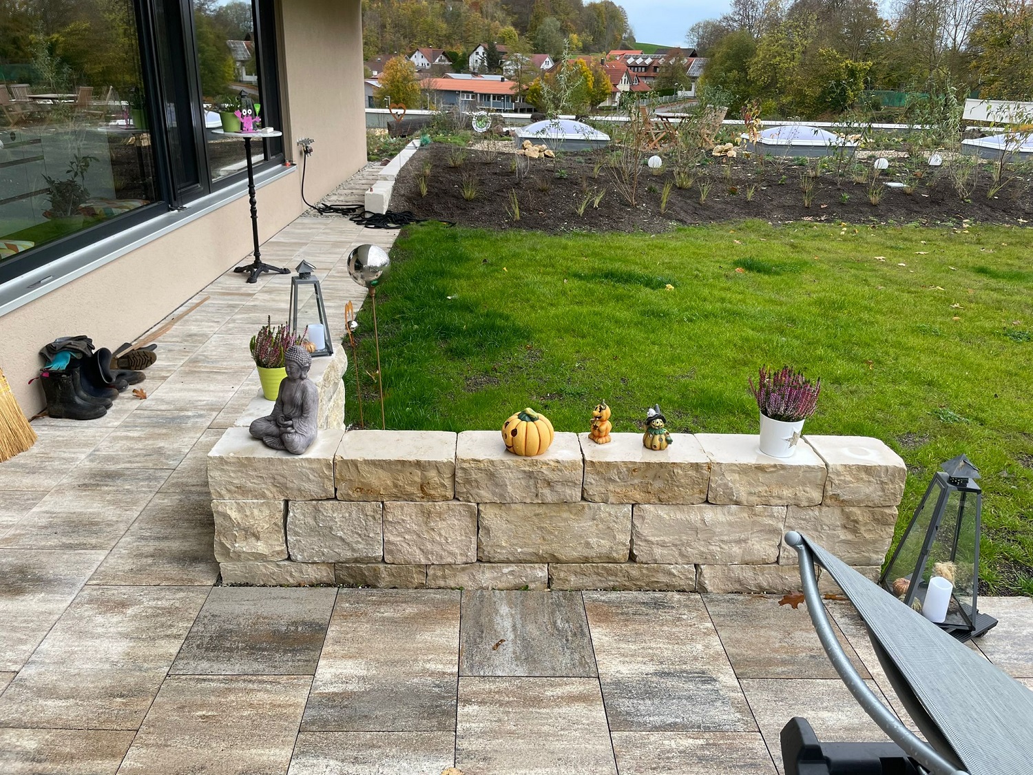 Im Frühjahr 2023 waren wir wieder im Böhringen, um an dem Projekt weiterzuarbeiten, das auch einen Insect-Respect-Bereich aufweist. Aktuell haben wir uns jedoch der Fertigstellung der Terrasse und der Gestaltung von Innenhof und Parkplatz gewidmet. Der Innenhof, der von Geschäftsräumen umschlossen wird, wurde als Steingarten mit Sitzgelegenheit gestaltet. Die Terrasse hat einen Plattenbelag sowie eine niedrige Natursteinmauer erhalten. Auch der Insect-Respect-Bereich wurde mit einer solchen Mauer zum Haus hin abgegrenzt. Die Zugänge vom Parkplatz zum Haus sind bereits fertig gepflastert, demnächst sollen die Stellplätze auf dem Parkplatz mit Schotterrasen gestaltet werden.