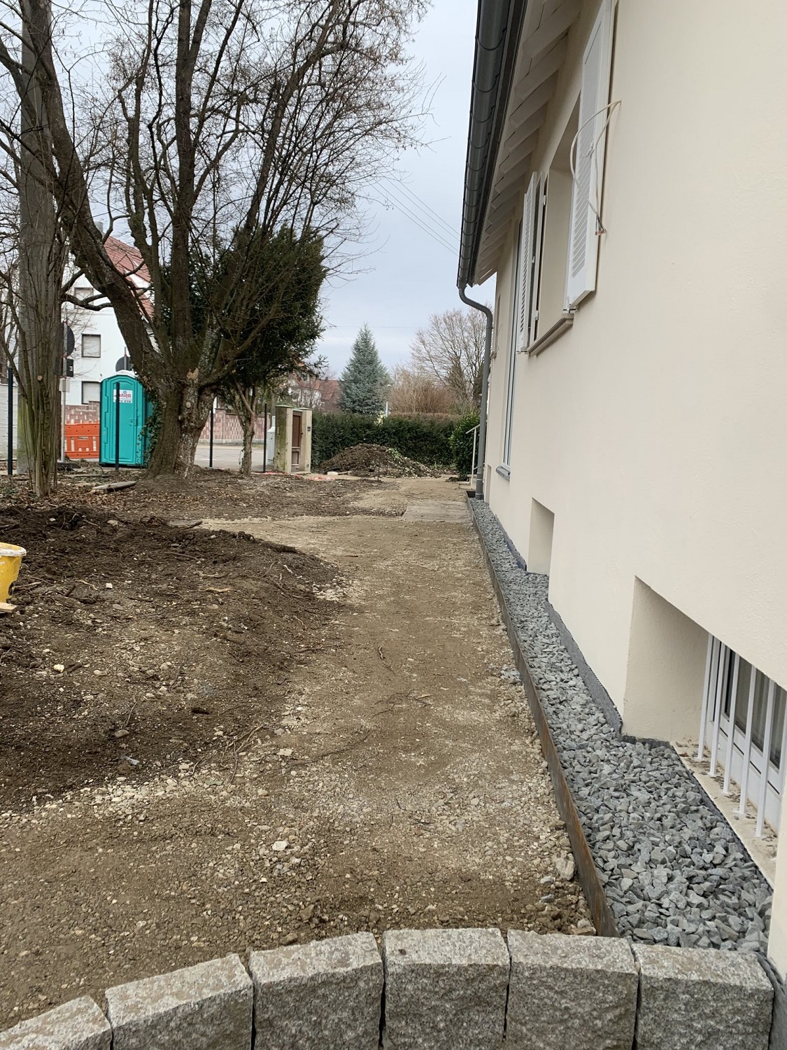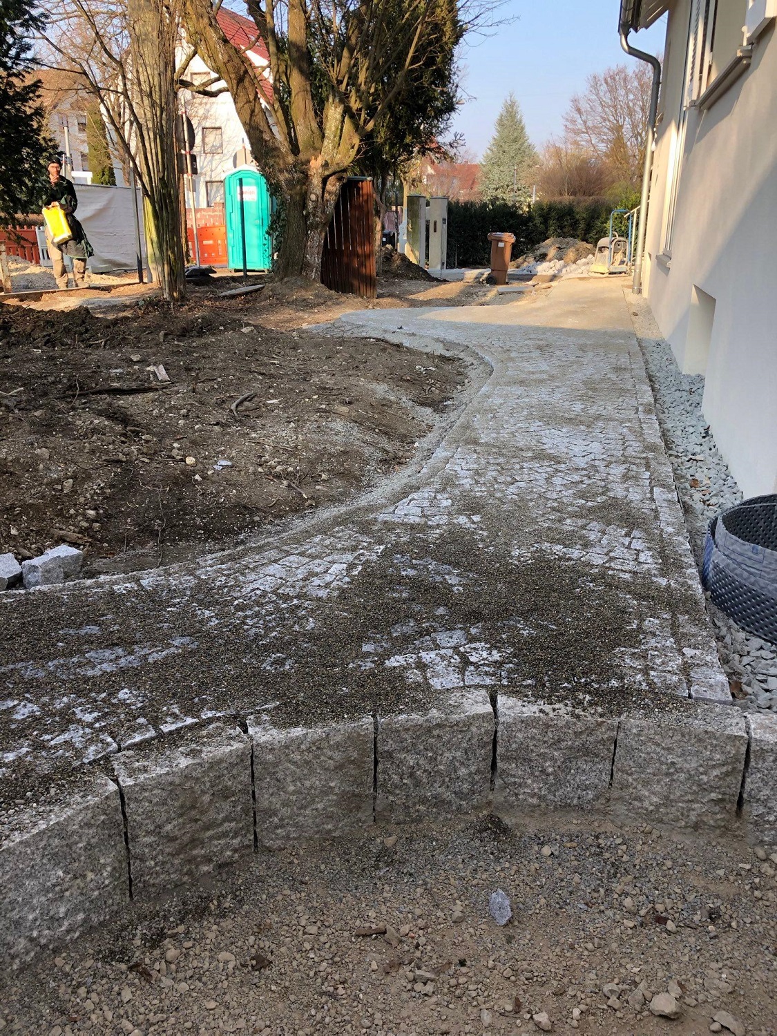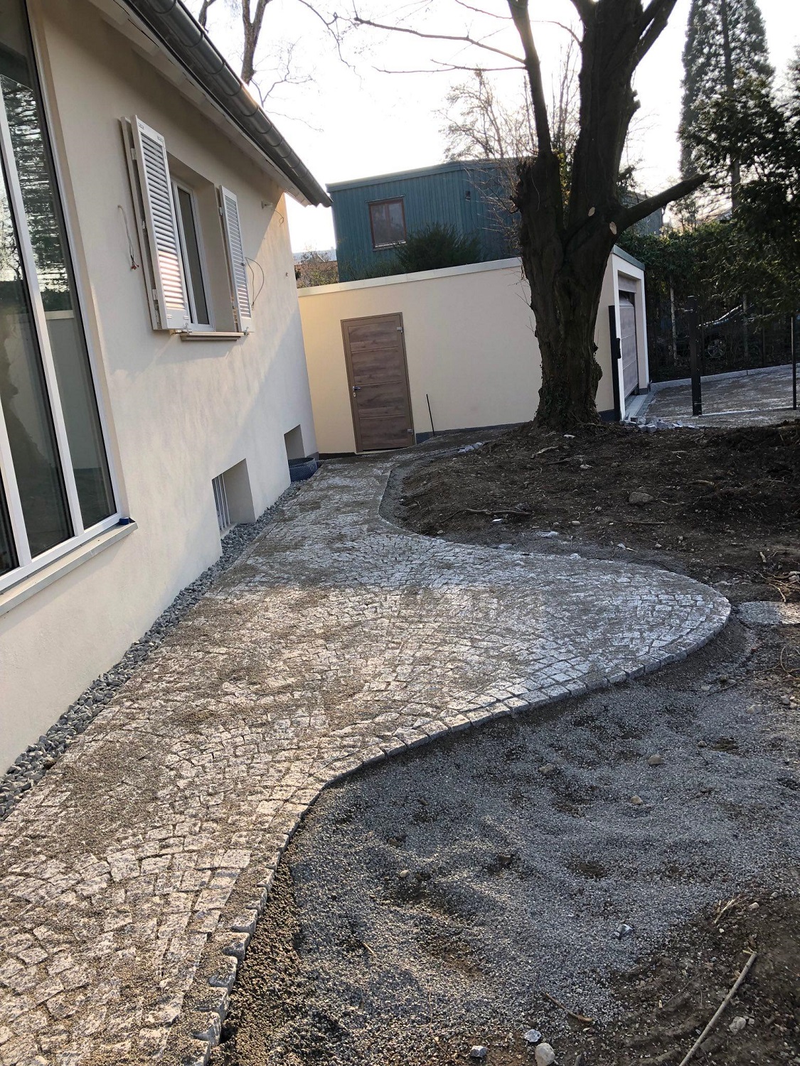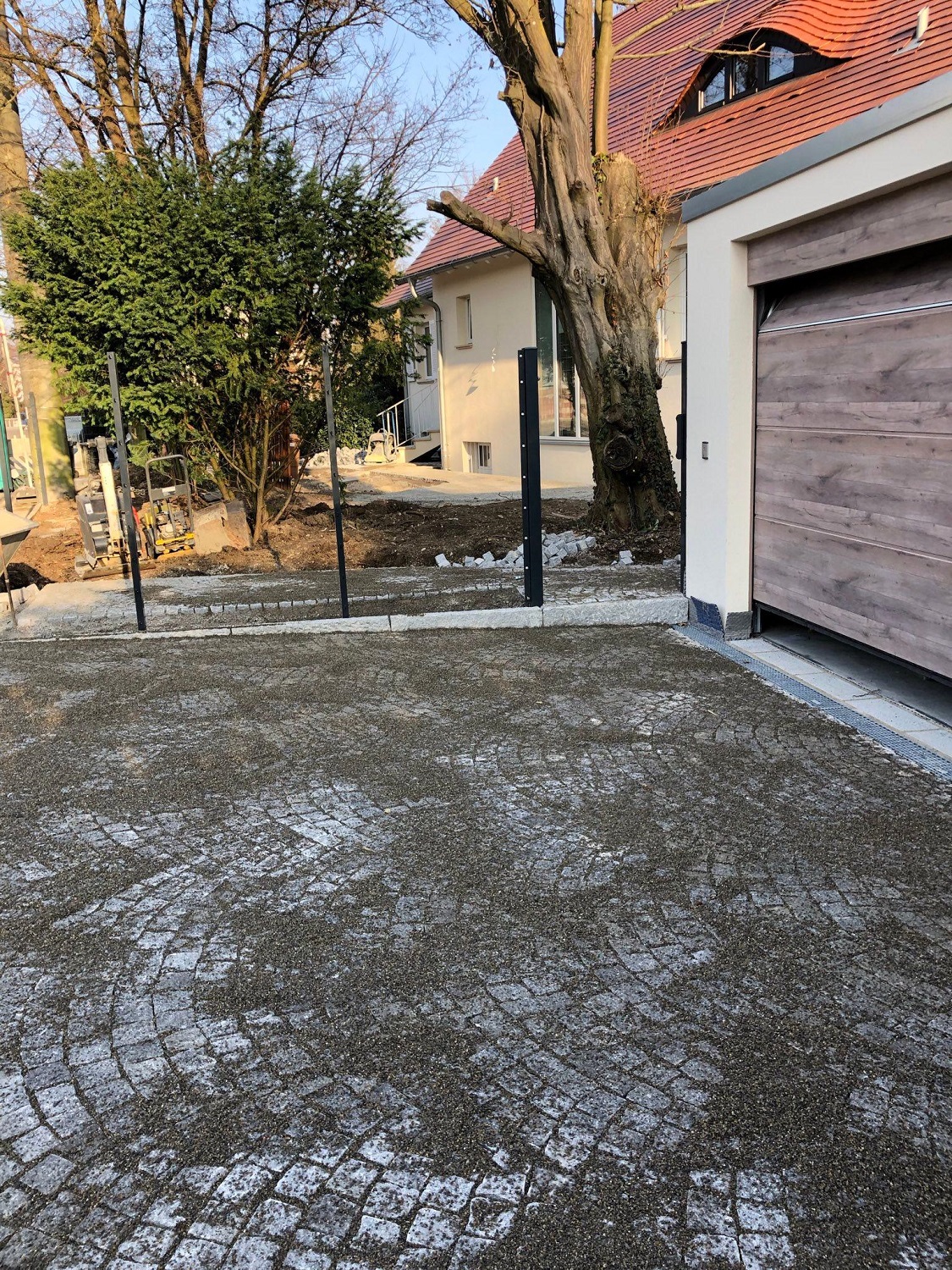 Inzwischen sind die Pflasterarbeiten weitgehend abgeschlossen. Schön geschwungene Wege aus Granit durchziehen nun den Garten. Mit demselben Material wurde auch der Platz vor der freistehenden Garage gepflastert. Zur Überwindung von Höhenunterschieden haben wir Stufen gesetzt. Neben der Abfahrt zur tiefer liegenden Garage wurde eine Stützmauer errichtet. Bis Mitte März bauen wir noch Substrat ein und pflanzen die Hecke entlang der Straße.
