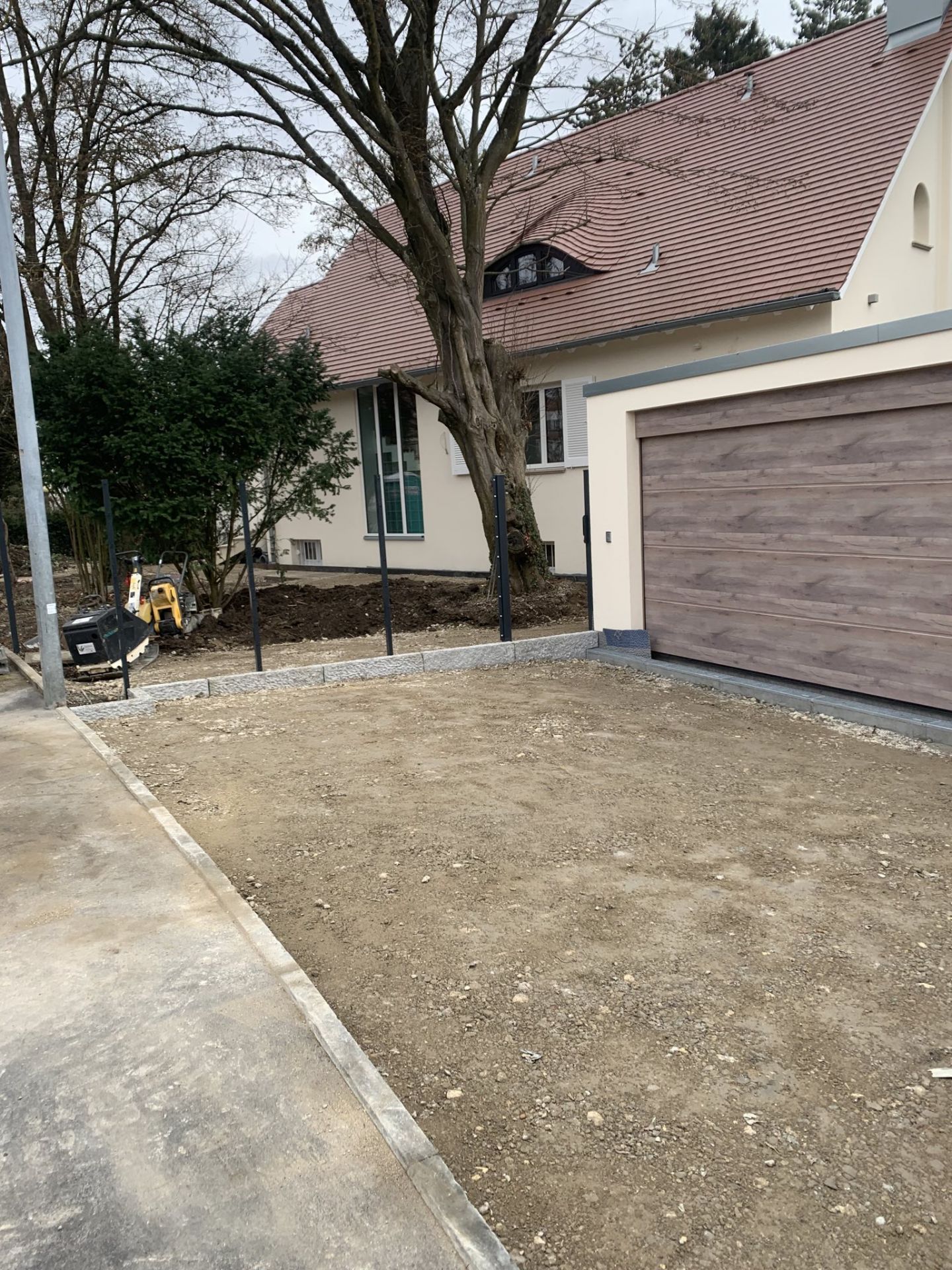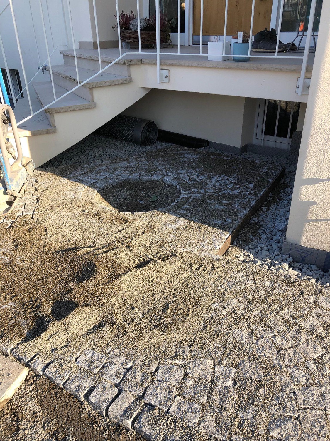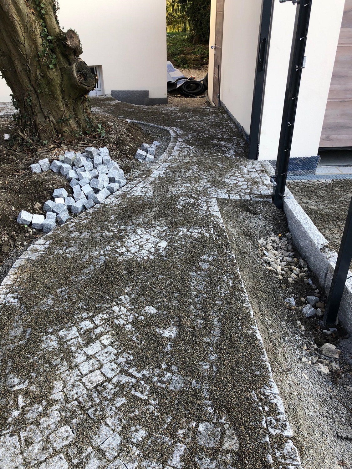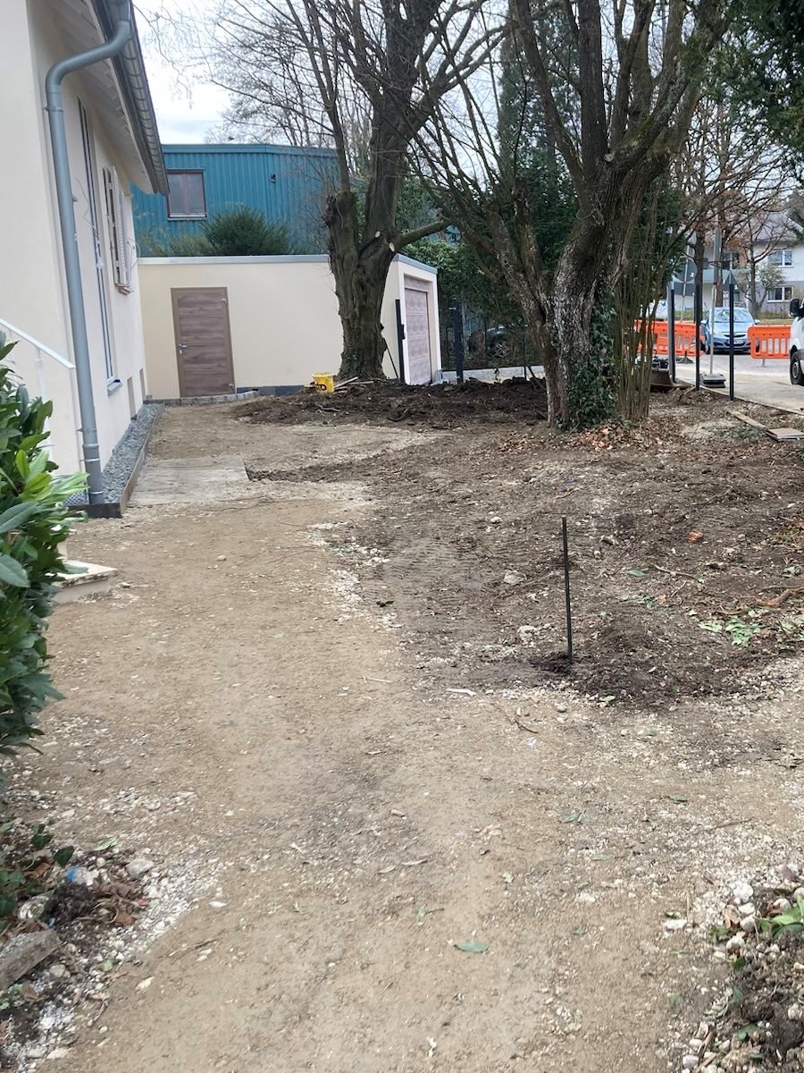 Inzwischen sind die Pflasterarbeiten weitgehend abgeschlossen. Schön geschwungene Wege aus Granit durchziehen nun den Garten. Mit demselben Material wurde auch der Platz vor der freistehenden Garage gepflastert. Zur Überwindung von Höhenunterschieden haben wir Stufen gesetzt. Neben der Abfahrt zur tiefer liegenden Garage wurde eine Stützmauer errichtet. Bis Mitte März bauen wir noch Substrat ein und pflanzen die Hecke entlang der Straße.