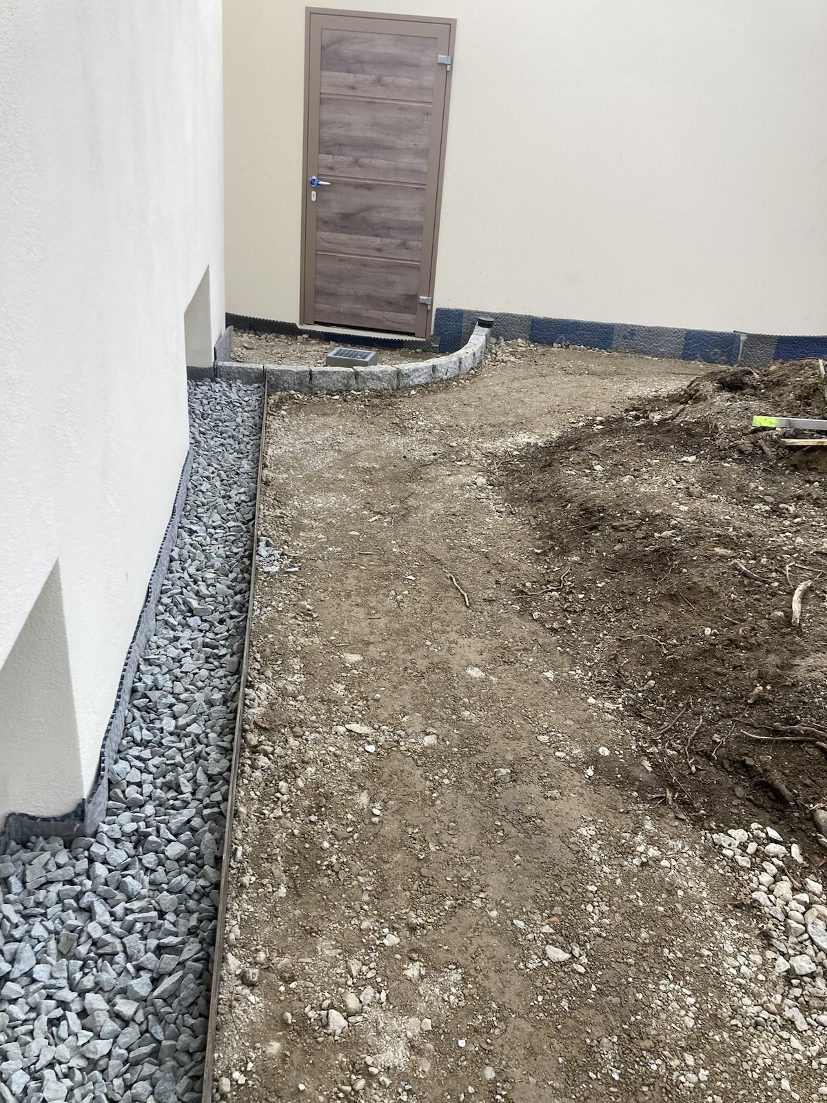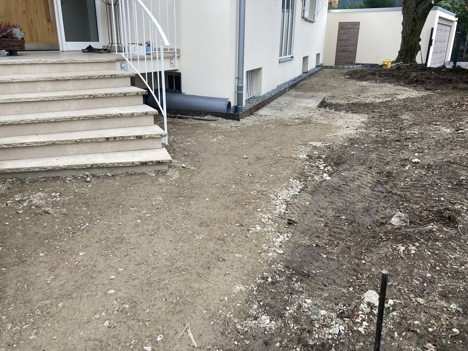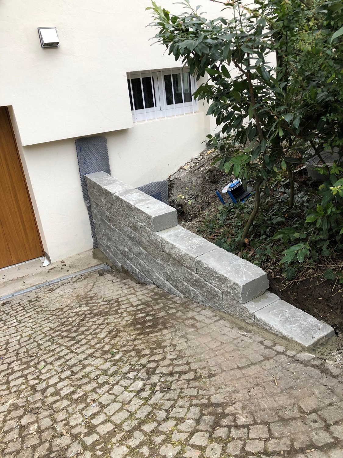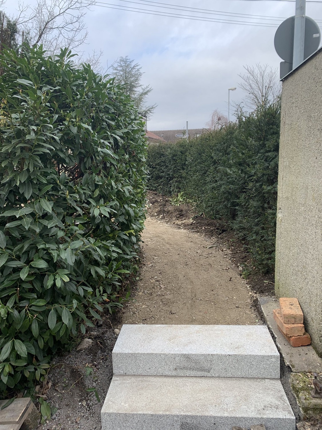 Inzwischen sind die Pflasterarbeiten weitgehend abgeschlossen. Schön geschwungene Wege aus Granit durchziehen nun den Garten. Mit demselben Material wurde auch der Platz vor der freistehenden Garage gepflastert. Zur Überwindung von Höhenunterschieden haben wir Stufen gesetzt. Neben der Abfahrt zur tiefer liegenden Garage wurde eine Stützmauer errichtet. Bis Mitte März bauen wir noch Substrat ein und pflanzen die Hecke entlang der Straße.