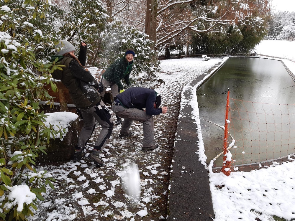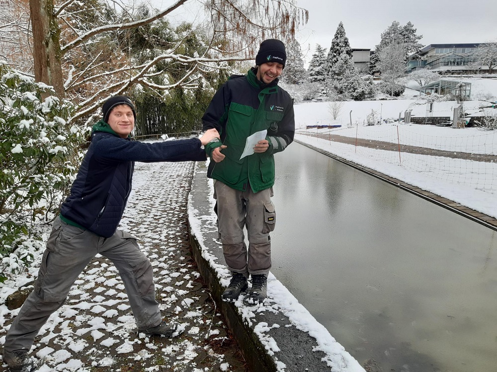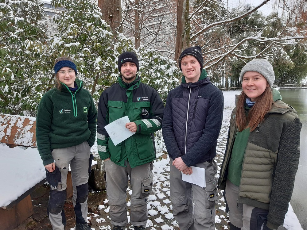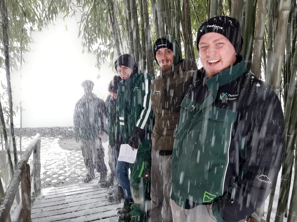 Mitte Januar organisierte Ausbilder Hans-Jörg Kämmerle für die aktuell zwölf Auszubildenden von ProNatur einen Ausflug in den Botanischen Garten, bei dem die angehenden Gärtner*innen im Garten-/Landschaftsbau eine ganze Reihe Aufgaben zu bewältigen und Fragen zu beantworten hatten. Welche Pflanze wächst am Tag bis zu einem Meter? Wie lautet der botanische Name der lebenden Steine? Finde drei blühende Gehölze im Freiland – und vieles mehr. Neben neuen botanischen Kenntnissen kam auch der Spaß im frisch gefallenen Schnee nicht zu kurz.