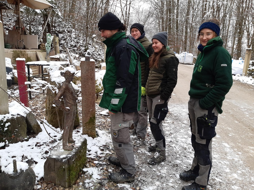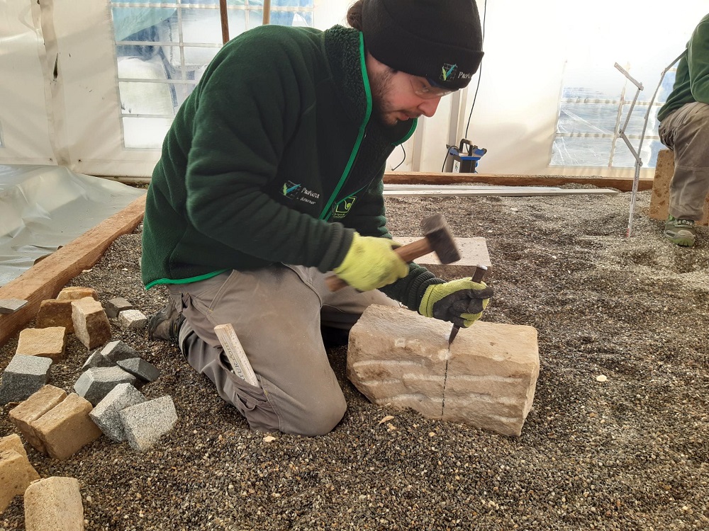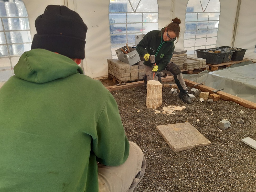 In der kalten Jahreszeit finden die Auszubildenden bei ProNatur immer wieder Zeitfenster, in denen handwerkliche Fertigkeiten wie die Naturstein-Bearbeitung, das Verlegen von Plattenbelägen oder der Treppenbau gelernt und geübt werden können. Mitte Januar beschäftigten sie sich mit Sand- und Kalksteinblöcken, die sie im beheizten Azubi-Zelt an der angezeichneten Stelle spalteten oder denen sie mit Hammer und Meißel die gewünschte Form verliehen. Krönender Abschluss der Lerneinheit war ein Besuch im Natursteinpark Rongen in Tübingen, wo verschiedenste Natursteine für den Garten- und Landschaftsbau bezogen werden können.