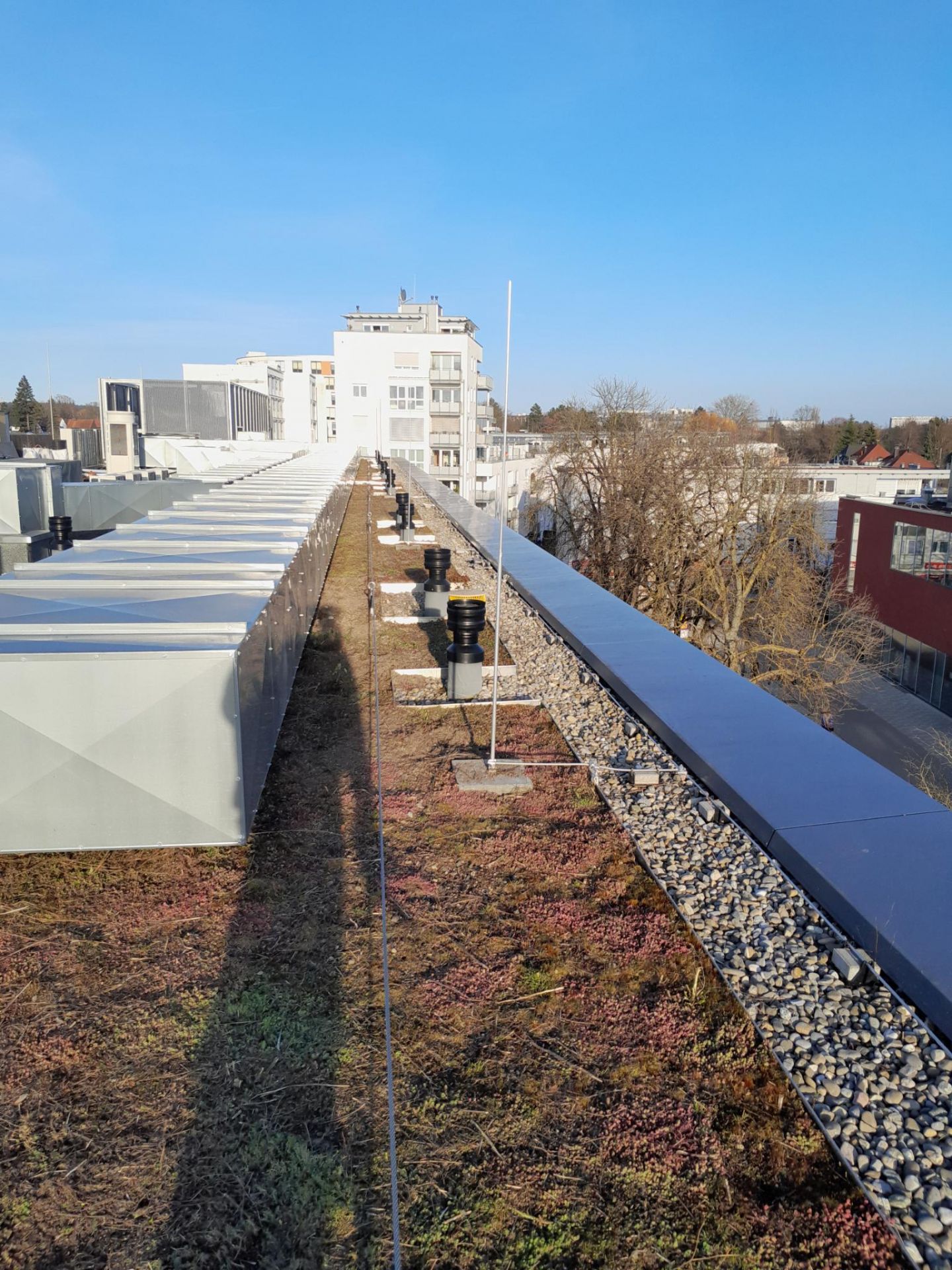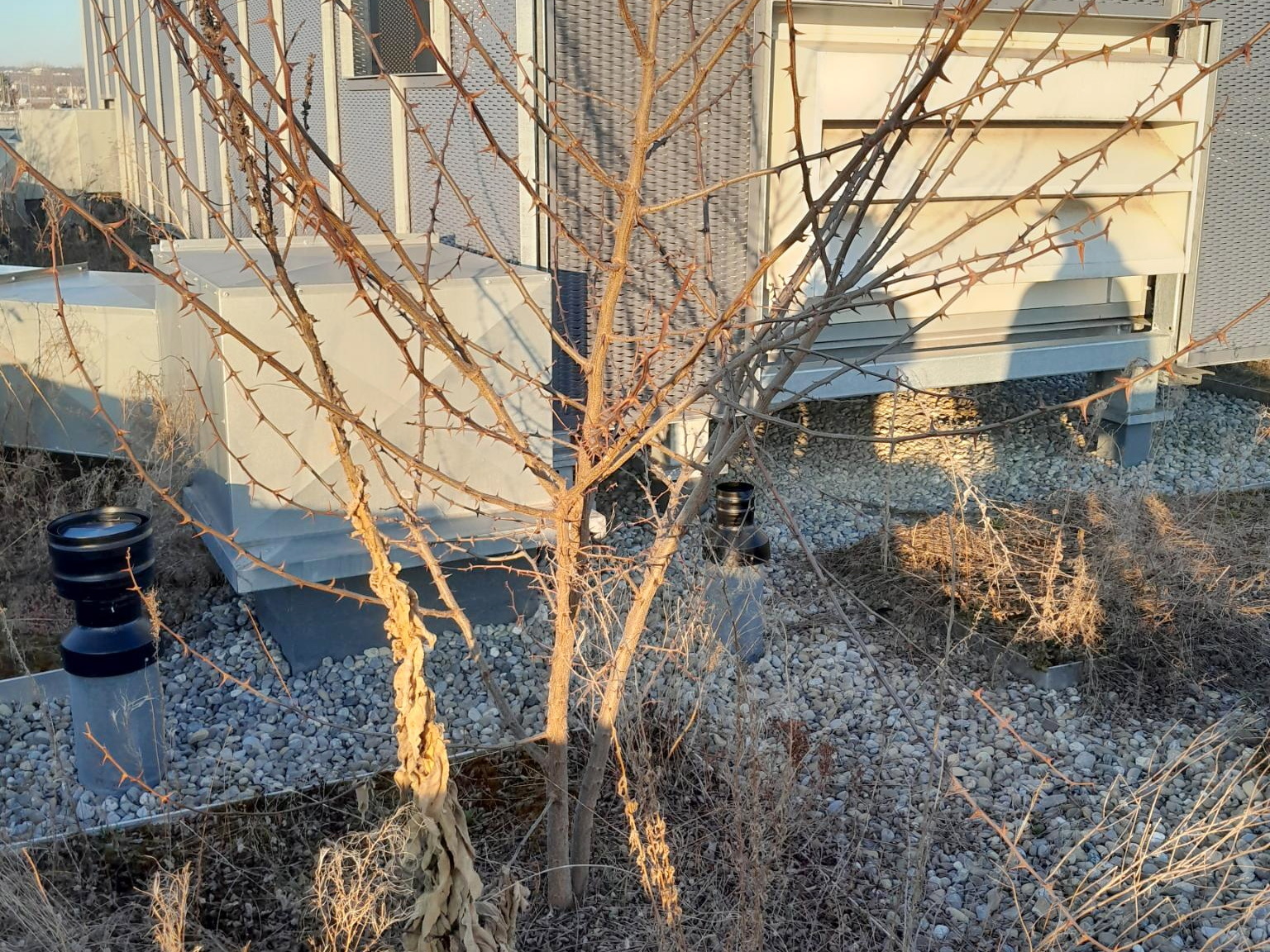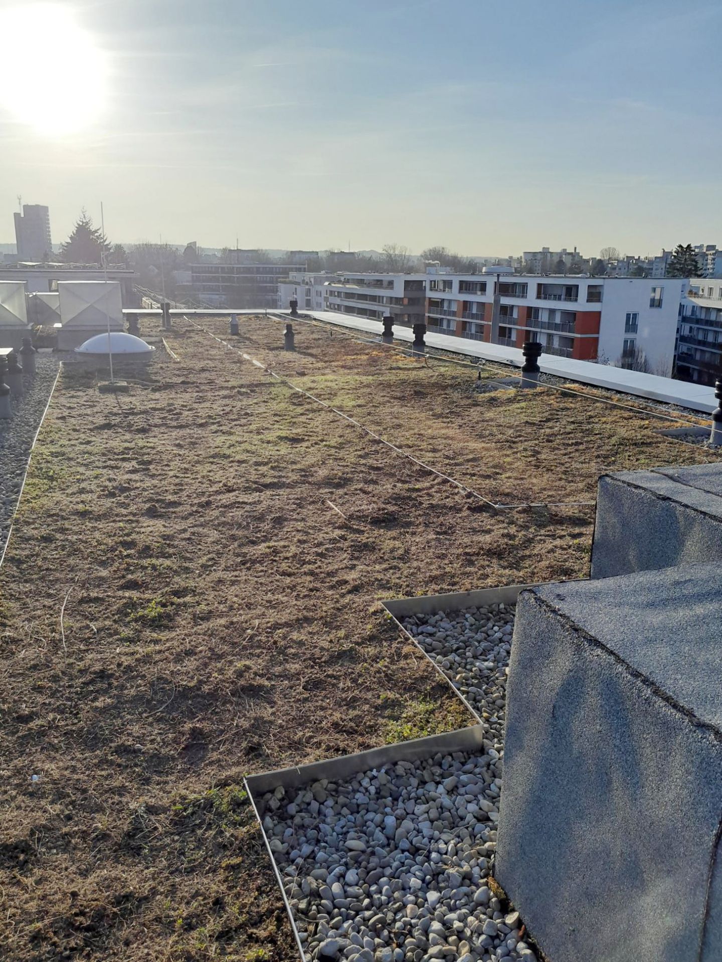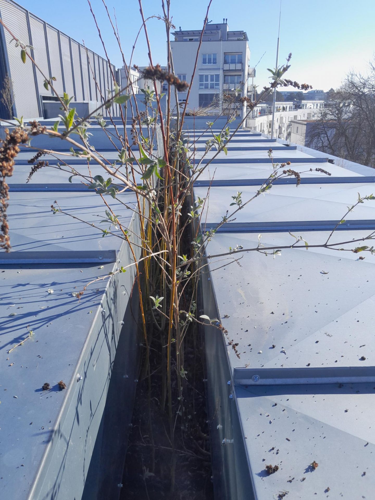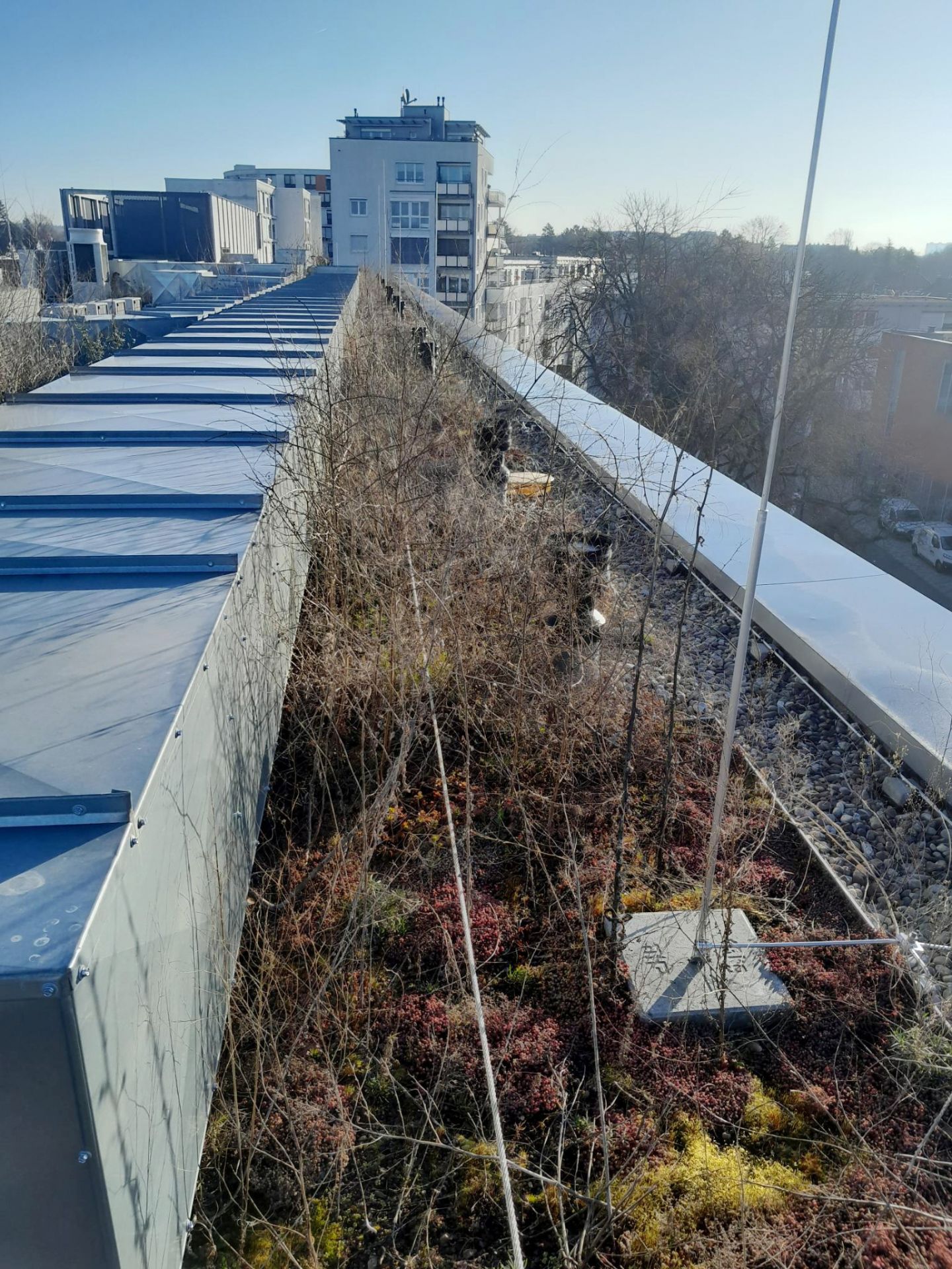 Hier war eine Pflege der Dachbegrünung mal wieder dringend nötig! Die vom Wind oder von Vögeln auf das Dach eingetragenen Gehölze schädigen sonst im Laufe der Zeit die technischen Einrichtungen und/oder die Dachhaut. Zudem verringert die Verschattung durch die Gehölze die Energieausbeute einer ggf. vorhandenen Photovoltaik-Anlage. Wir empfehlen daher, Gründächer mindestens einmal jährlich zu warten.