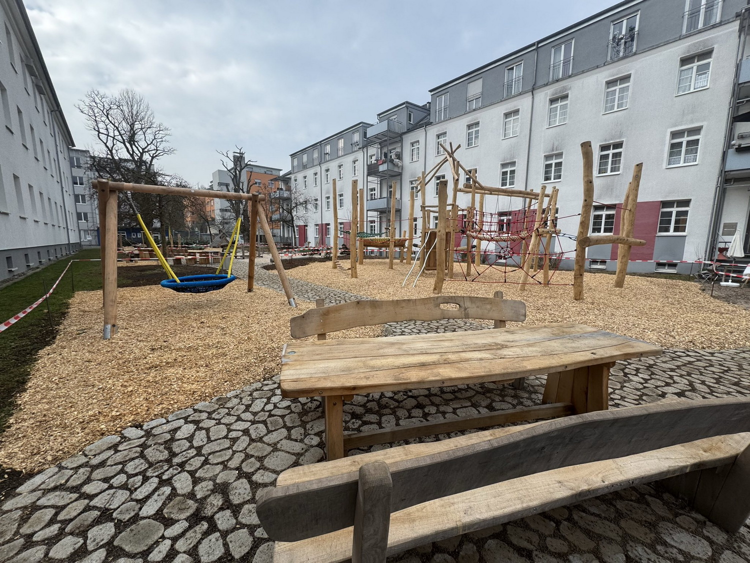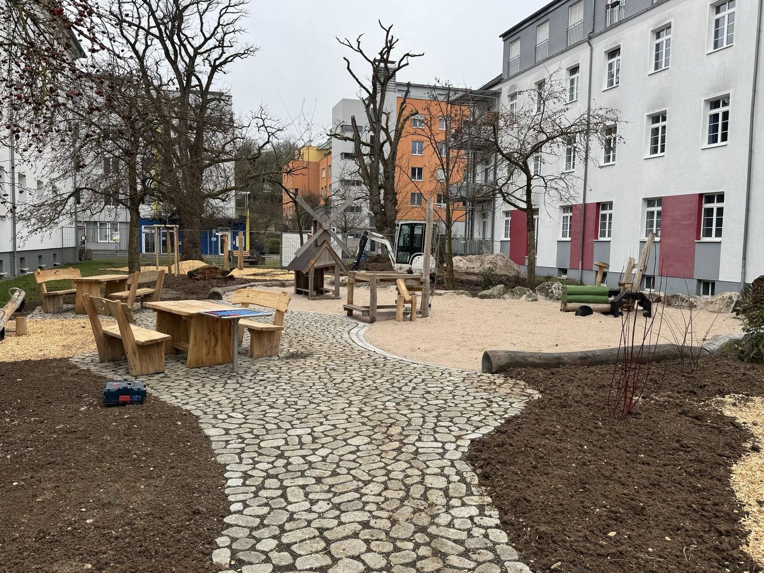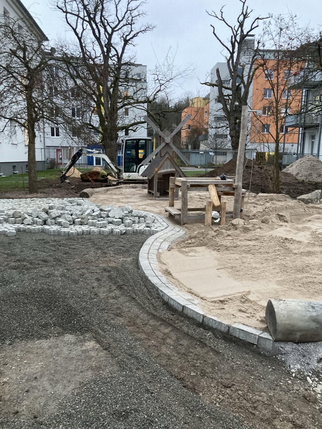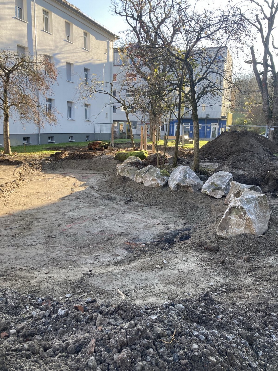 Die Arbeiten am dringend sanierungsbedürftigen Spielplatz begannen im November 2024 und dauerten mit wetter- und feiertagsbedingten Unterbrechungen bis Ende Januar 2025. Geplant von der Stadt Tübingen und ausgeführt von ProNatur, wurde das Gelände zwischen den Wohnblöcken des Französischen Viertels mit neuen Spielgeräten und attraktiven Grünbereichen ausgestattet. Einige Bestandselemente wie alte Bäume und große Felsbrocken finden sich in der neuen Anlage wieder.