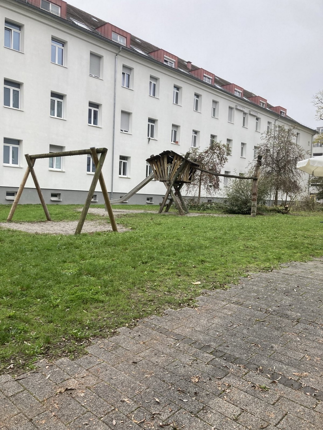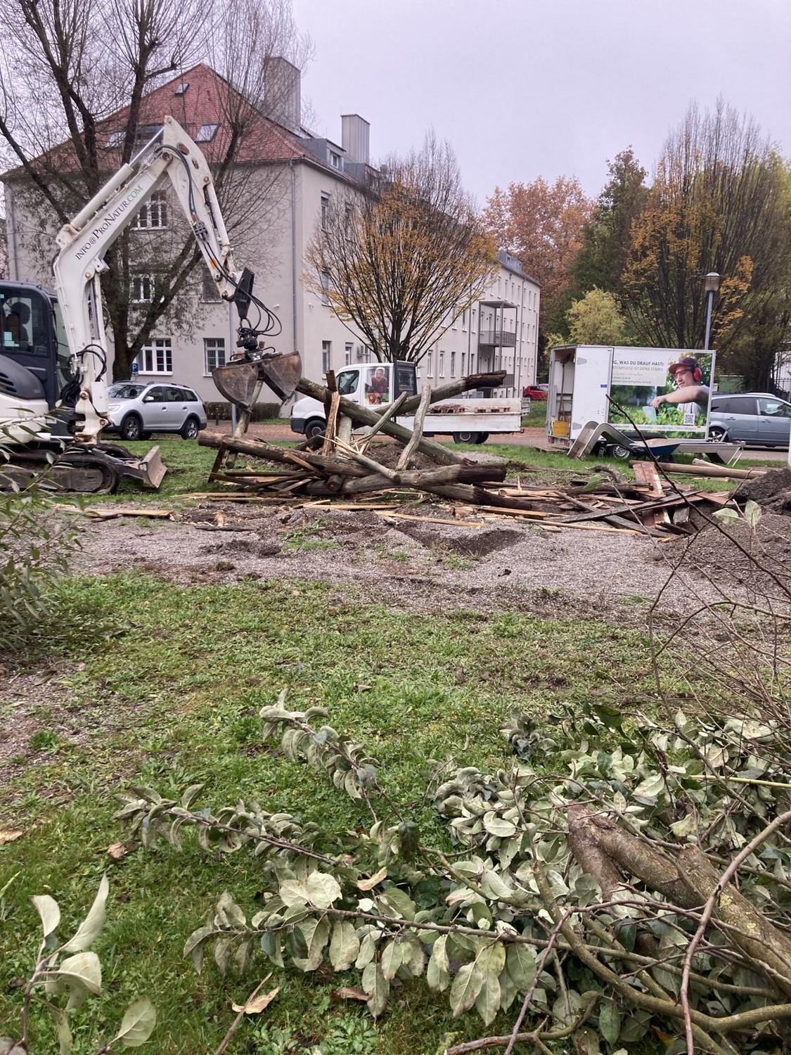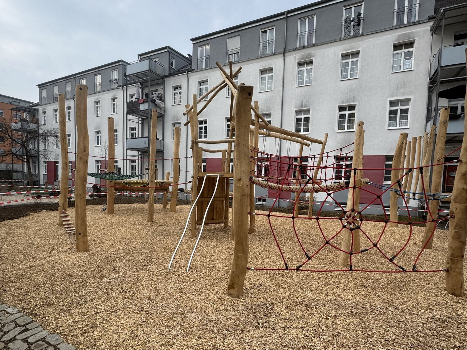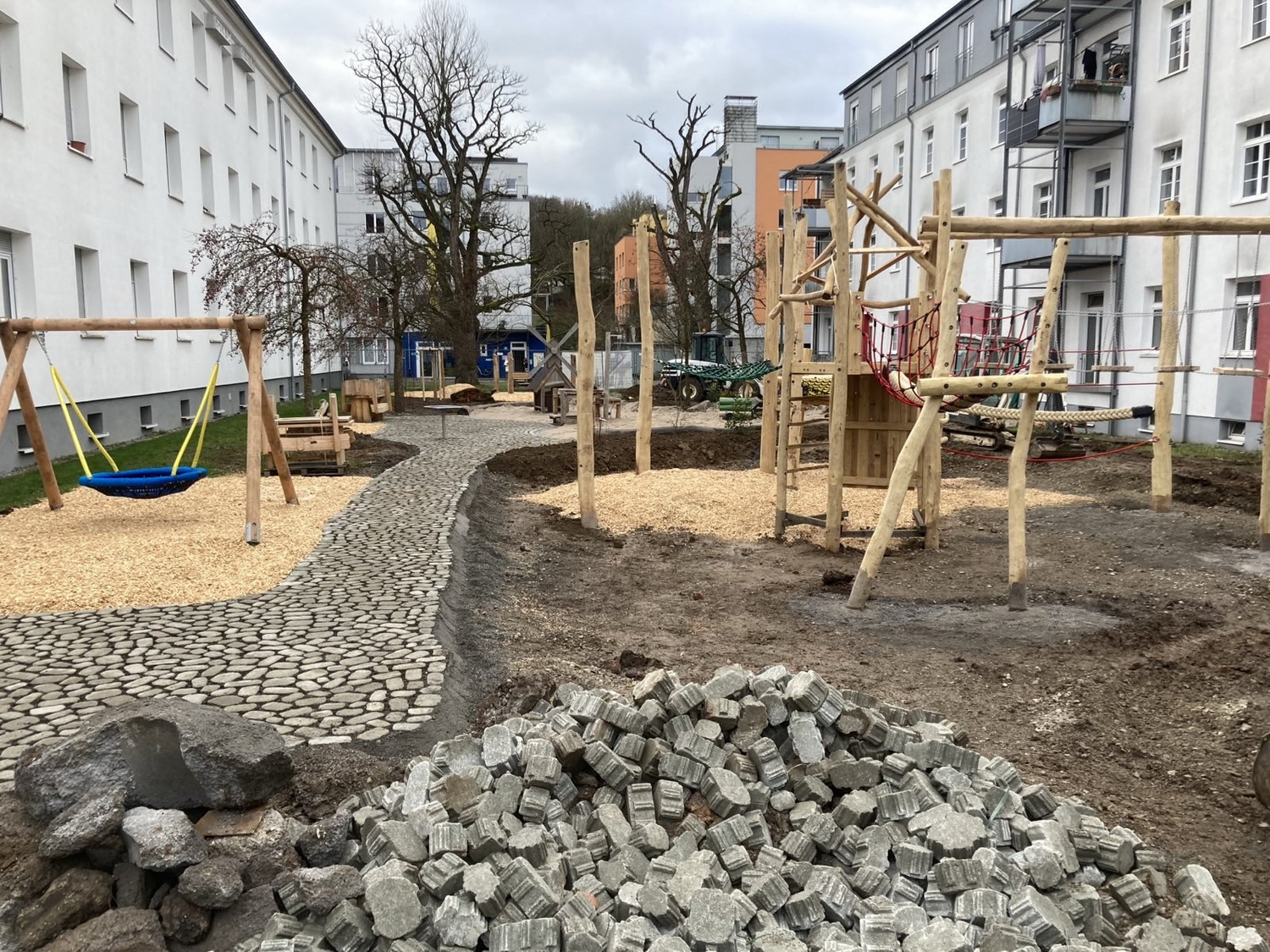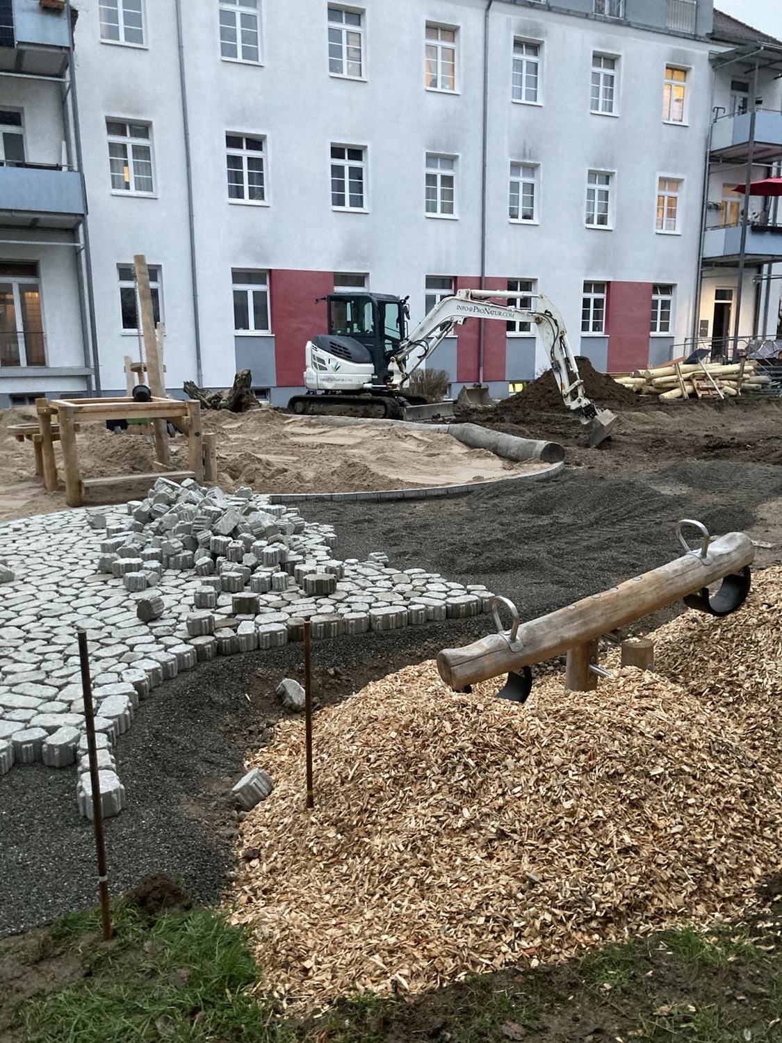 Die Arbeiten am dringend sanierungsbedürftigen Spielplatz begannen im November 2024 und dauerten mit wetter- und feiertagsbedingten Unterbrechungen bis Ende Januar 2025. Geplant von der Stadt Tübingen und ausgeführt von ProNatur, wurde das Gelände zwischen den Wohnblöcken des Französischen Viertels mit neuen Spielgeräten und attraktiven Grünbereichen ausgestattet. Einige Bestandselemente wie alte Bäume und große Felsbrocken finden sich in der neuen Anlage wieder.
