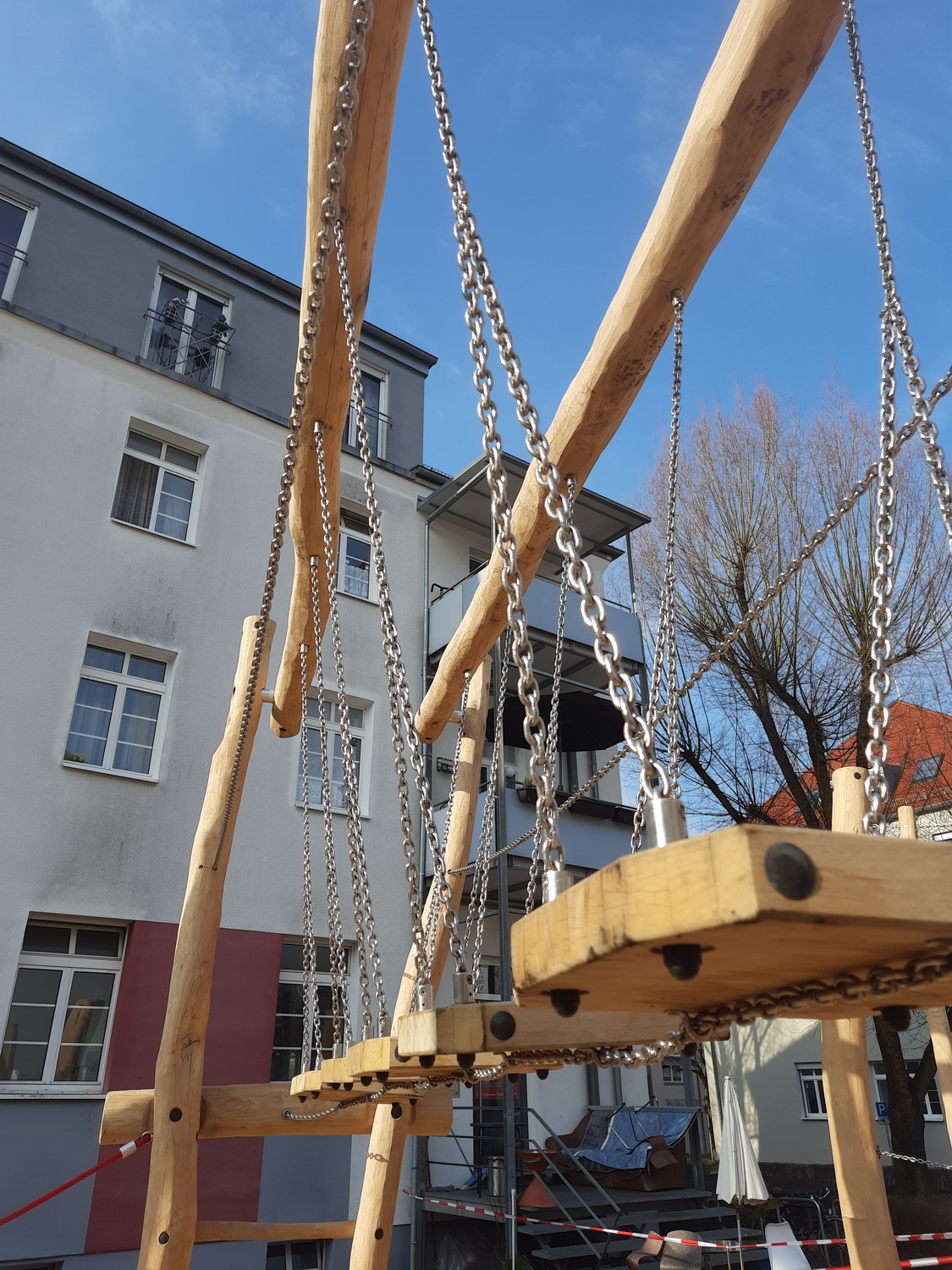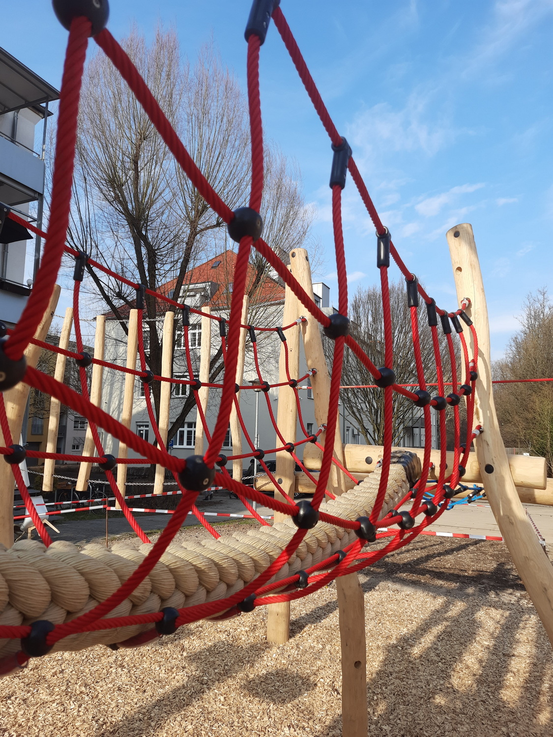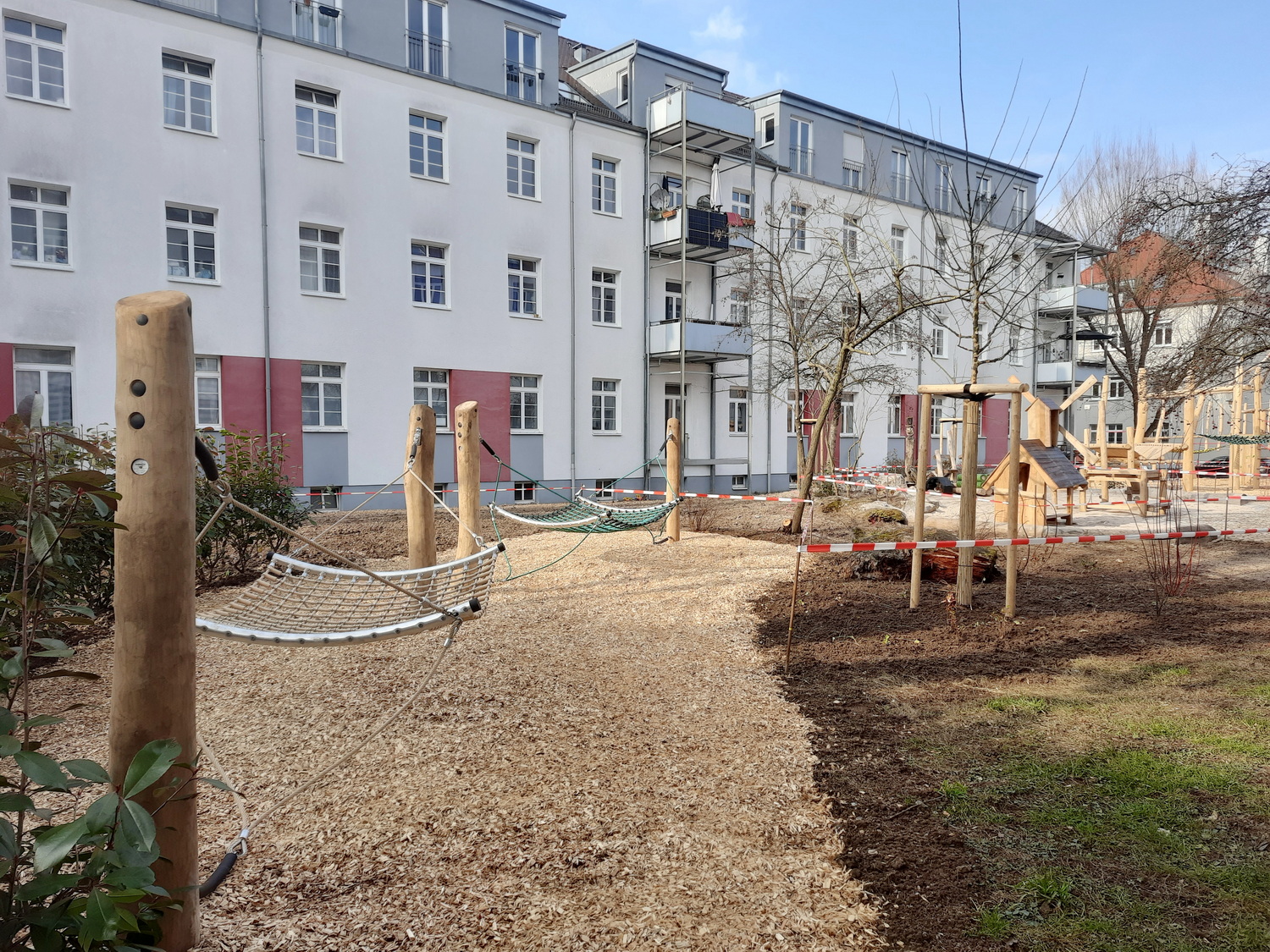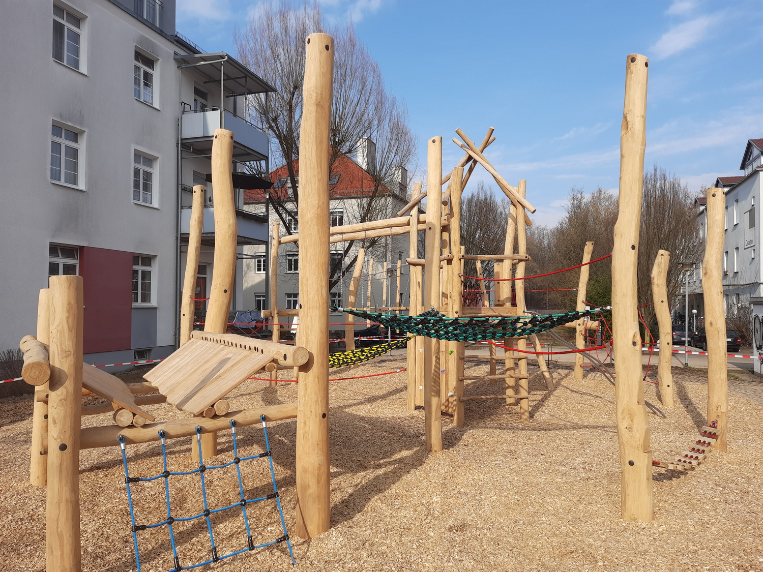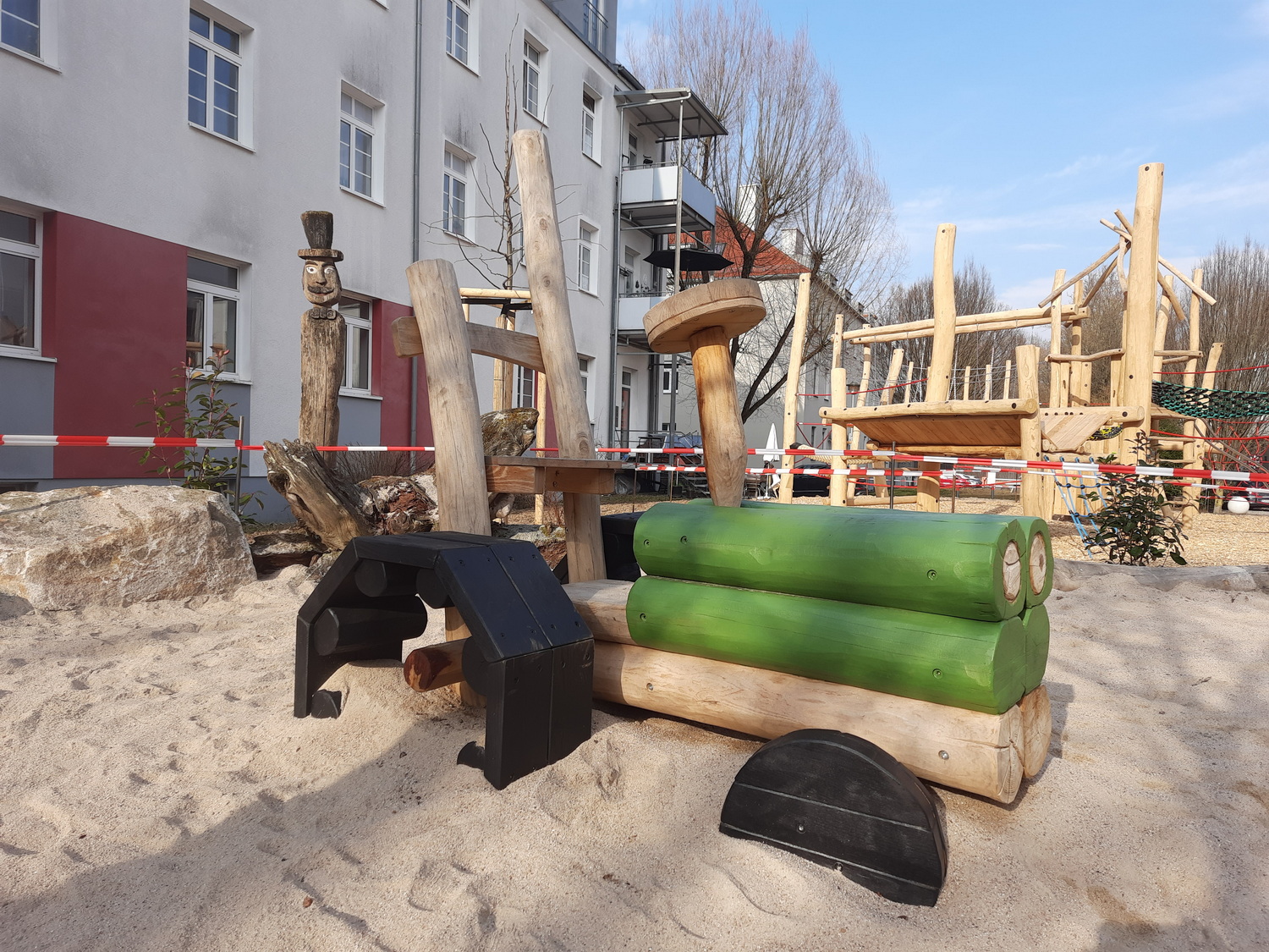 Der Spielplatz bietet spannende Herausforderungen für verschiedene Altersstufen: Im großen Sandkasten des Kleinkindbereichs locken ein Holz-Traktor, ein Spielhaus, ein Sandspieltisch und eine Wippe im Kleinformat. Nebenan bietet ein individuell zusammengestelltes Kombi-Spielgerät abwechslungsreiche Kletter- und Balancierherausforderungen. Hackschnitzel als Fallschutz sorgen dabei für Sicherheit. Gerundete Pflastersteine ermöglichen eine geschwungene Wegeführung. Bei der Gestaltung des Spielplatzes wurde viel Wert auf Details gelegt: Der altehrwürdige „Wächter“ des Spielplatzes, ein hölzerner Herr mit Zylinder, wurde an neuer Stelle wieder eingebaut. Der Sandbereich hat eine abwechslungsreiche Umrandung aus Holzbalken und Felsbrocken erhalten, die zum Balancieren einlädt. Im hinteren, durch Gehölze abgeschirmten Bereich, laden zwei große Hängematten zum Entspannen ein.