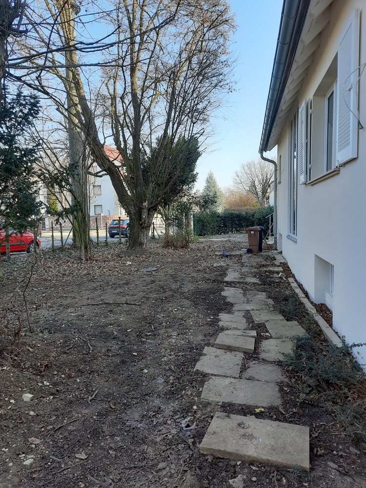 Mitte Februar beginnen unsere Arbeiten im Vorgarten eines renovierten Einfamilienhauses in Metzingen. Dieser Bereich erhält eine neue Wegeführung aus Natursteinpflaster, die geschwungen am Haus entlangführen wird. Im Sommer laden die Aufweitungen des Weges dazu ein, einen kleinen Tisch und Stühle in den Vorgarten zu stellen und den Schatten der großen Bäume zu genießen. Eine neu gepflanzte Hecke wird schon bald für Privatsphäre sorgen.