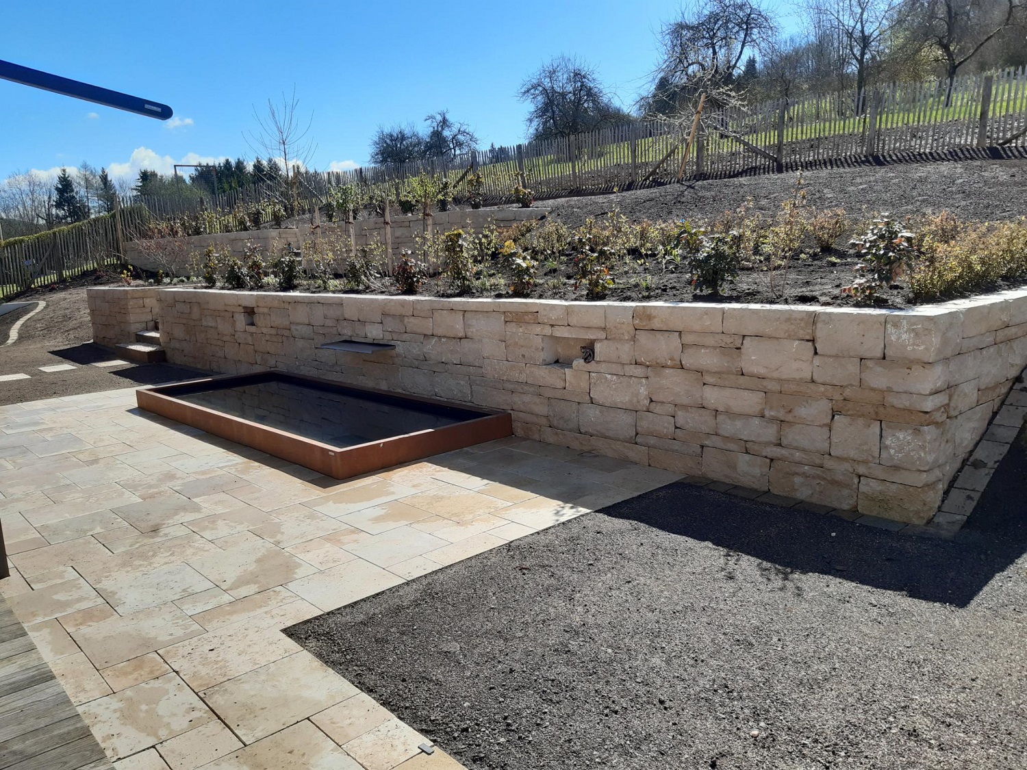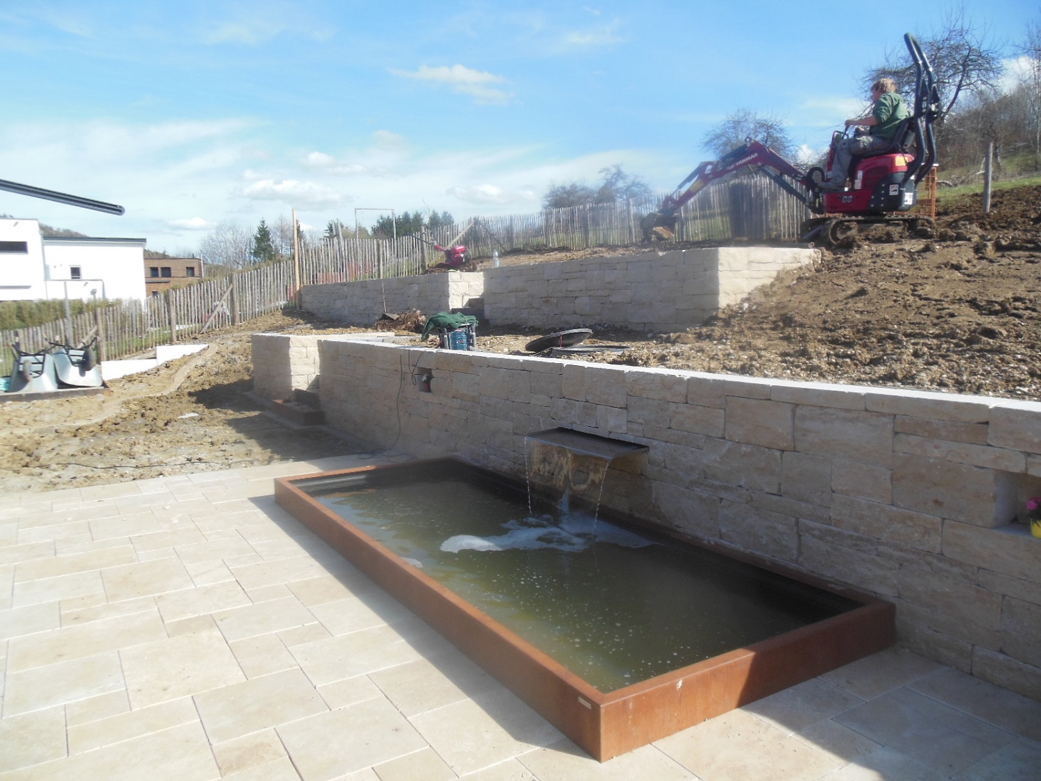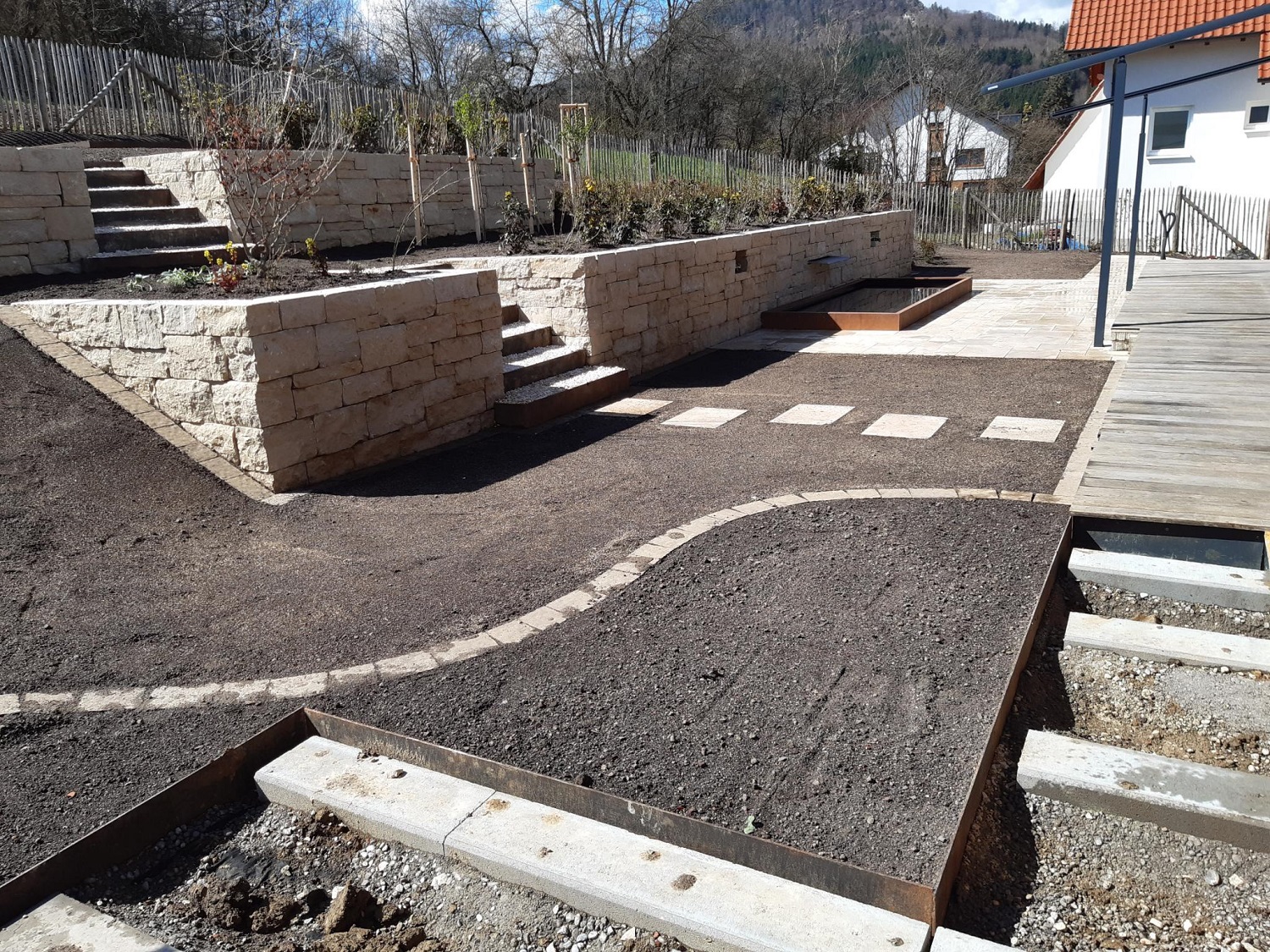Auch in Albstadt gehen die Arbeiten voran. Der Hang hinter dem Haus wurde mit Natursteinmauern terrassiert und an seinem Fuß ein Wasserbecken installiert. Anschließend wurden die neu gestalteten Flächen bepflanzt. Bis zum Frühsommer sollen die Zimmereiarbeiten (Fertigstellung der Holzterrasse und eines Holzdecks oben am Hang, Stellung von Sichtschutzwänden sowie der Bau eines Holzlager-/Geräteschuppens) abgeschlossen sein.