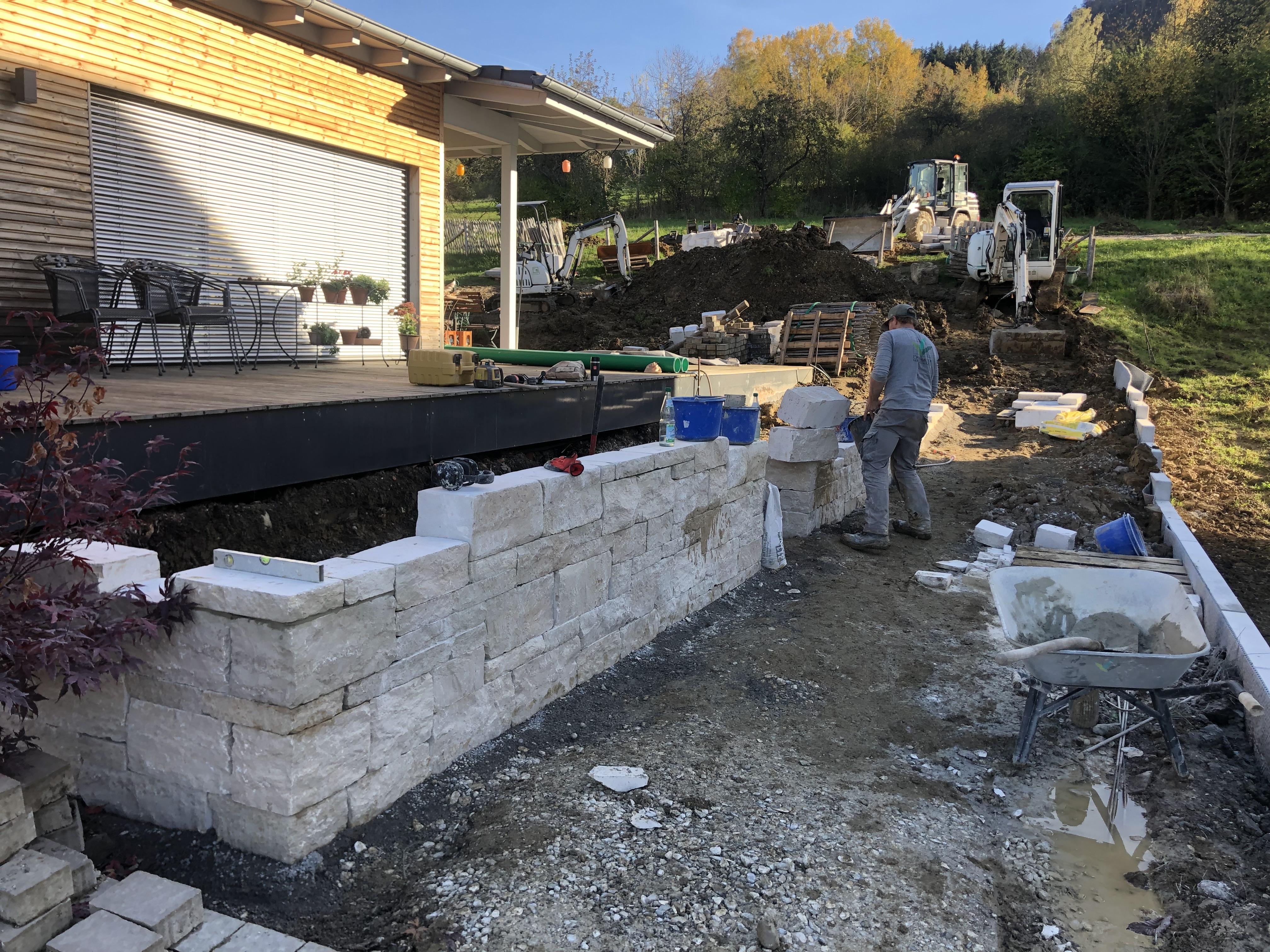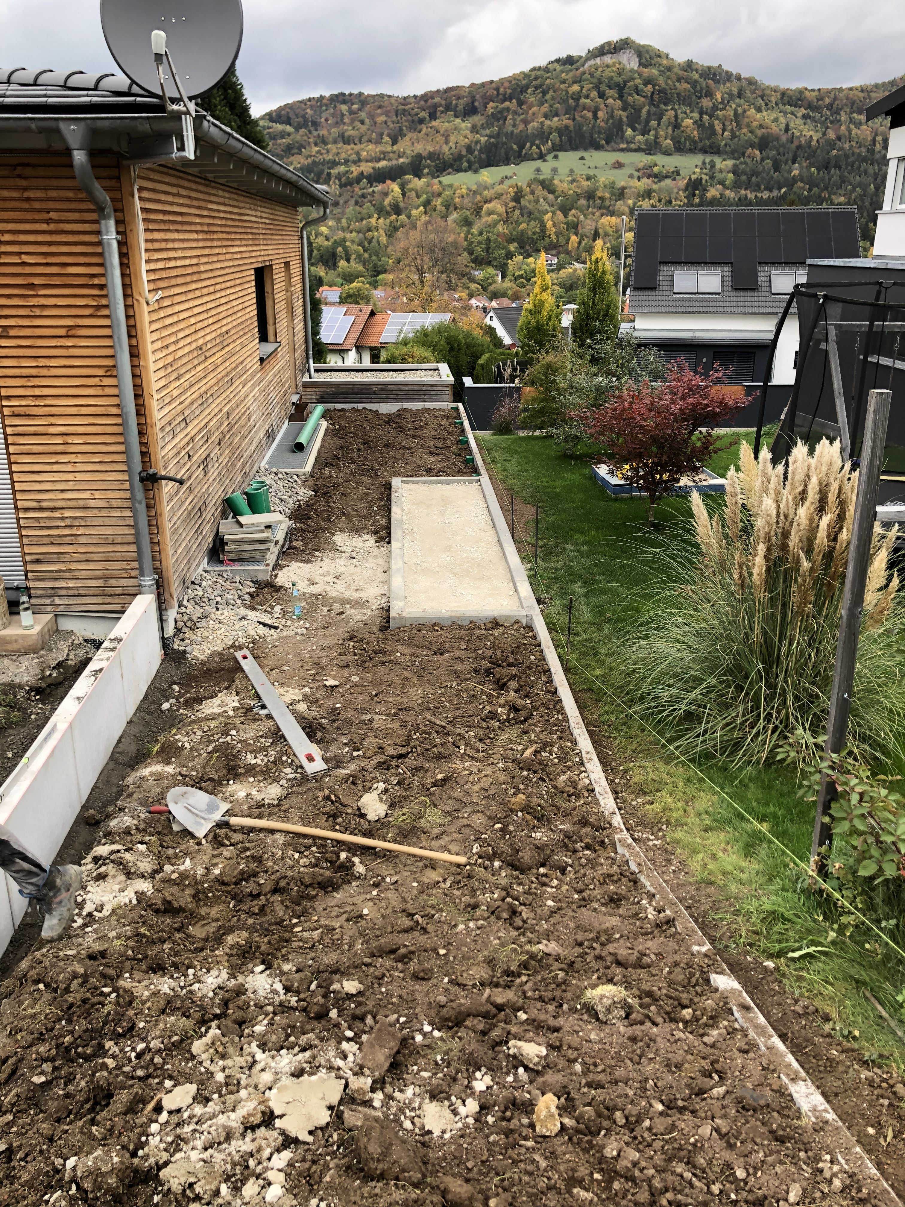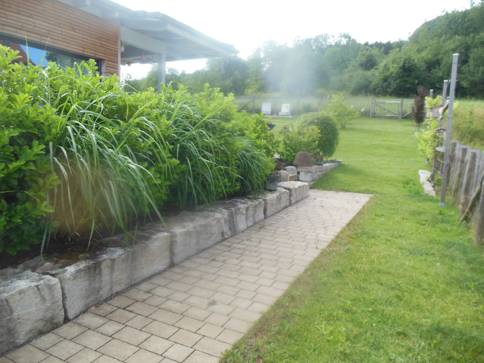 In Albstadt-Laufen gestalten wir aktuell einen großen Hausgarten um. Lediglich der Bereich vor dem nach Norden ausgerichteten Hauseingang bleibt unverändert. An der Ostseite des Hauses haben wir im Herbst einen neuen Plattenbelag verlegt. Auf der Westseite wurden die Rabatten vor der Holzterrasse verbreitert und werden nun durch eine neue, höhere Mauer aus Natursteinen begrenzt. Aktuell gestalten wir den Hang hinter dem Haus um.