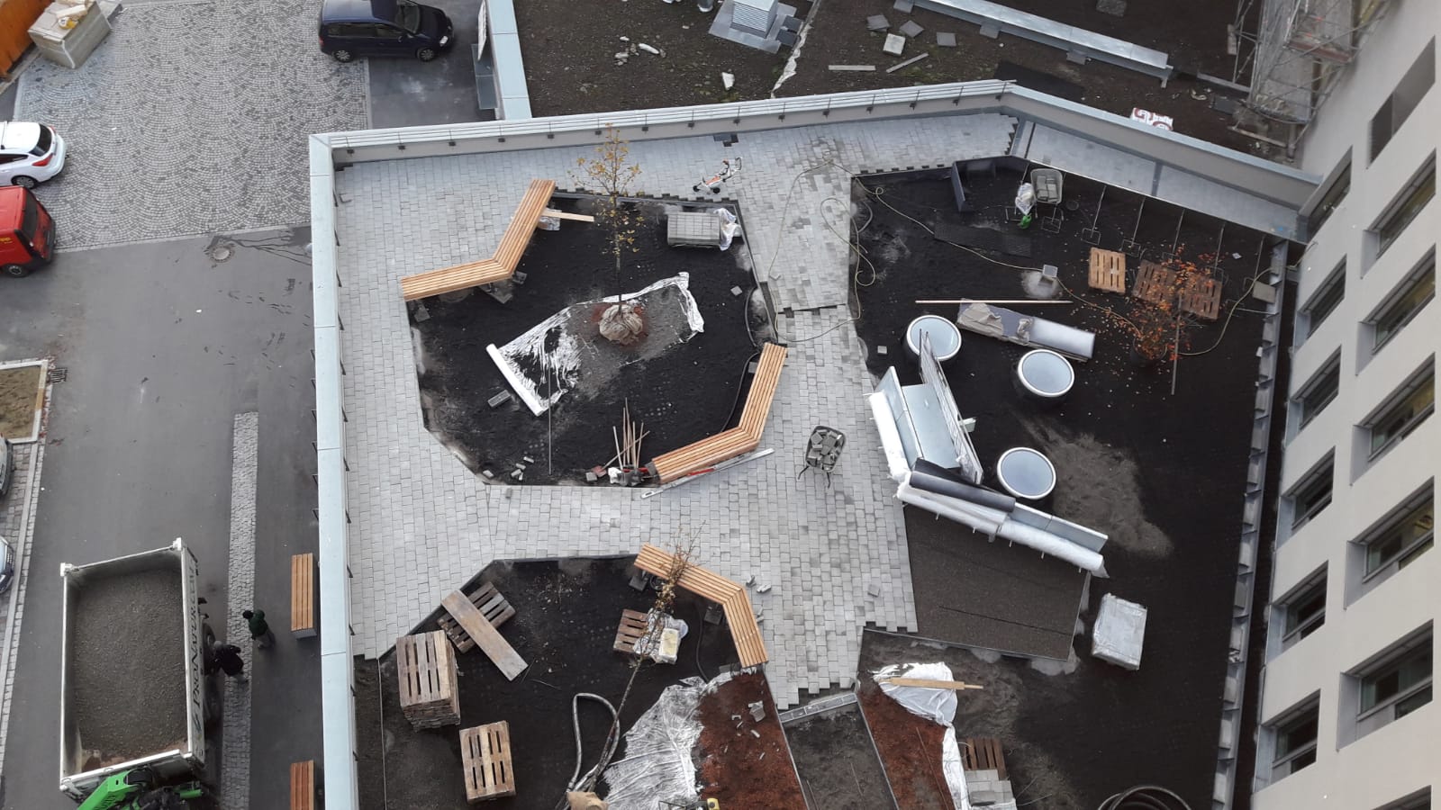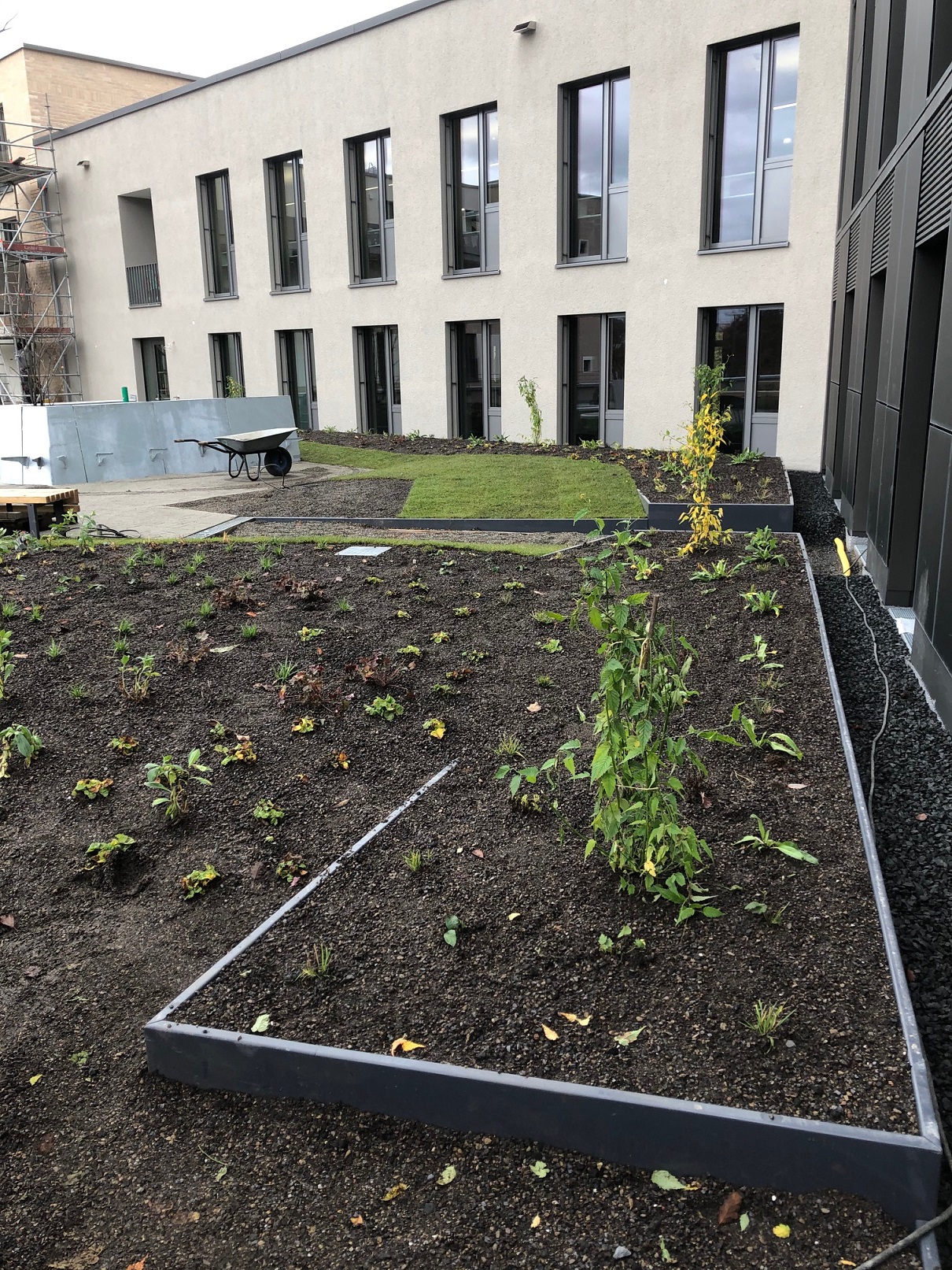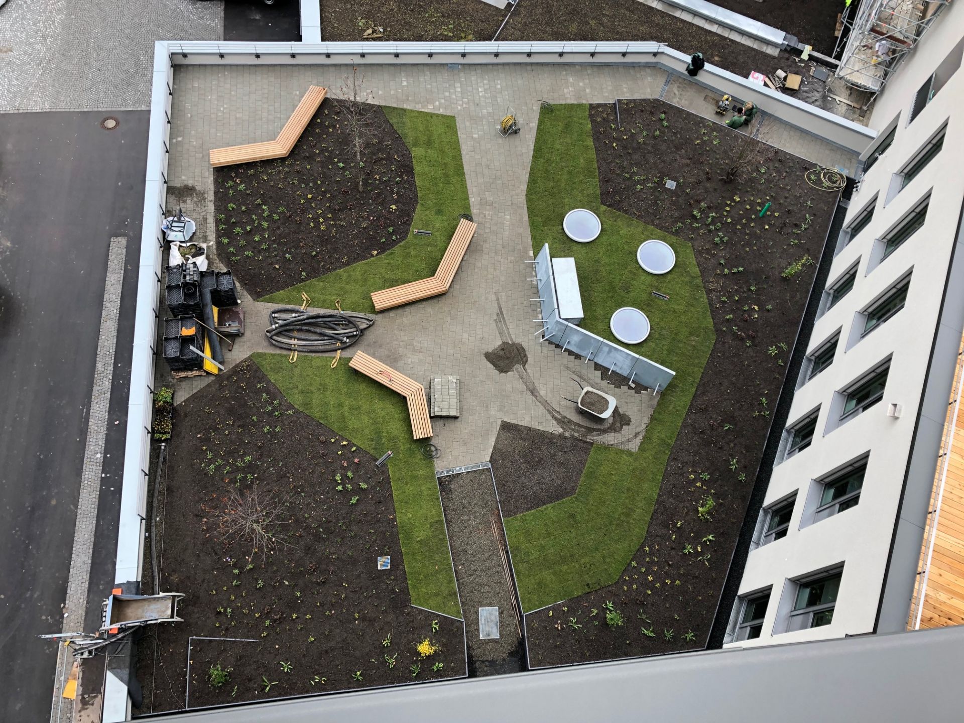 Nachdem wir im Quartier ‚Güterbahnhof’ in Tübingen bereits die Außenanlage im Hof 6 komplett auf einem Bauwerk mit Bitumenabdichtung erstellt haben, geht es nun etwas höher hinauf. Am letzten Gebäude des Areals, der Westspitze, haben wir alle Dachflächen extensiv begrünt und im ersten OG eine Begegnungsfläche mit Intensivbegrünung nach bauseitiger Planvorgabe erstellt. Wir freuen uns, die Fertigstellung noch vor dem Winter realisiert zu haben und sind uns sicher, dass wir für die Nutzer des Gebäudes einen wertvollen Aufenthaltsraum im Freien geschaffen haben.