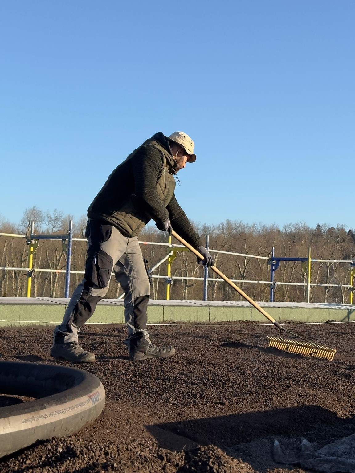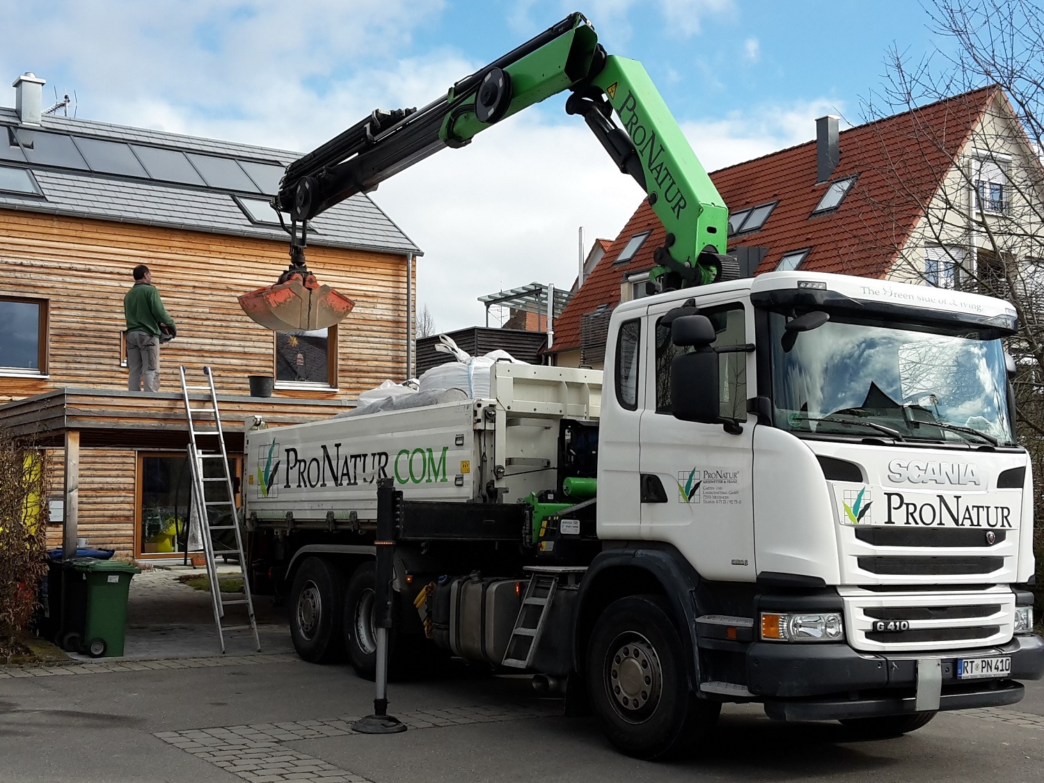 Bei kleinen Dachflächen wie z.B. Garagen wird das Substrat in Big Bags angeliefert und mit einem unserer zwei Ladekran-LKWs aufs Dach gehoben. Dort verteilen und planieren unsere Mitarbeiter es dann von Hand.