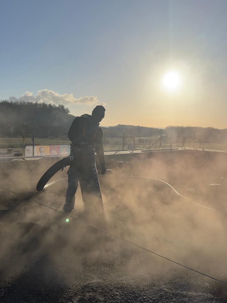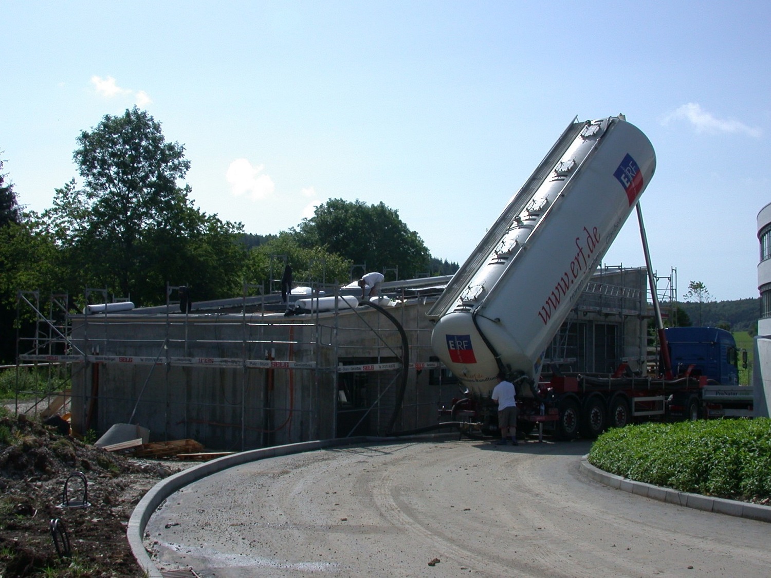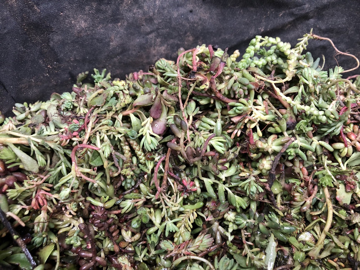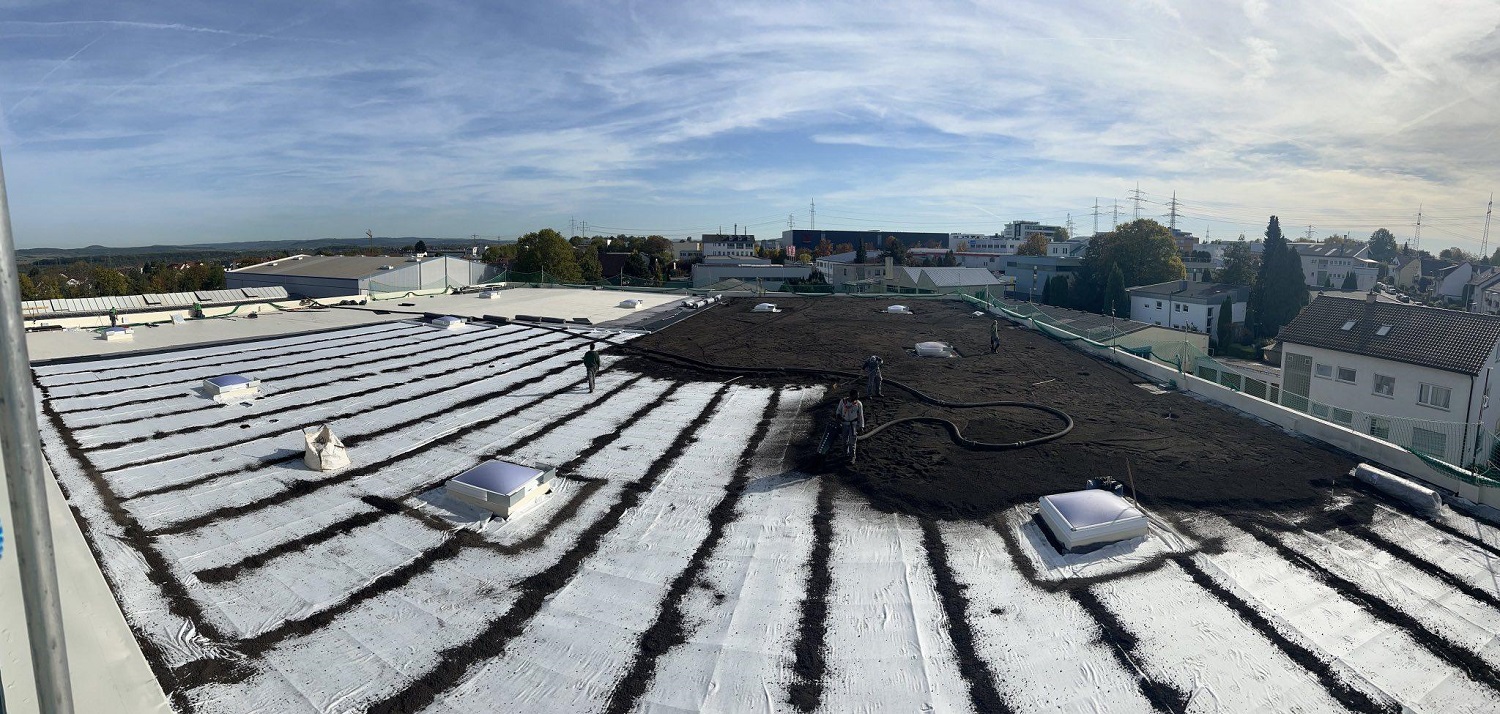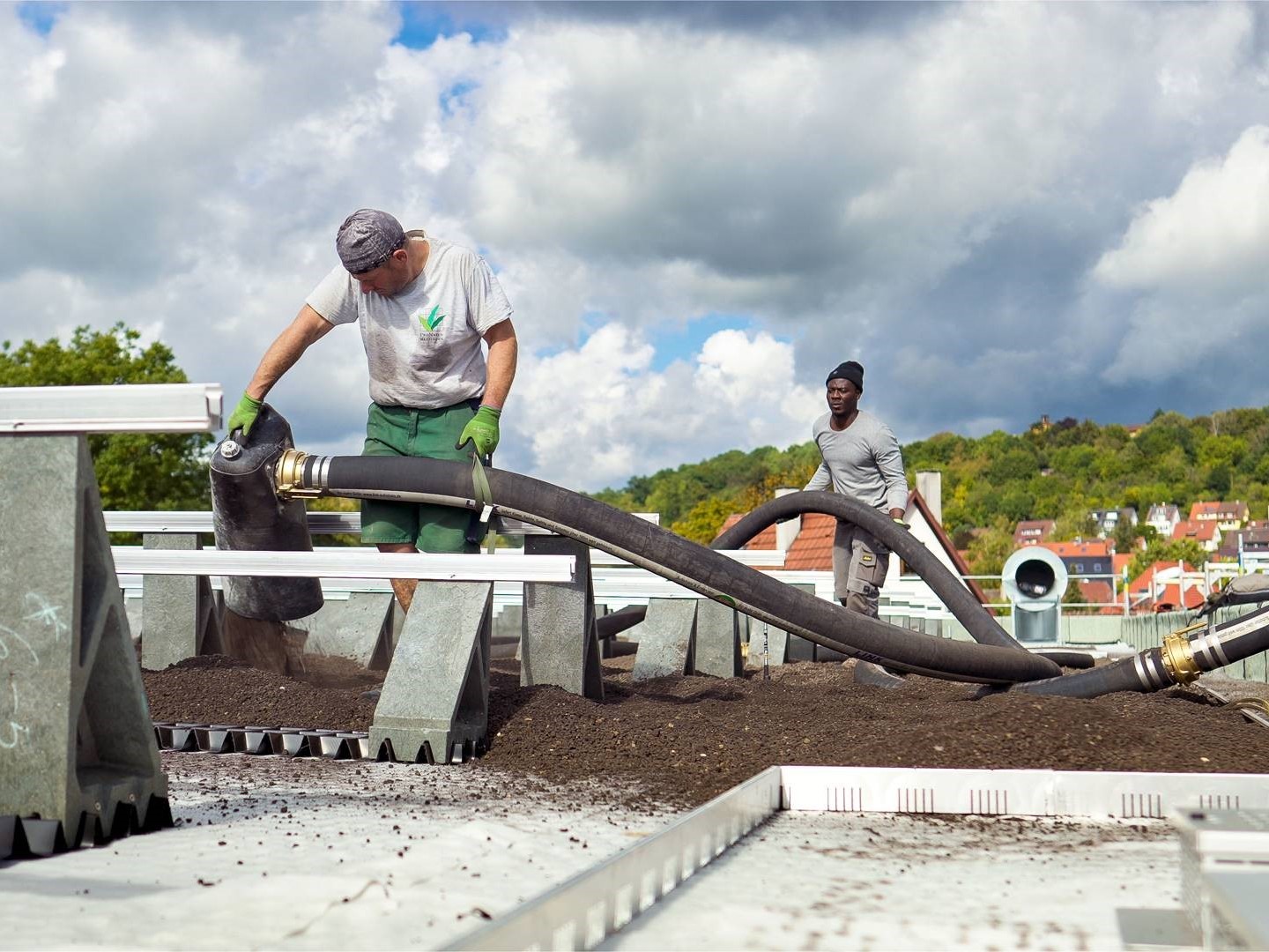 Bei großen Dachflächen, die nicht selten mehrere Tausend Quadratmeter umfassen, geht dies natürlich nicht. Hier wird das Substrat in großen Silofahrzeugen angeliefert. Über eine lange Schlauchleitung wird es dann mittels Luftdruck aufs Dach geblasen und dort über einen Ausblaskopf von unseren Mitarbeitern auf dem Dach verteilt. So sind auch riesige Mengen an Substrat zu bewältigen. Bei einer extensiven Dachbegrünung beträgt die Schichtstärke in der Regel 8 cm. Auf dem Substrat werden anschließend Sedumsprossen verteilt, die in den folgenden Wochen und Monaten Wurzeln bilden und zu Sedumpolstern heranwachsen.